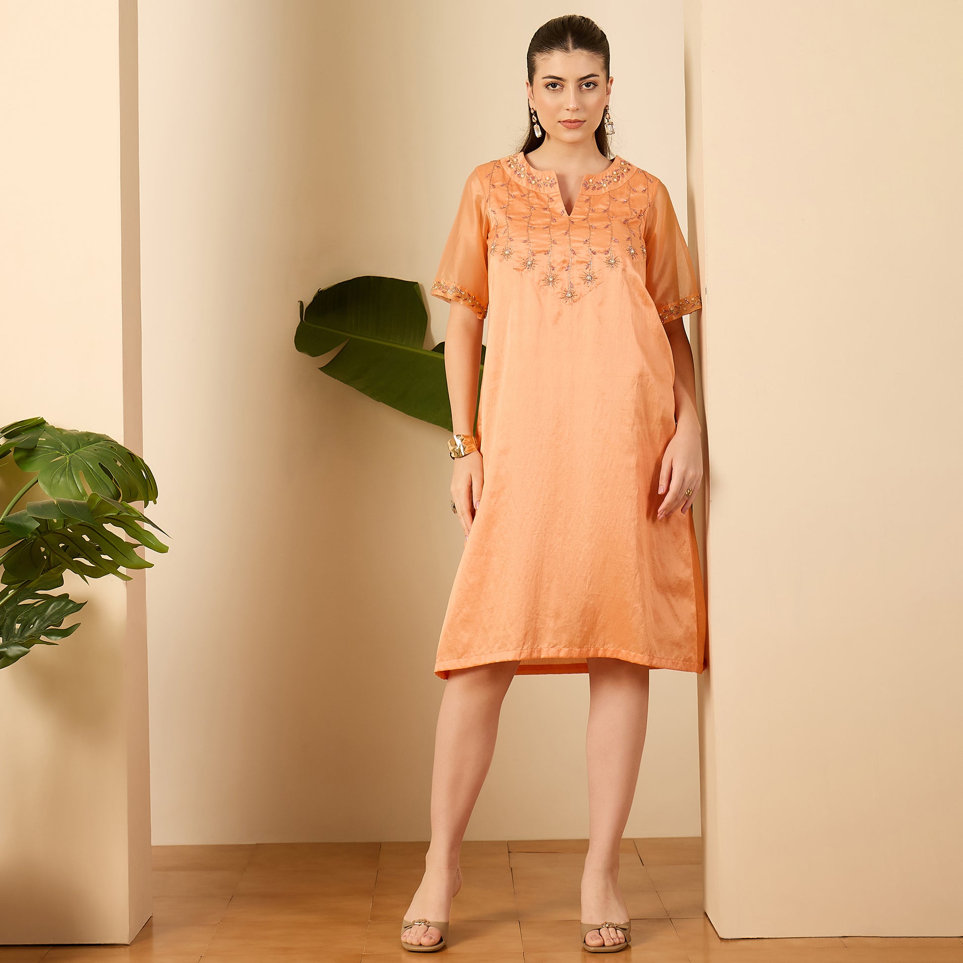 Style Guide Pair this versatile dress with neutral-toned flats or heels to maintain a polished look. Minimal accessories will let the hand embroidery shine, while a structured handbag adds a touch of modern refinement. Ideal for both daytime events and evening affairs, it’s a wardrobe staple with timeless appeal.