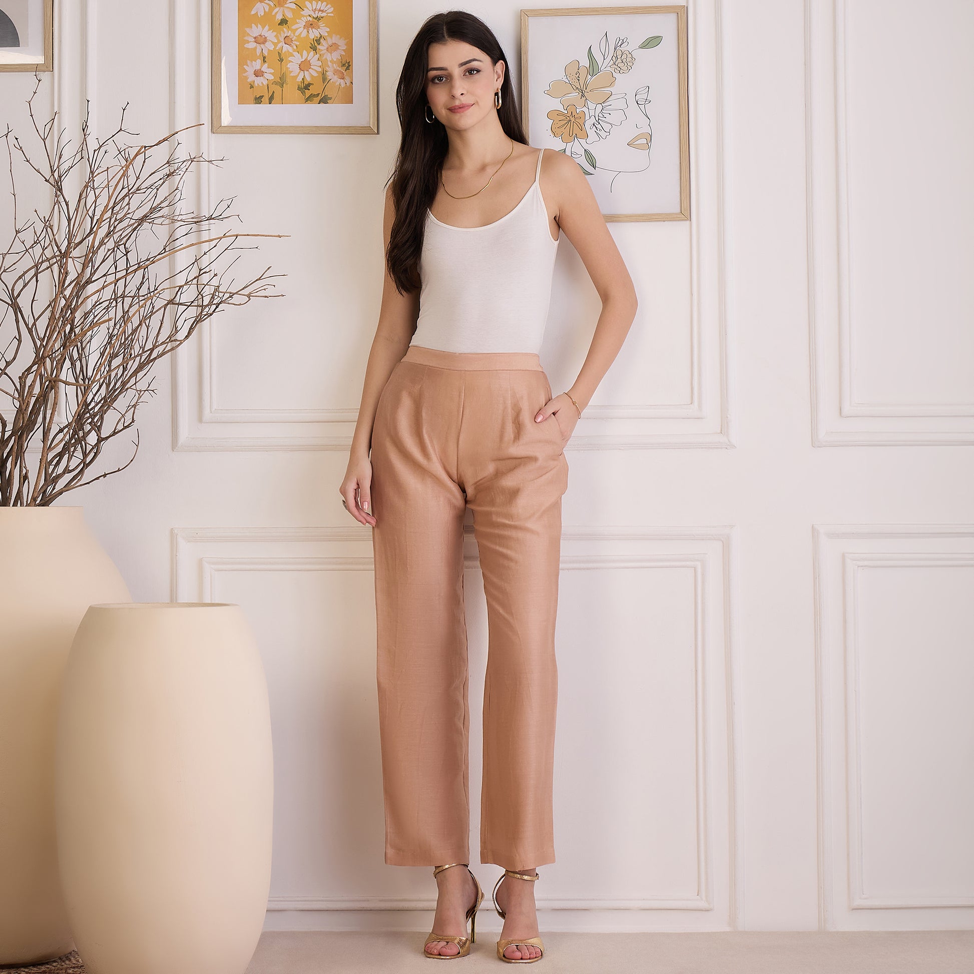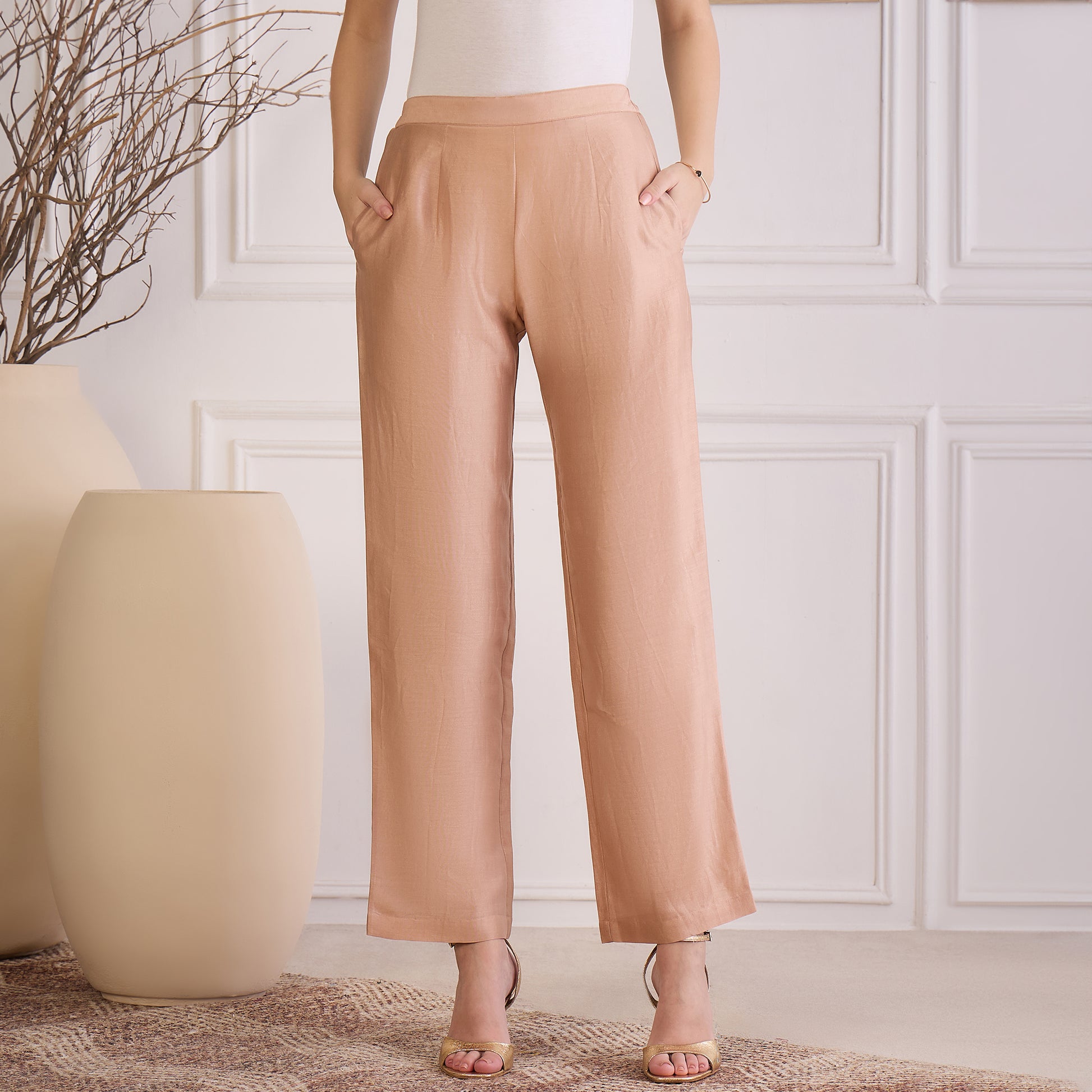 Style Guide Pair these straight pants with a tailored kurta, crisp shirt, or a flowy tunic to create a balanced, polished look. For cooler days, layer with a longline shrug or a structured blazer for added sophistication. Footwear options like block heels, mules, or embellished flats will complement the clean silhouette while keeping it versatile. Keep accessories minimal yet refined—think delicate earrings or a sleek watch to enhance the overall ensemble. Finish with a tote for workdays or a clutch for evenings out, ensuring a look that’s both effortless and elegant.