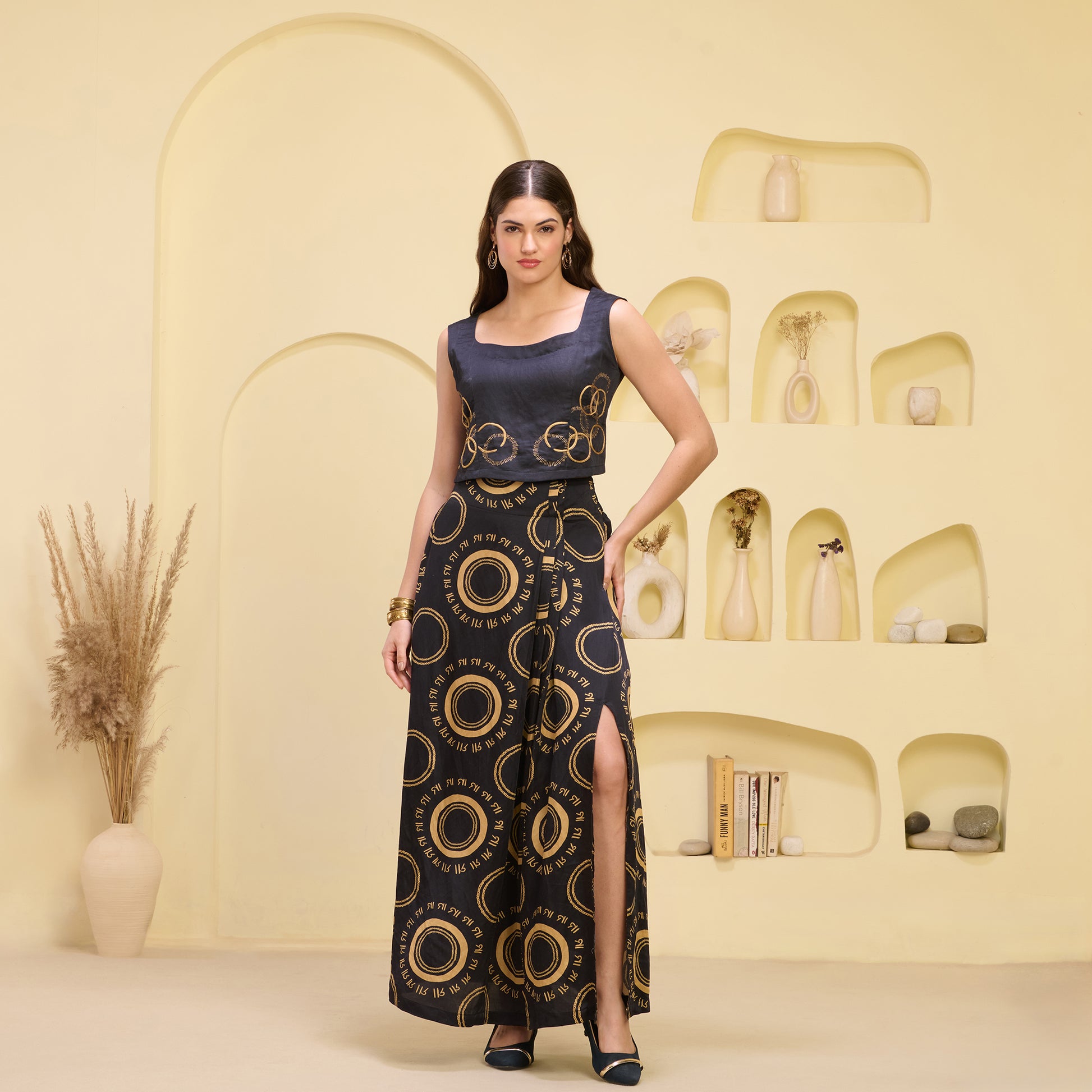 Style Guide Style the hand embroidered crop top and printed full-length skirt with front slit set by pairing it with statement gold or black jewellery, such as a bold necklace or dangling earrings, to complement the intricate embroidery. Opt for strappy heels or classic pumps to enhance the sleek silhouette of the skirt and elongate your figure. A chic clutch or metallic bag can add a touch of sophistication. Keep your hair simple with soft curls or a sleek ponytail to balance the sweetheart neckline. For makeup, go for a dramatic eye and a deep lip colour to match the boldness of the ensemble.