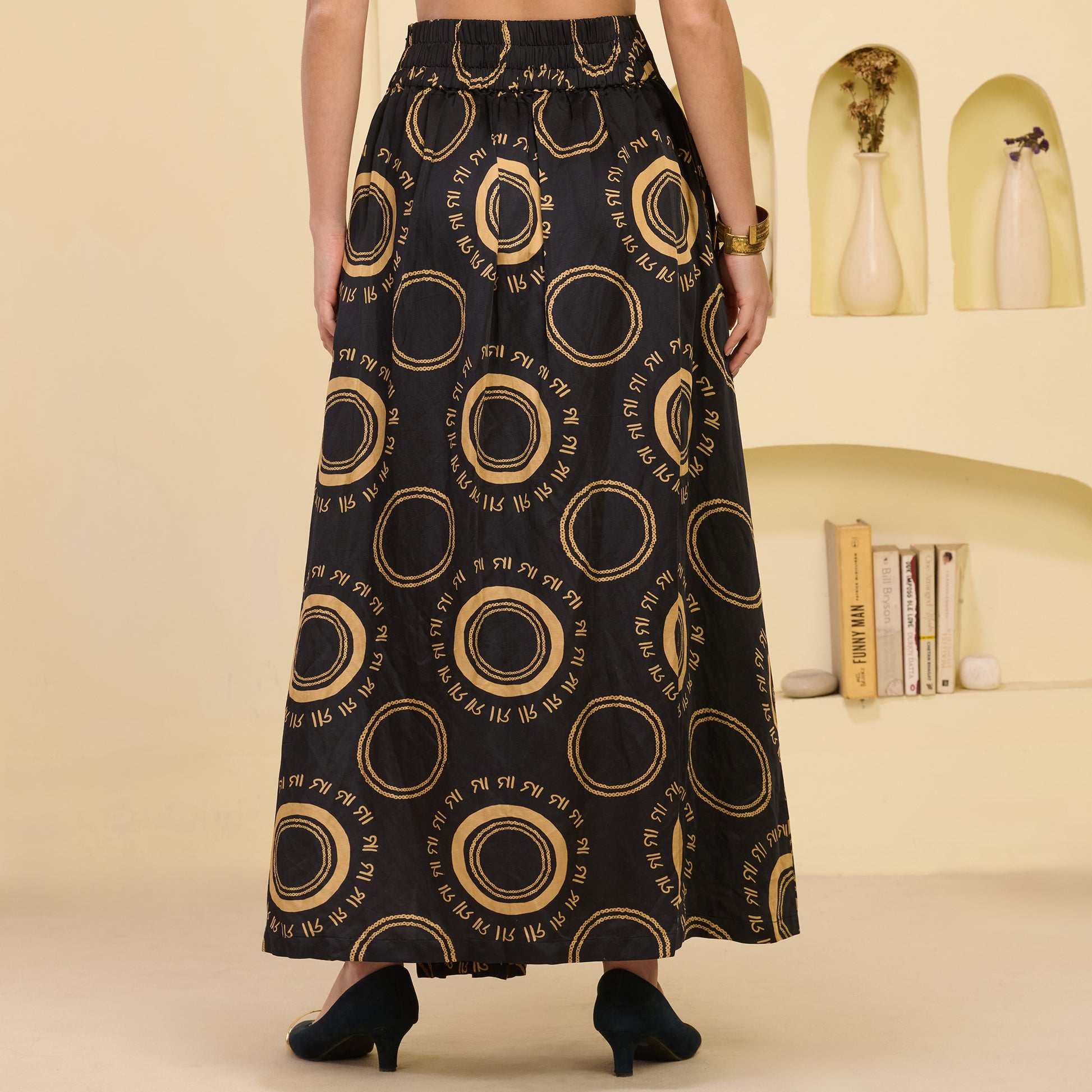 Black and Golden Hand Embroidered Crop Top and Maa Print Full Length Skirt with Front Slit Set