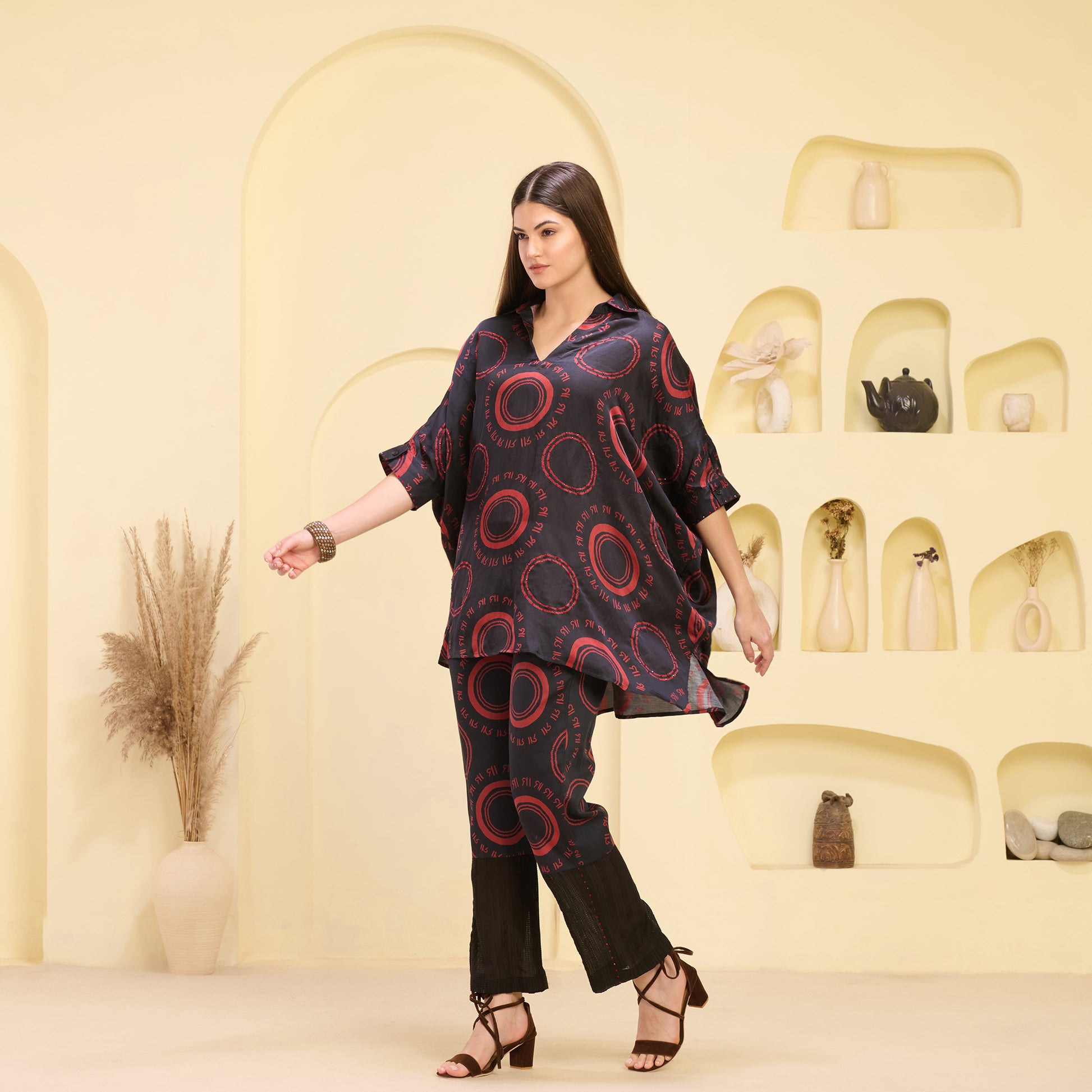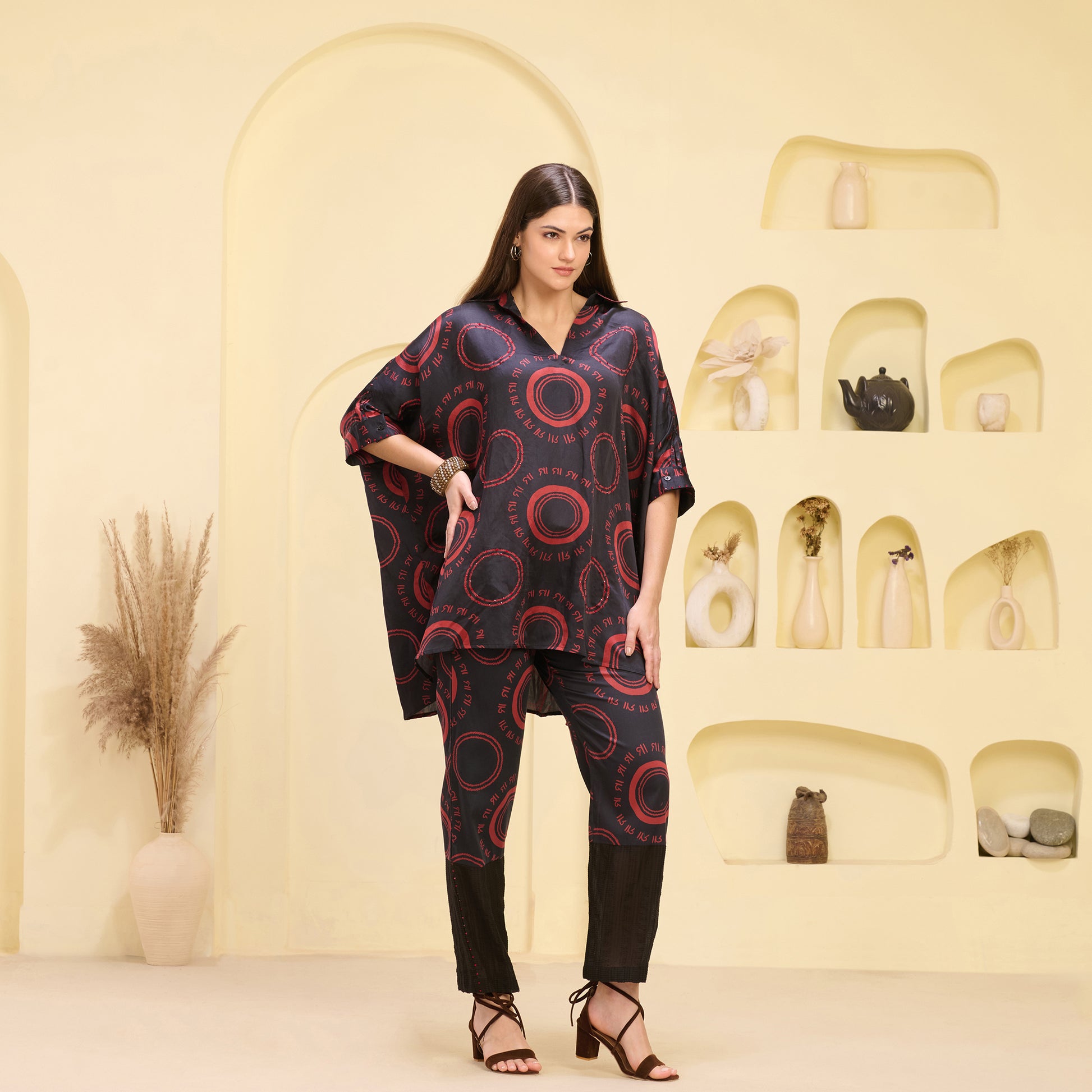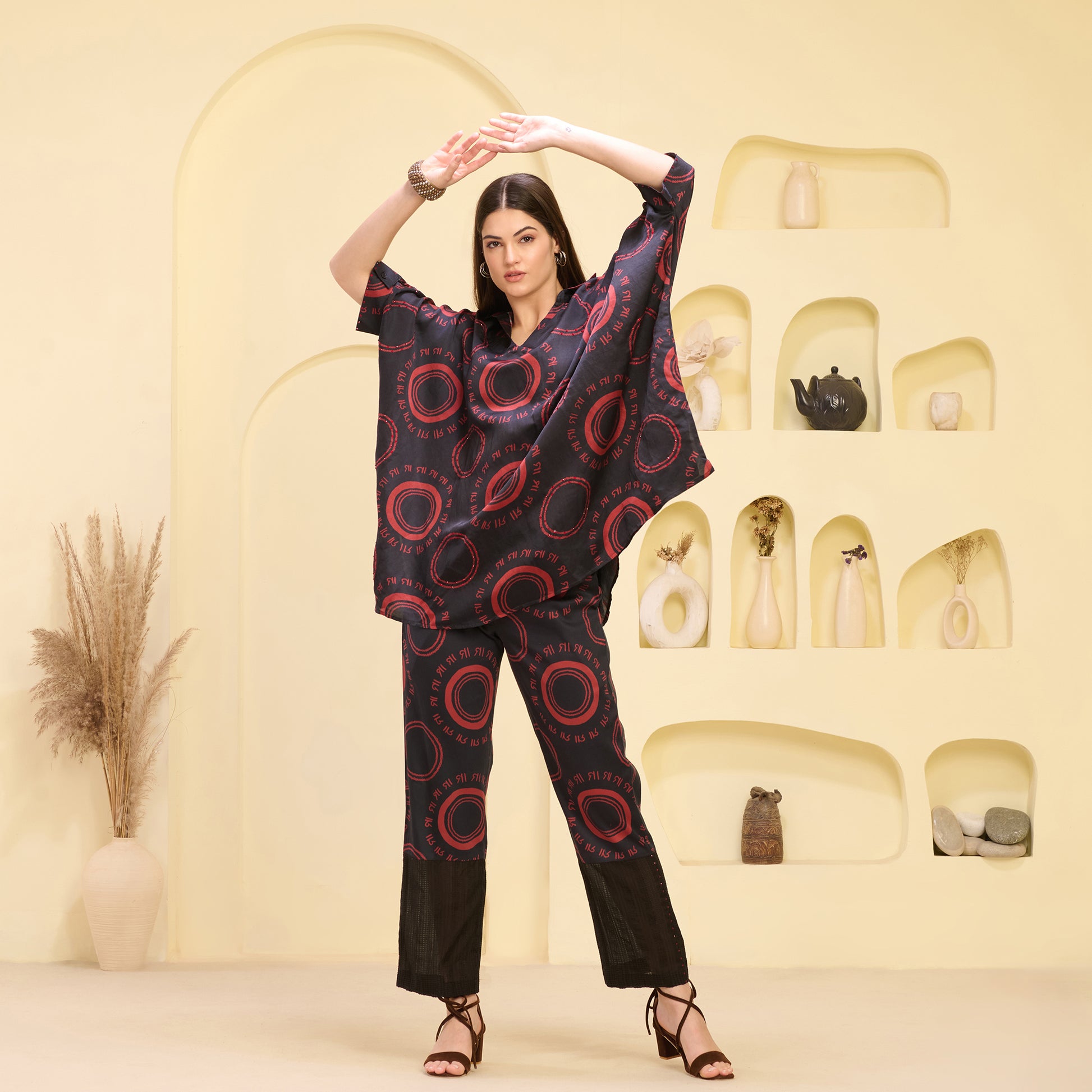 Black and Red Maa Print Embellished Kaftan Top and Straight Trouser Set