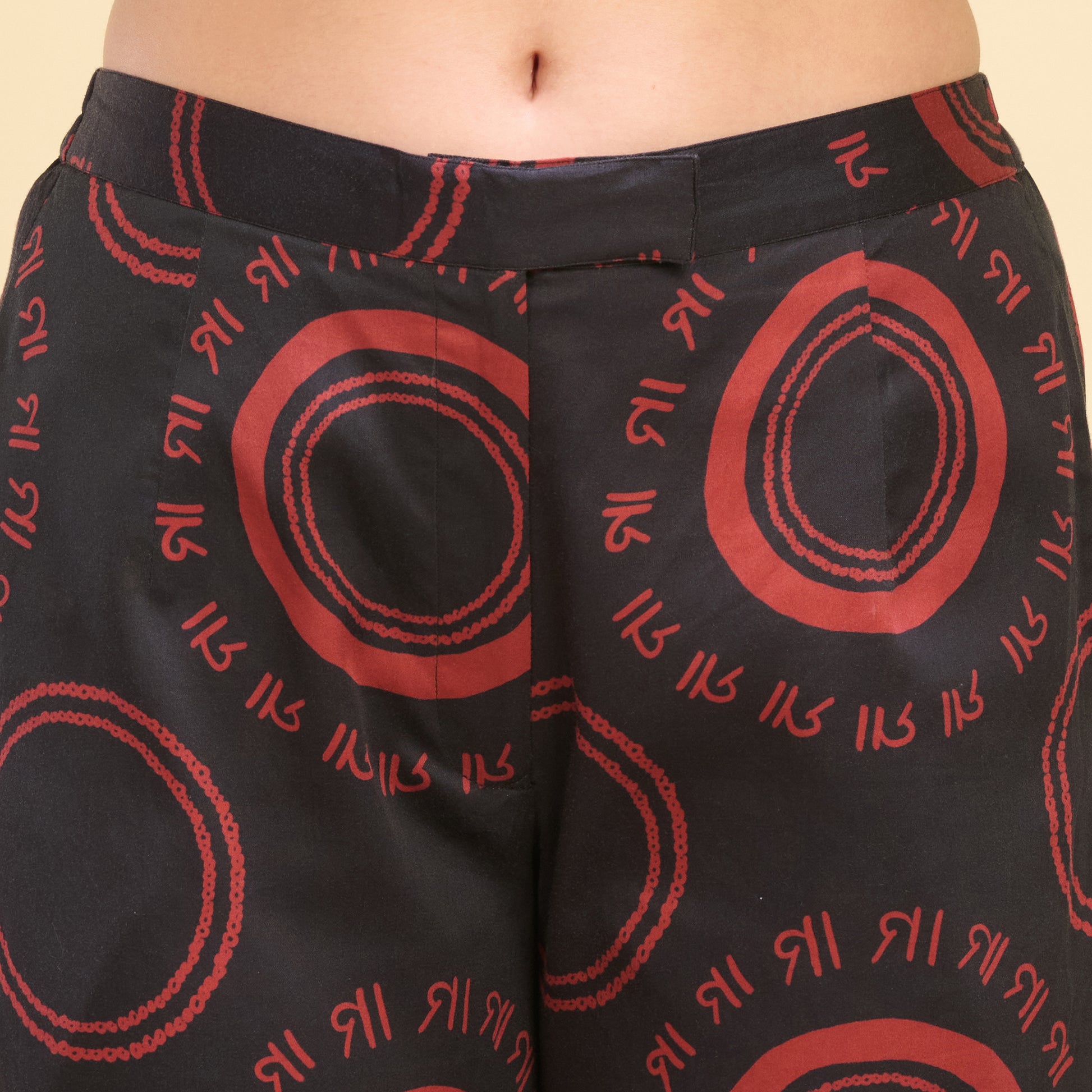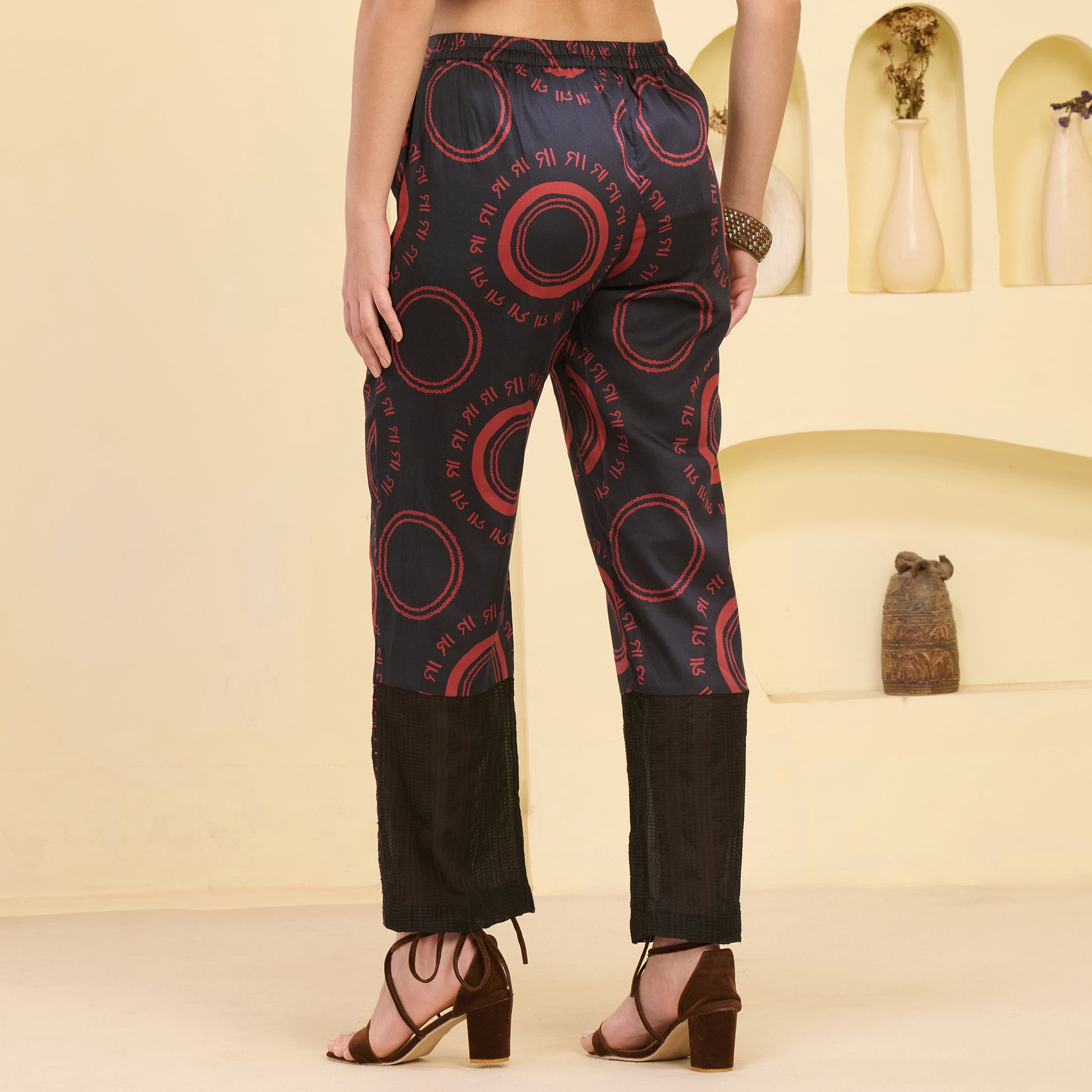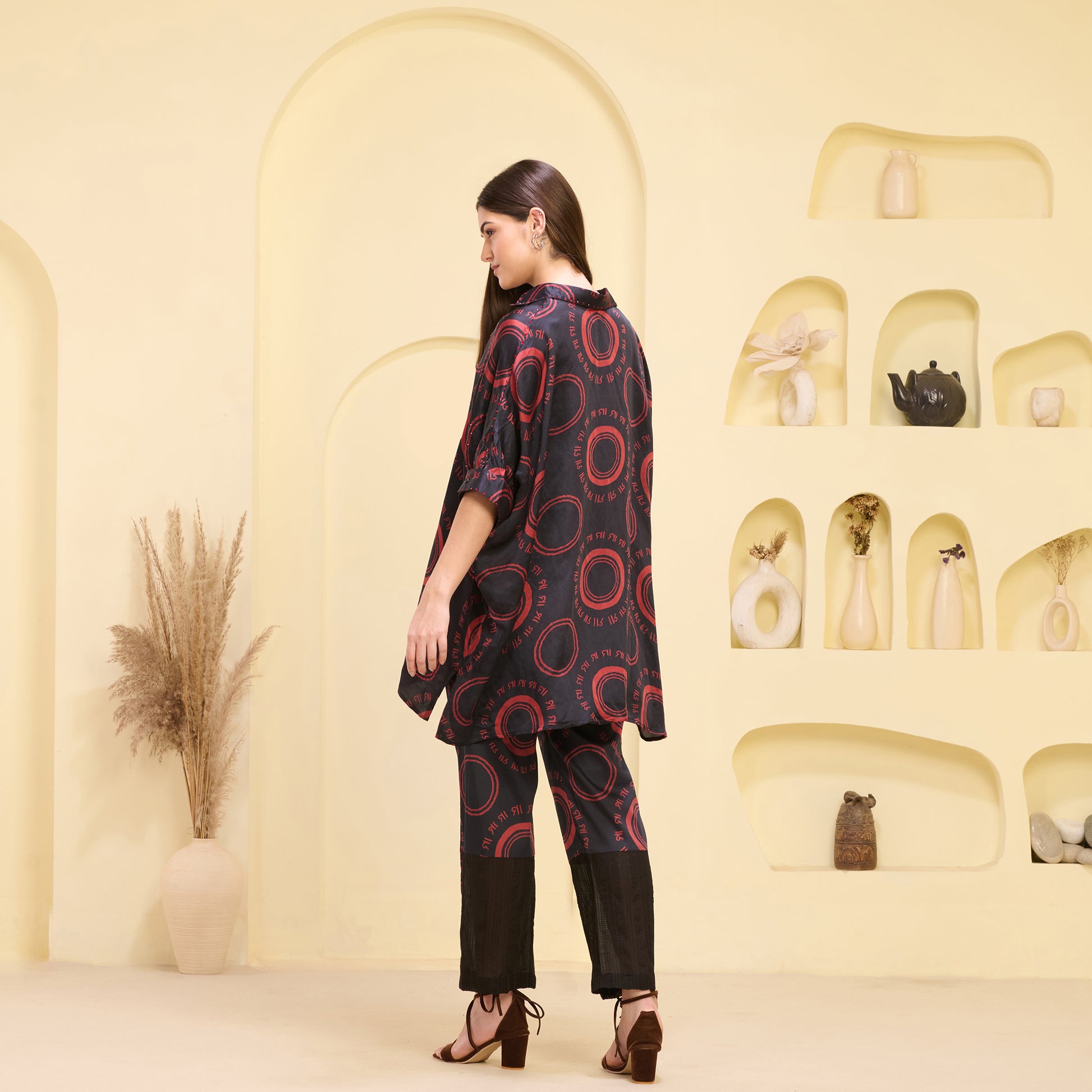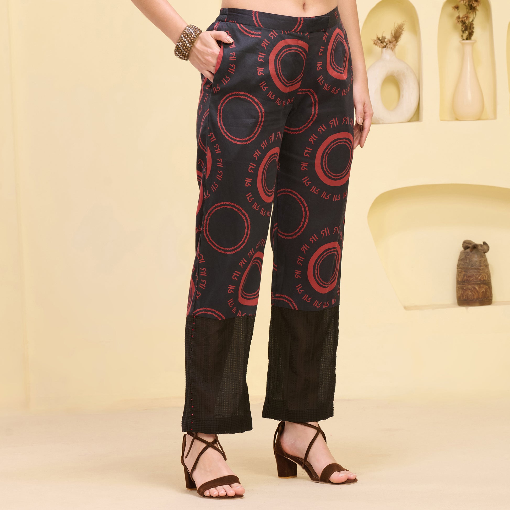Black and Red Maa Print Embellished Kaftan Top and Straight Trouser Set