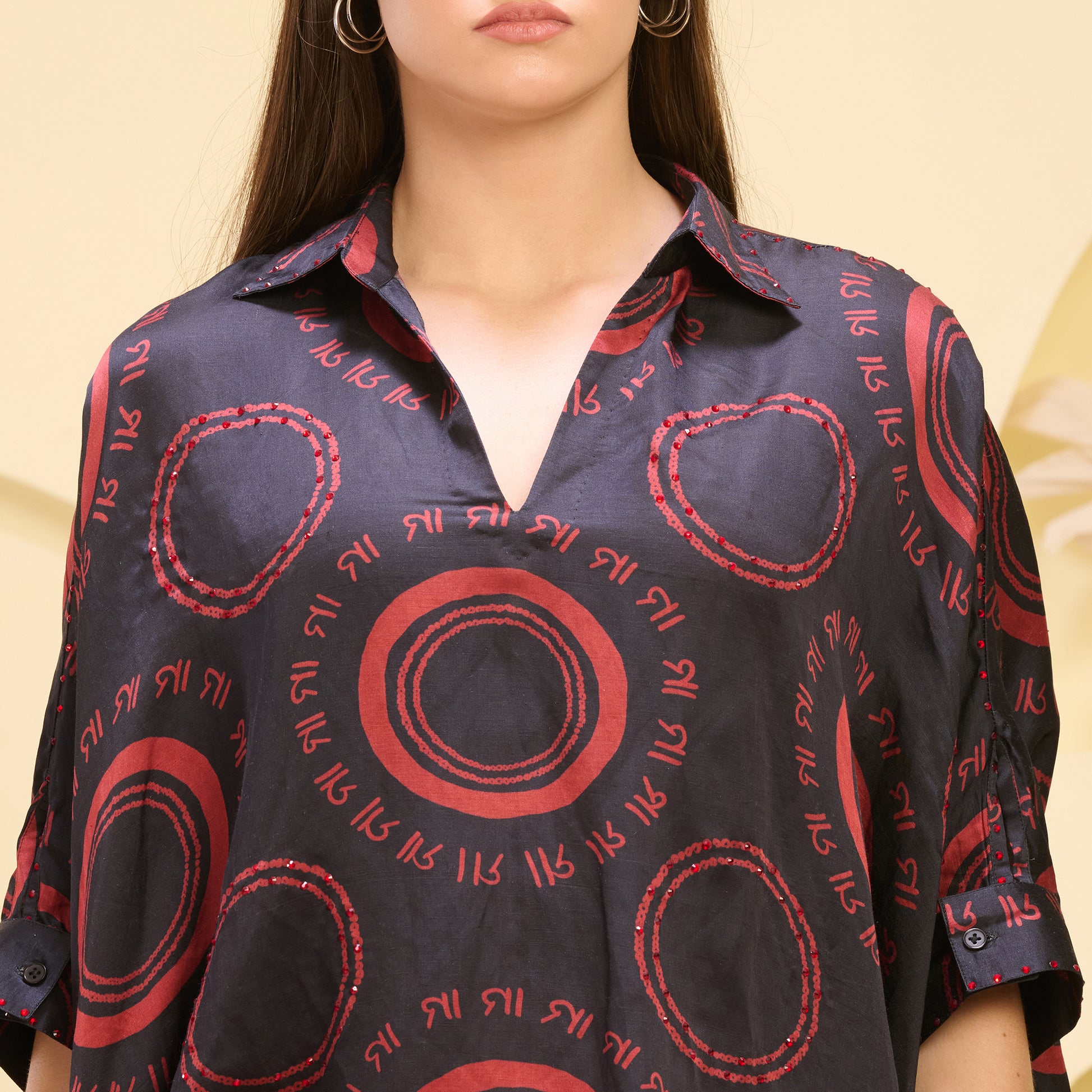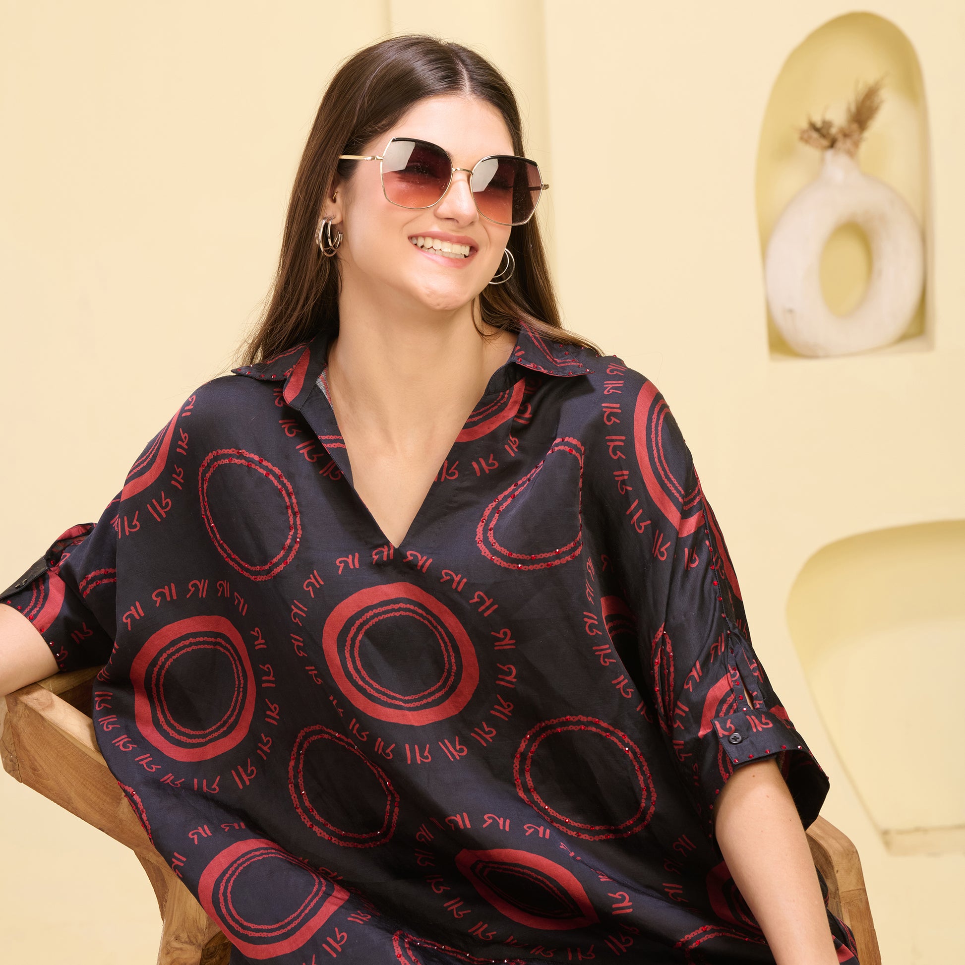 Style Guide Style this printed embellished kaftan top and embellished straight trouser set with bold, yet understated jewellery, like statement crystal earrings or a sleek cuff bracelet, to complement the embellishments. Pair it with metallic sandals or heels to add a touch of glamour while keeping the look balanced. A structured clutch or a metallic bag will further elevate the ensemble. Keep your hair simple with a sleek bun or relaxed waves to allow the embellishments and print to stand out. For makeup, go for a radiant look with a touch of highlighter and a soft nude lip to complete the sophisticated, yet effortless vibe.