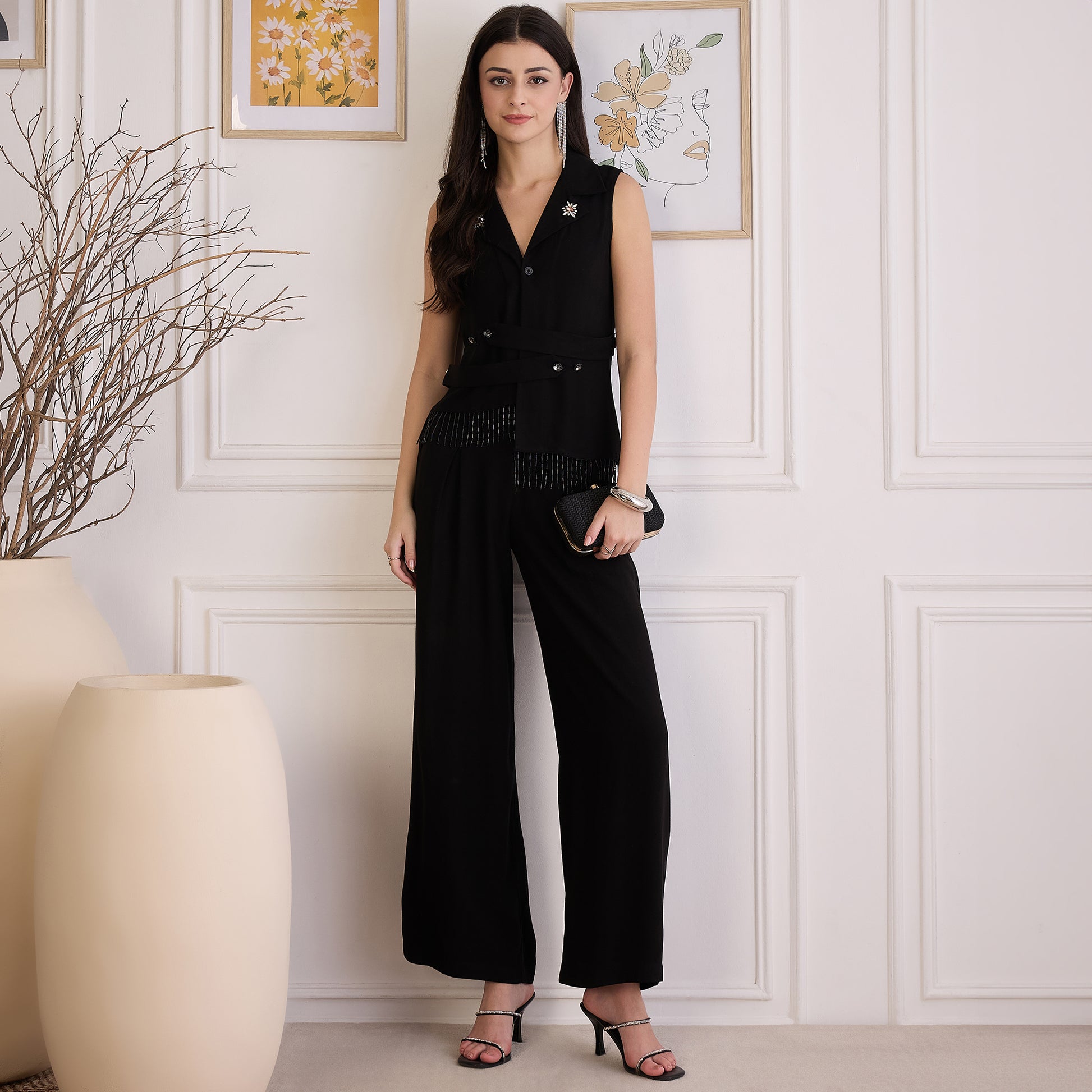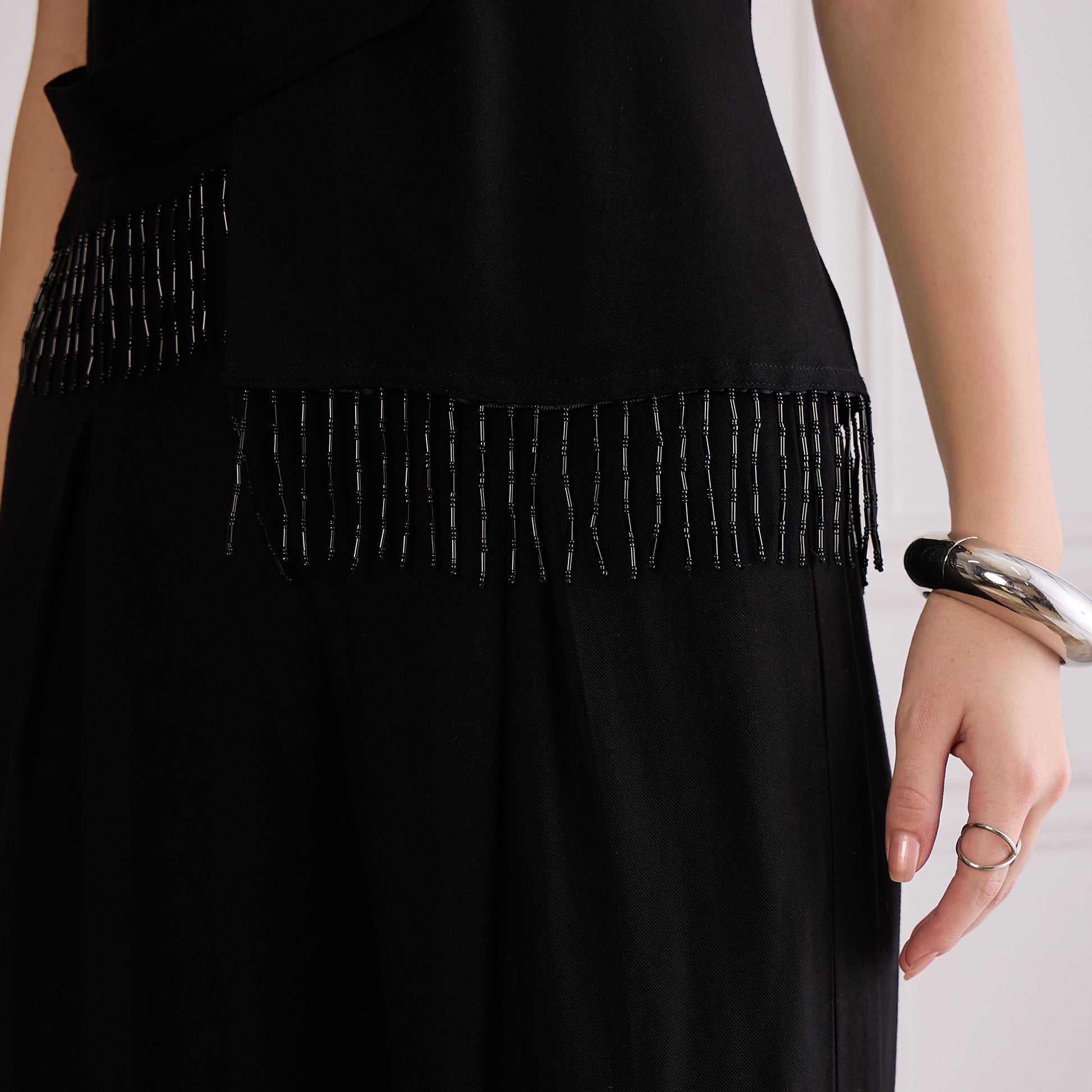 Description Step into modern sophistication with this black asymmetrical top crafted from structured cotton twill. Featuring delicate nalki lace and sparkling crystal embellishments, it beautifully balances edgy design with intricate detailing. The belt cinches the waist for a flattering silhouette, while the asymmetric hem adds a contemporary twist—perfect for making a statement effortlessly.
