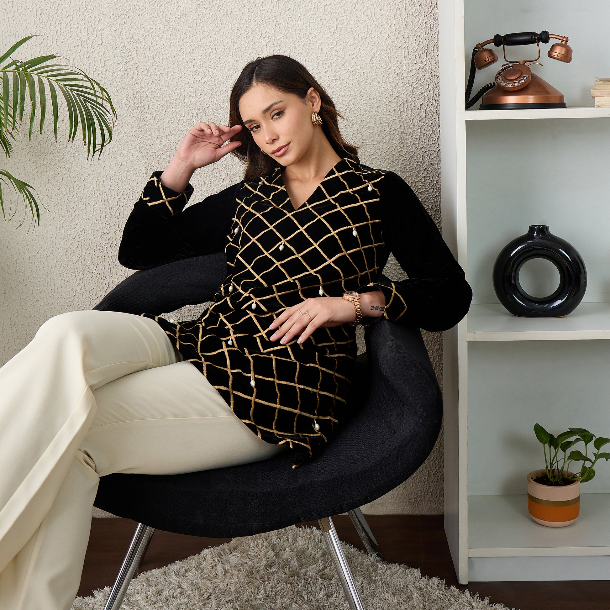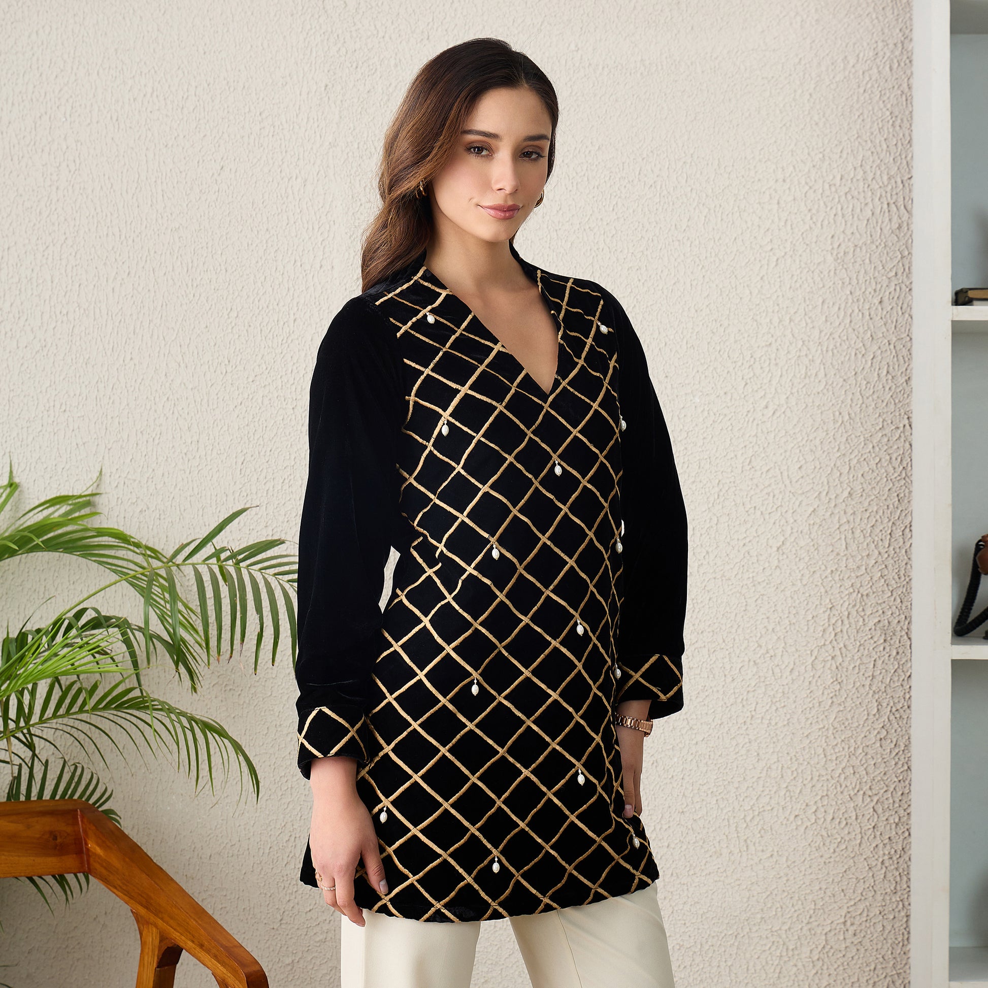 Description This elegant kurta features a refined lattice-inspired embellishment with subtle bead accents for a touch of understated charm. Designed with a notched neckline and full sleeves, it offers a structured yet comfortable silhouette with a graceful drape—perfect for elevated everyday and festive wear.