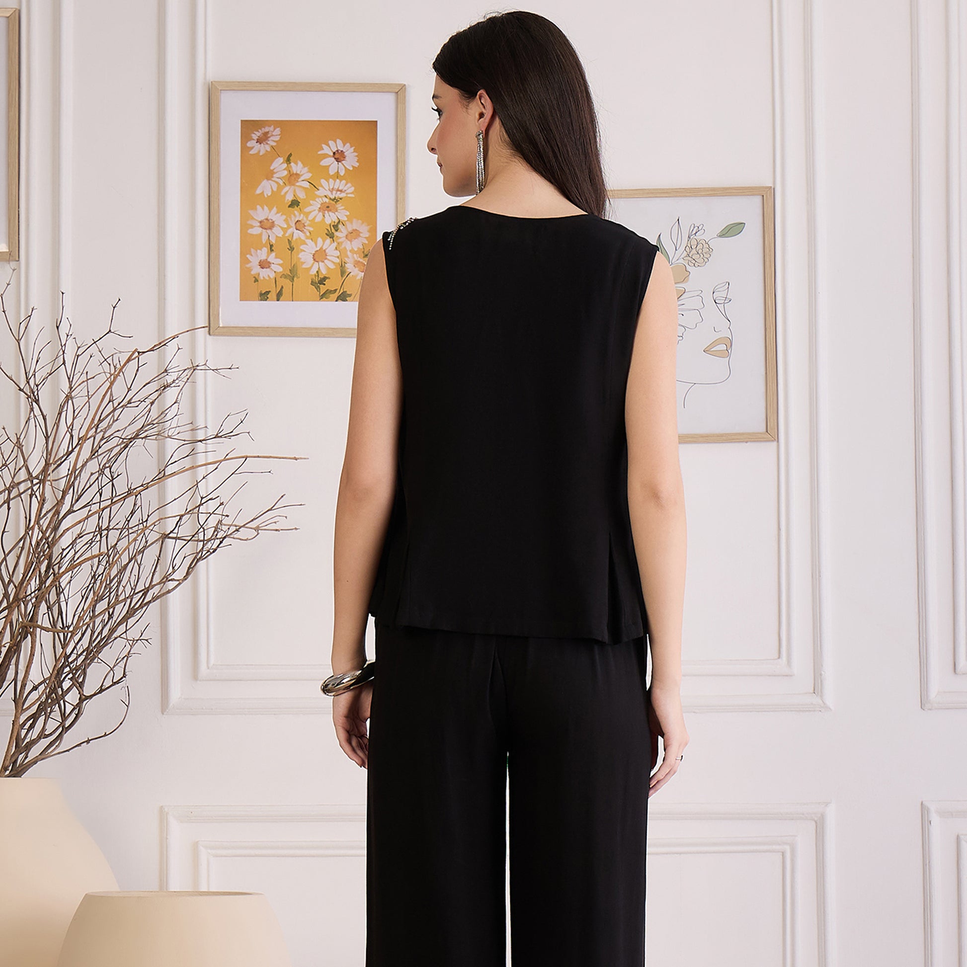 Style Guide Pair this versatile top with tailored pants or a sleek skirt for a polished look. Keep accessories minimal to highlight the shoulder embellishment. Finish with classic heels and a structured bag. Opt for a simple hairstyle like a low bun or straight hair, and natural makeup to keep the focus on the top.