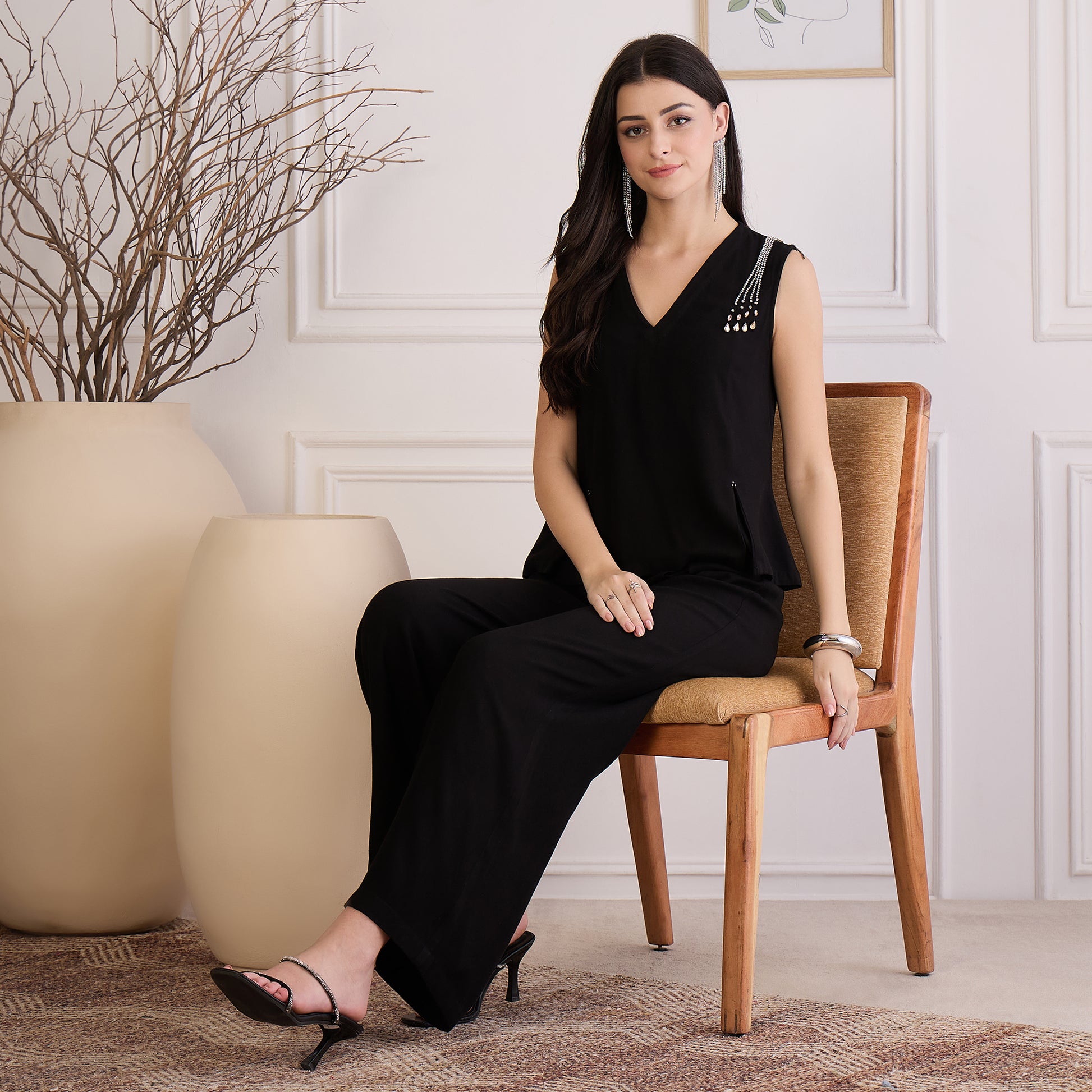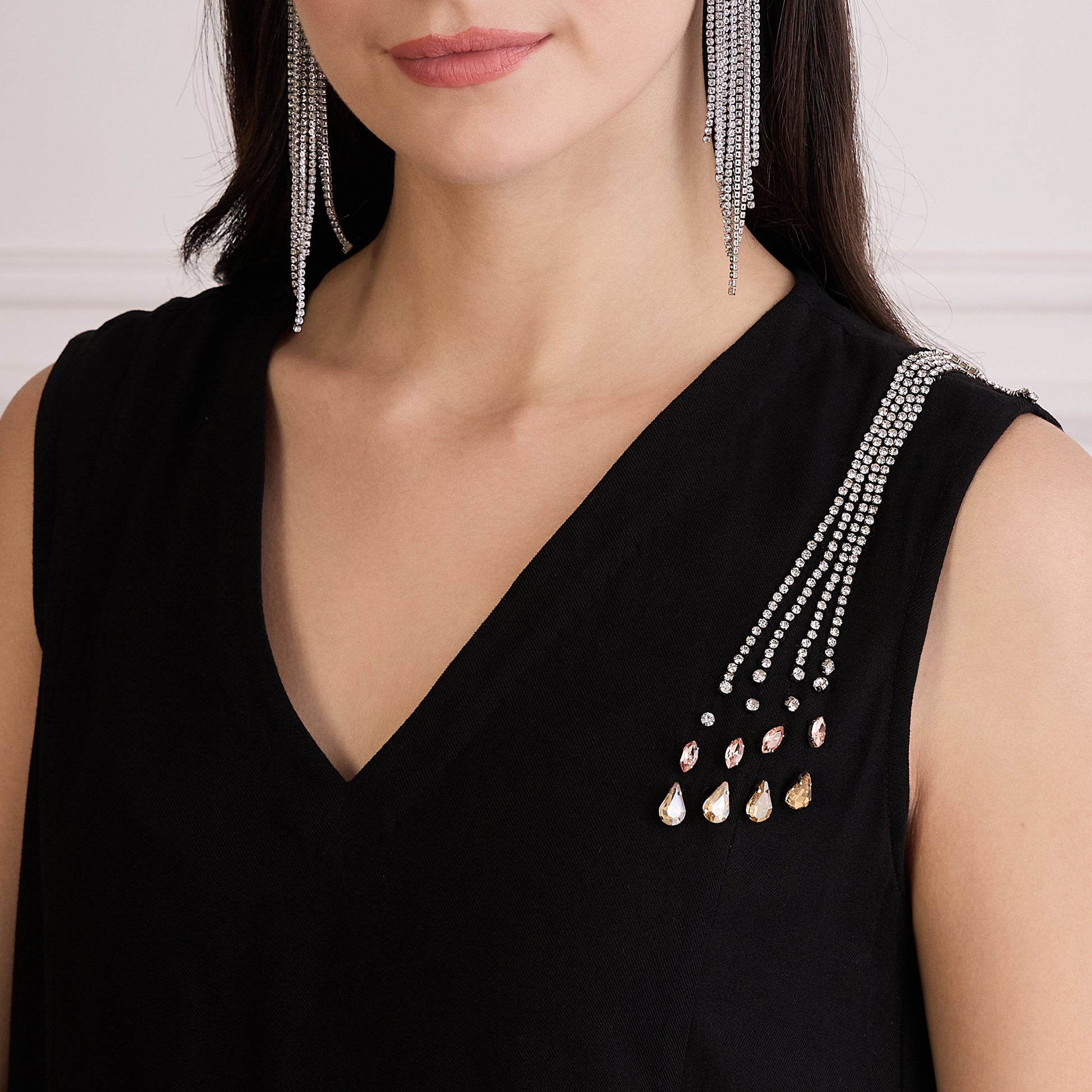 Description Make a subtle statement with this black asymmetrical top featuring delicate embellishments cascading from the shoulder. Crafted from structured cotton twill, its clean lines and modern silhouette offer effortless style with a touch of sparkle.