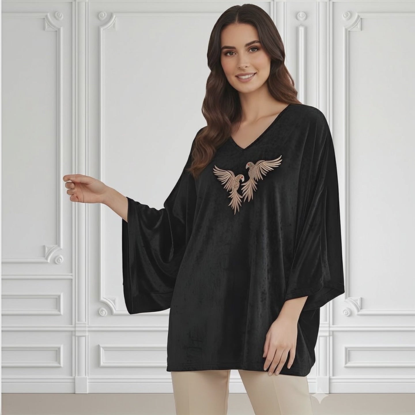 Description Make a refined style statement with this luxurious velvet top, featuring an intricately embroidered twin-bird motif at the front. The soft, plush fabric drapes beautifully, offering both comfort and elegance for winter dressing. Designed with a flattering V-neckline and gracefully flared sleeves, this piece blends contemporary charm with timeless artistry. Perfect for festive occasions, dinner outings, or elevated everyday wear.