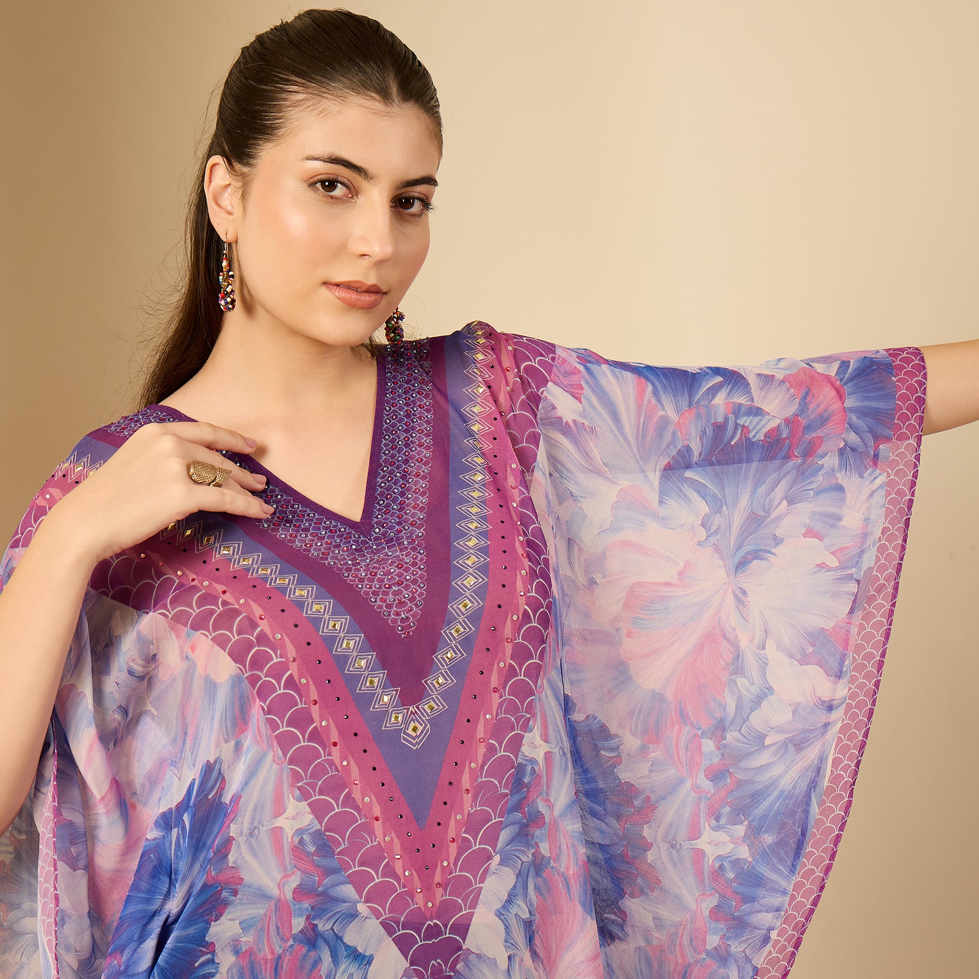 Description Bring a fresh and youthful vibe to your wardrobe with this floral-printed tunic, perfect for a trendy yet effortless look. The neckline is adorned with delicate crystal embellishments, adding a subtle sparkle that elevates the overall design.