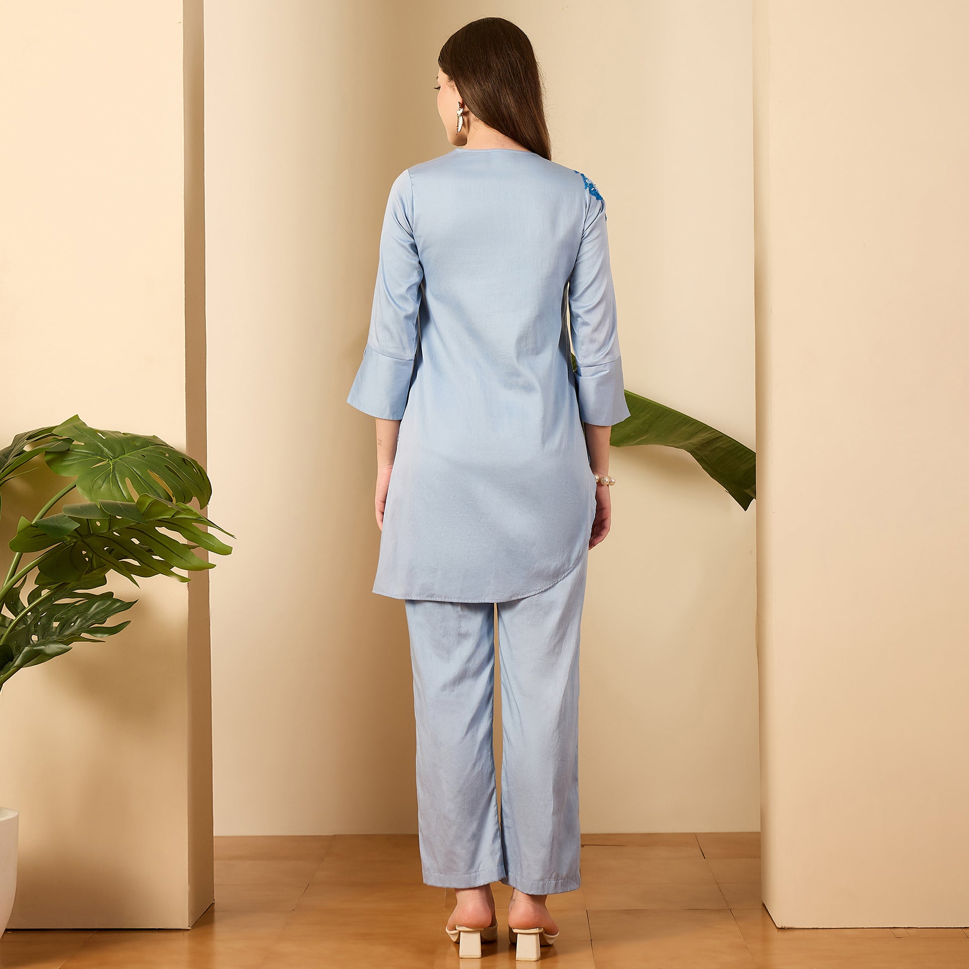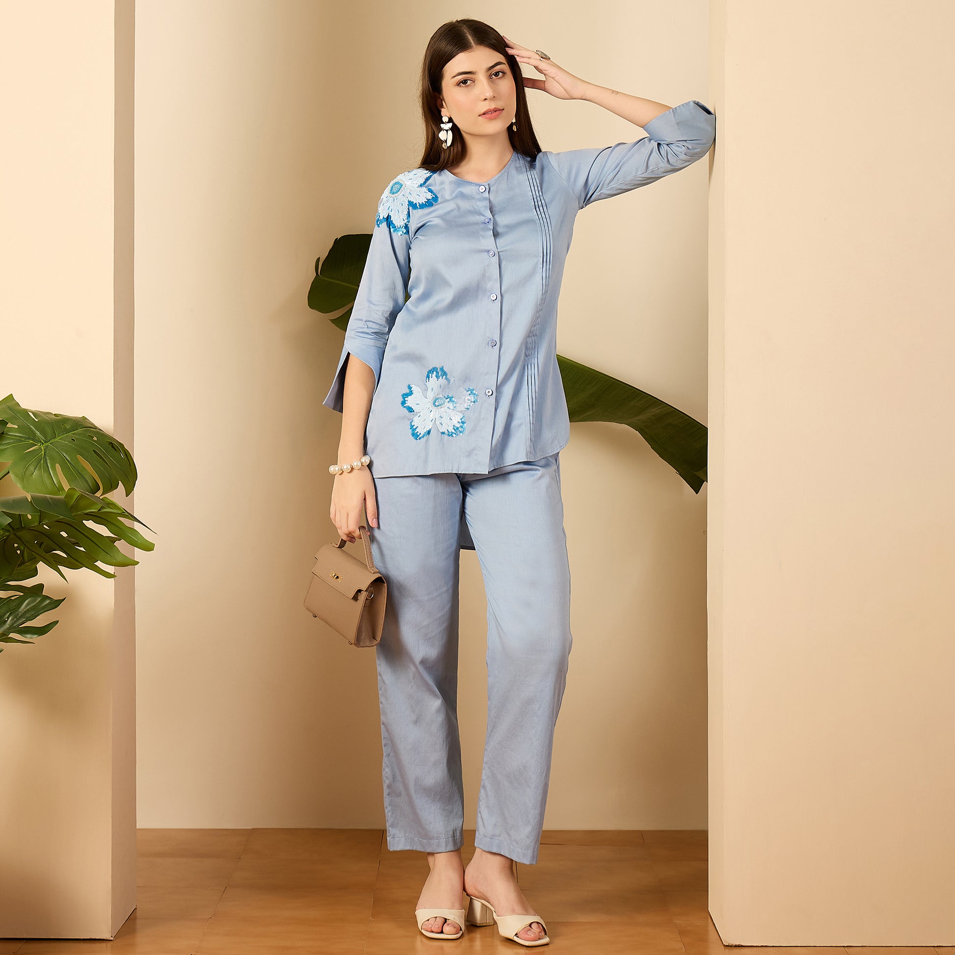 Description This striking co-ord set features intricate floral embroidery enhanced with delicate sequins, adding a subtle shimmer that catches the light beautifully. The coordinated pieces offer a harmonious blend of elegance and contemporary style, with a flattering fit designed to complement your silhouette. Perfect for making a polished statement at events or festive occasions.