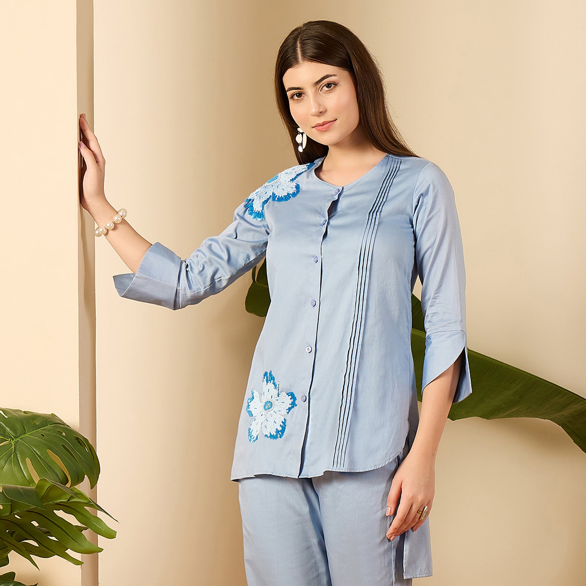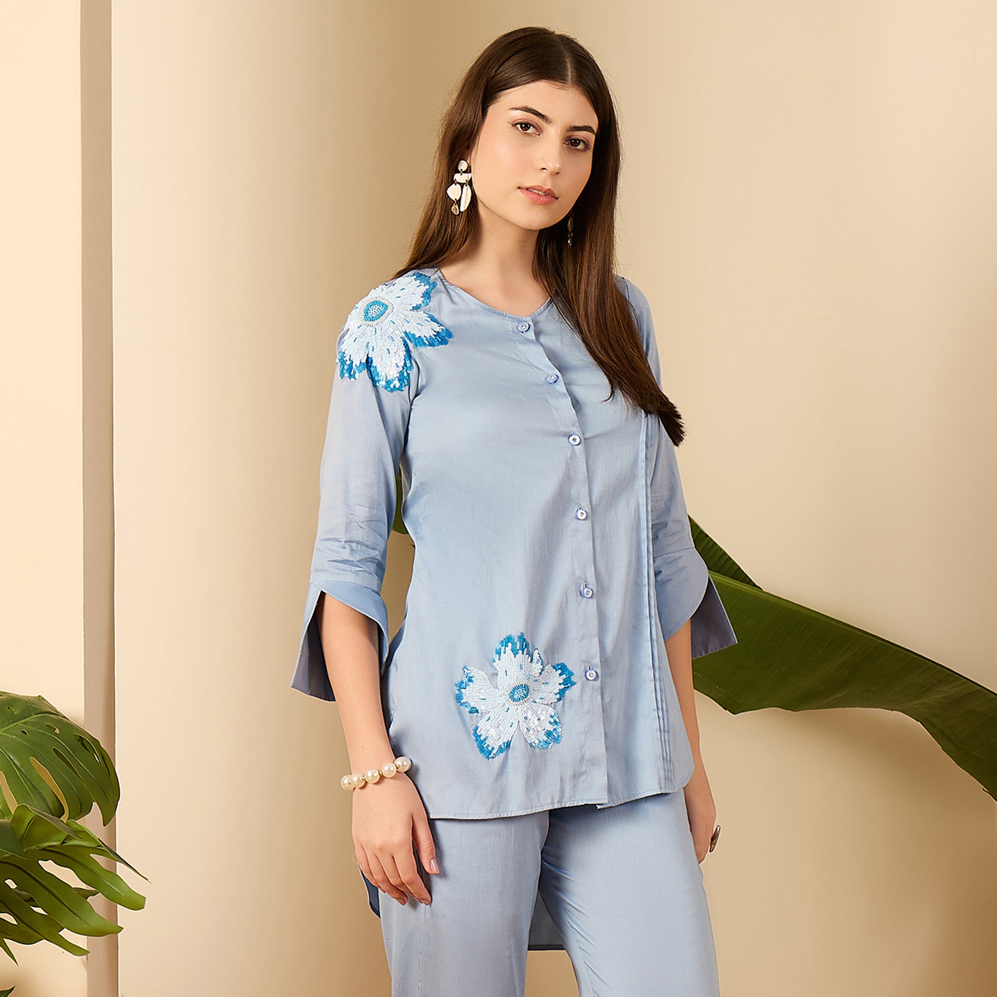 Description This beautifully hand-embroidered shirt features delicate floral motifs highlighted with subtle sequins for a hint of shimmer. Designed with a round neckline and 3/4th sleeves, it includes space tucks on the front for added texture and shape. The button-down front adds a classic touch to its comfortable, easy-to-wear silhouette.