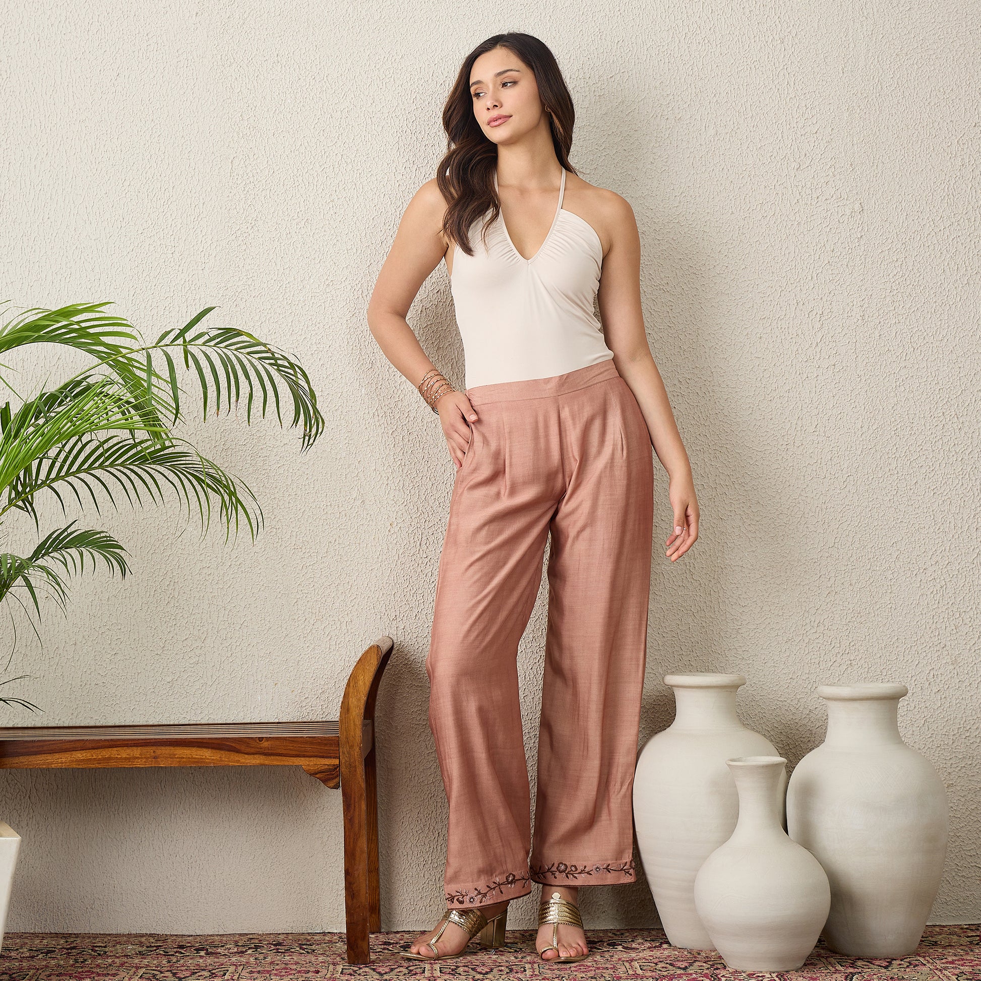 Style Guide Style these embroidered pants with a coordinating tunic or a minimalist silk blouse to create a chic, monochromatic look. Highlight the intricate hem detail by pairing them with metallic gold sandals and stacked bracelets. This versatile piece is perfect for festive daytime gatherings, intimate celebrations, or a polished evening ensemble.