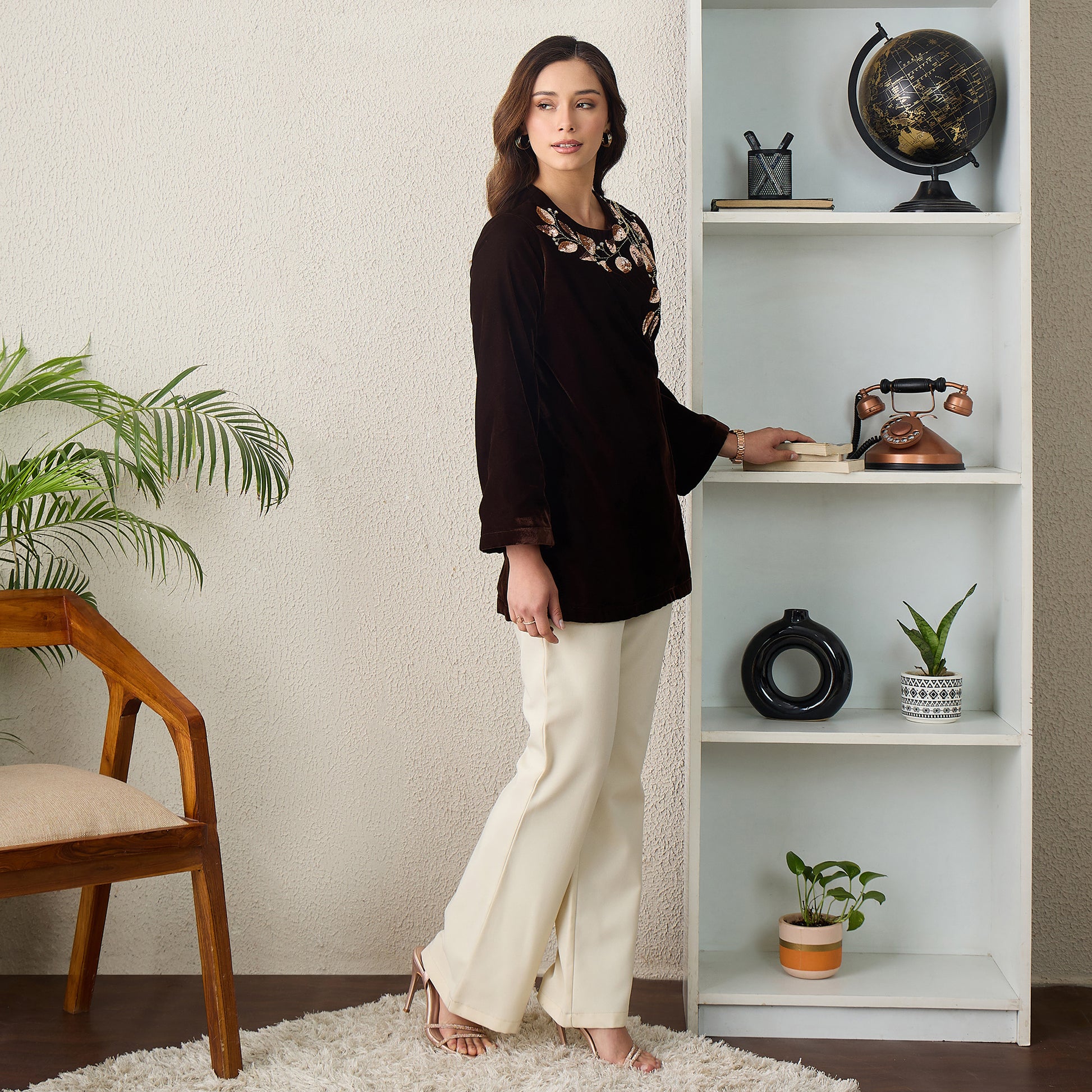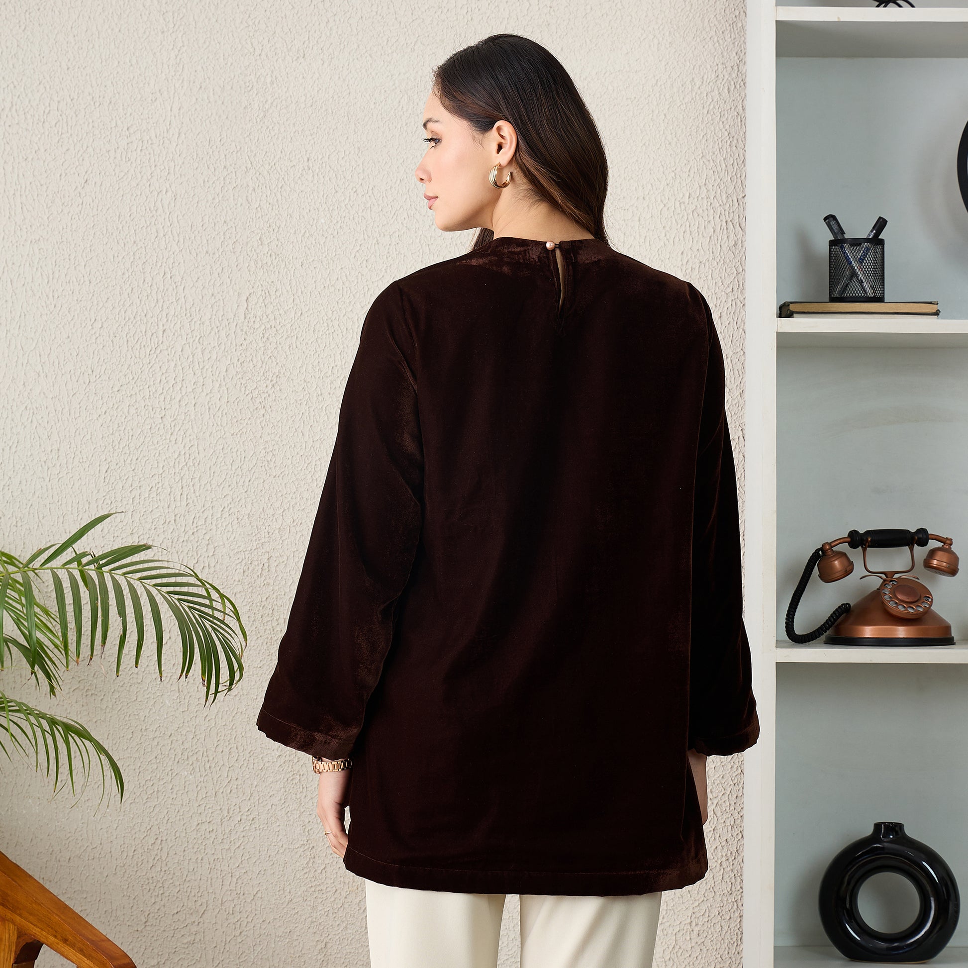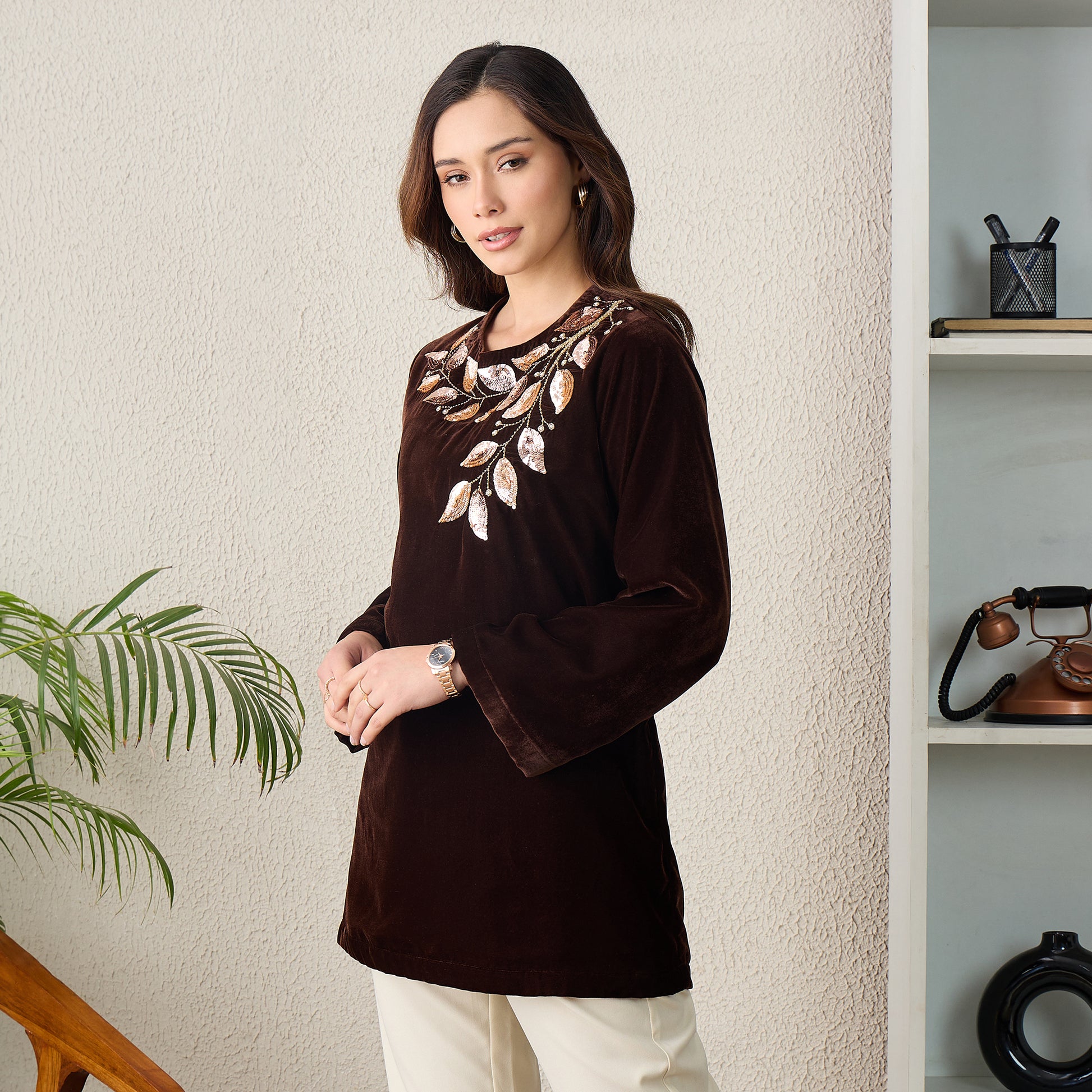 Brown Golden Vine Hand Embroidered Velvet Top