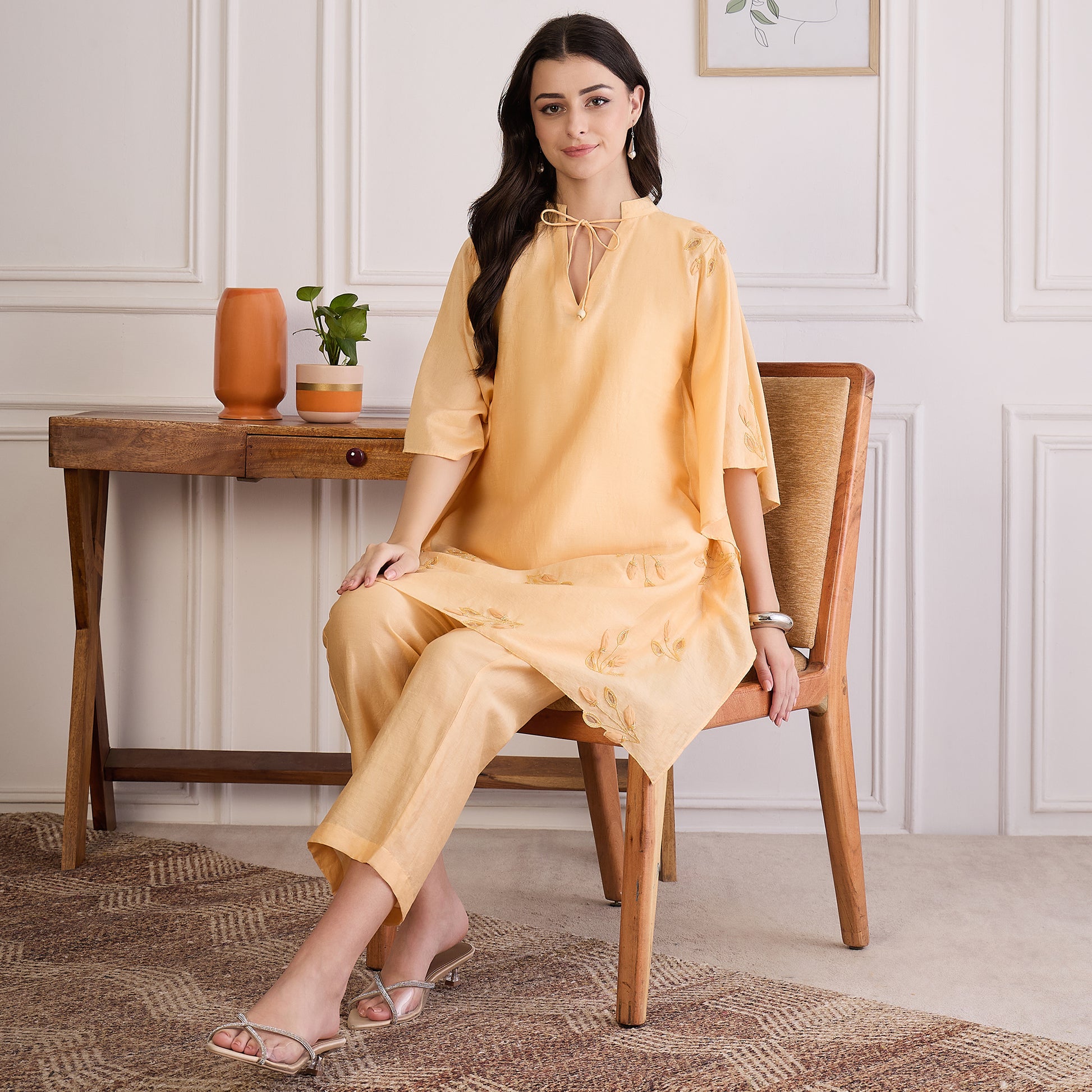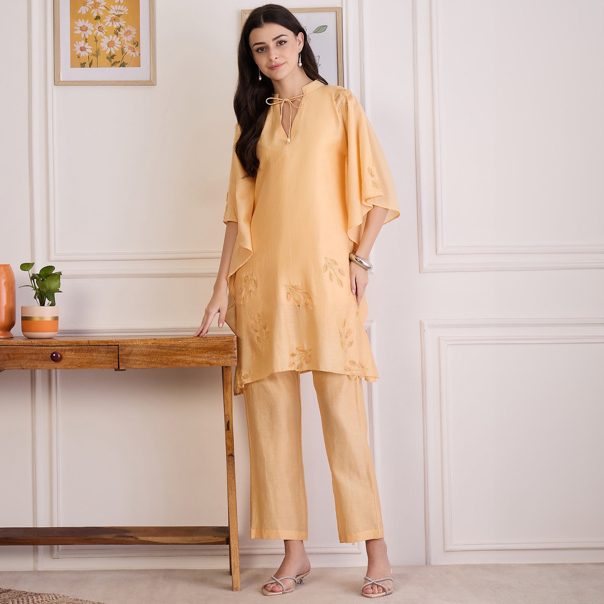 Style Guide Style this breezy kaftan top with straight-cut pants or palazzos in neutral tones for a balanced look. Let the applique and dori details stand out by keeping accessories minimal—opt for jute or metallic flats and a soft clutch. Add a touch of kohl and a nude lip for a relaxed yet refined aesthetic. Leave your hair loose in waves or tie it back in a low bun for an effortlessly graceful vibe.