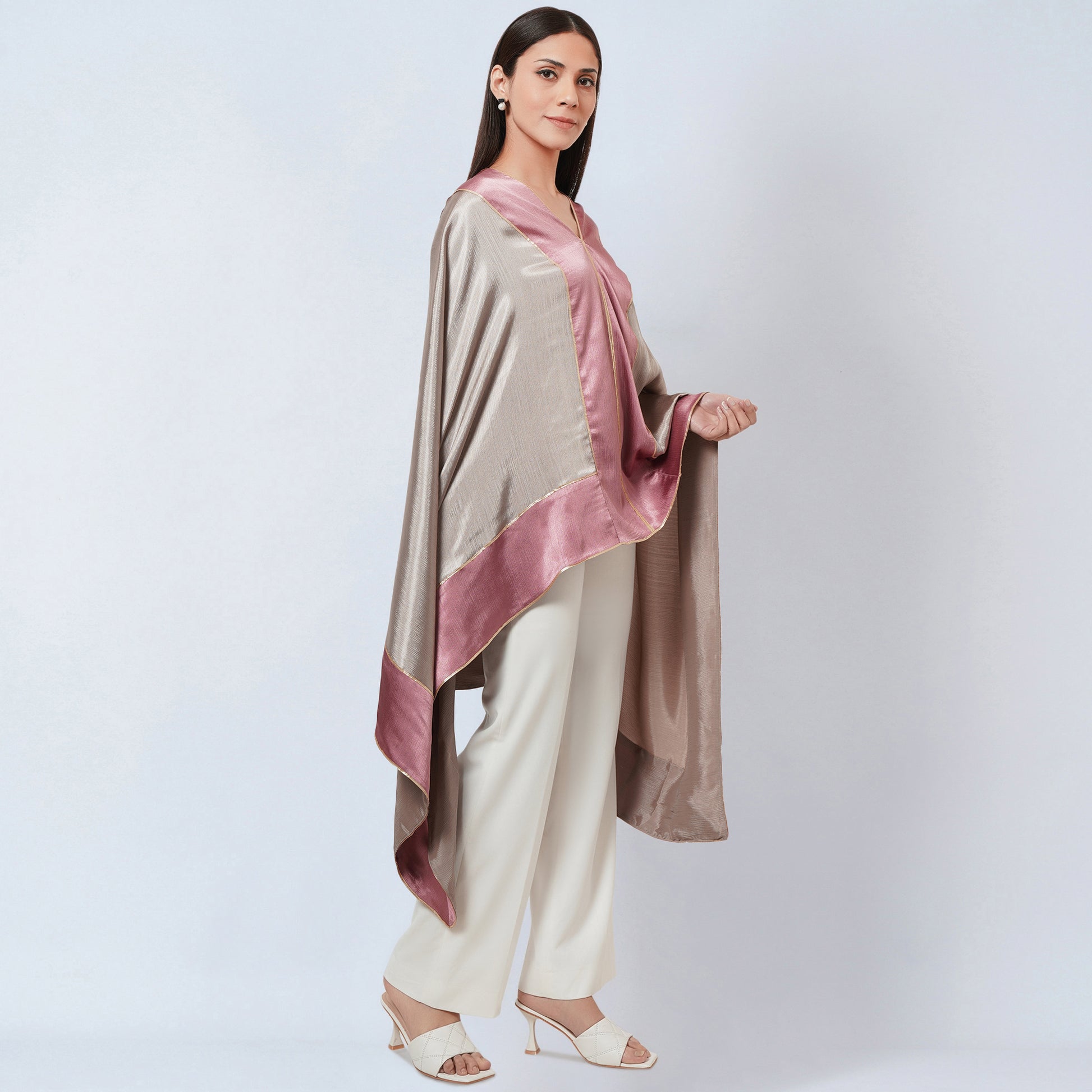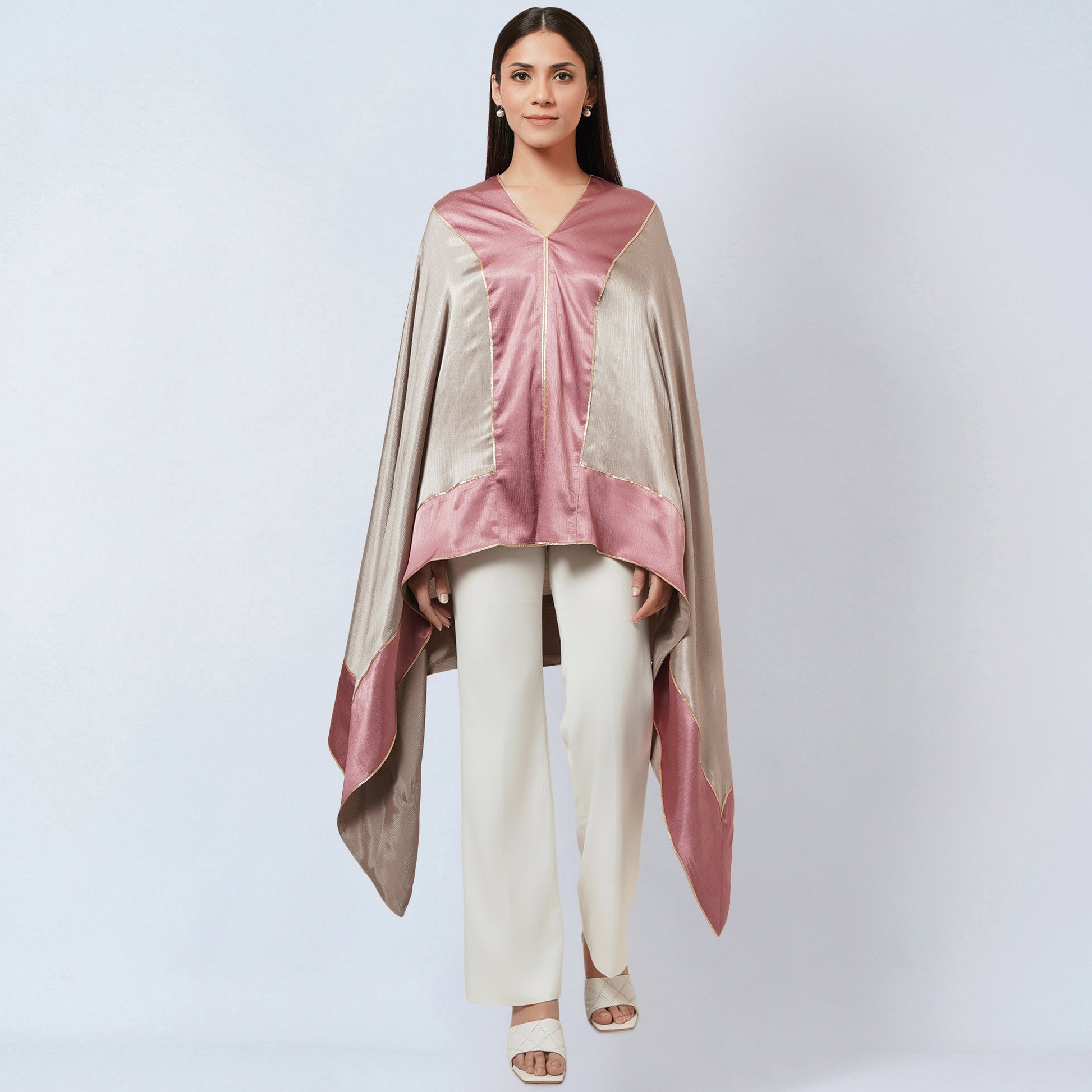 Ecru Satin Asymmetrical Tunic with Dusty Rose Border