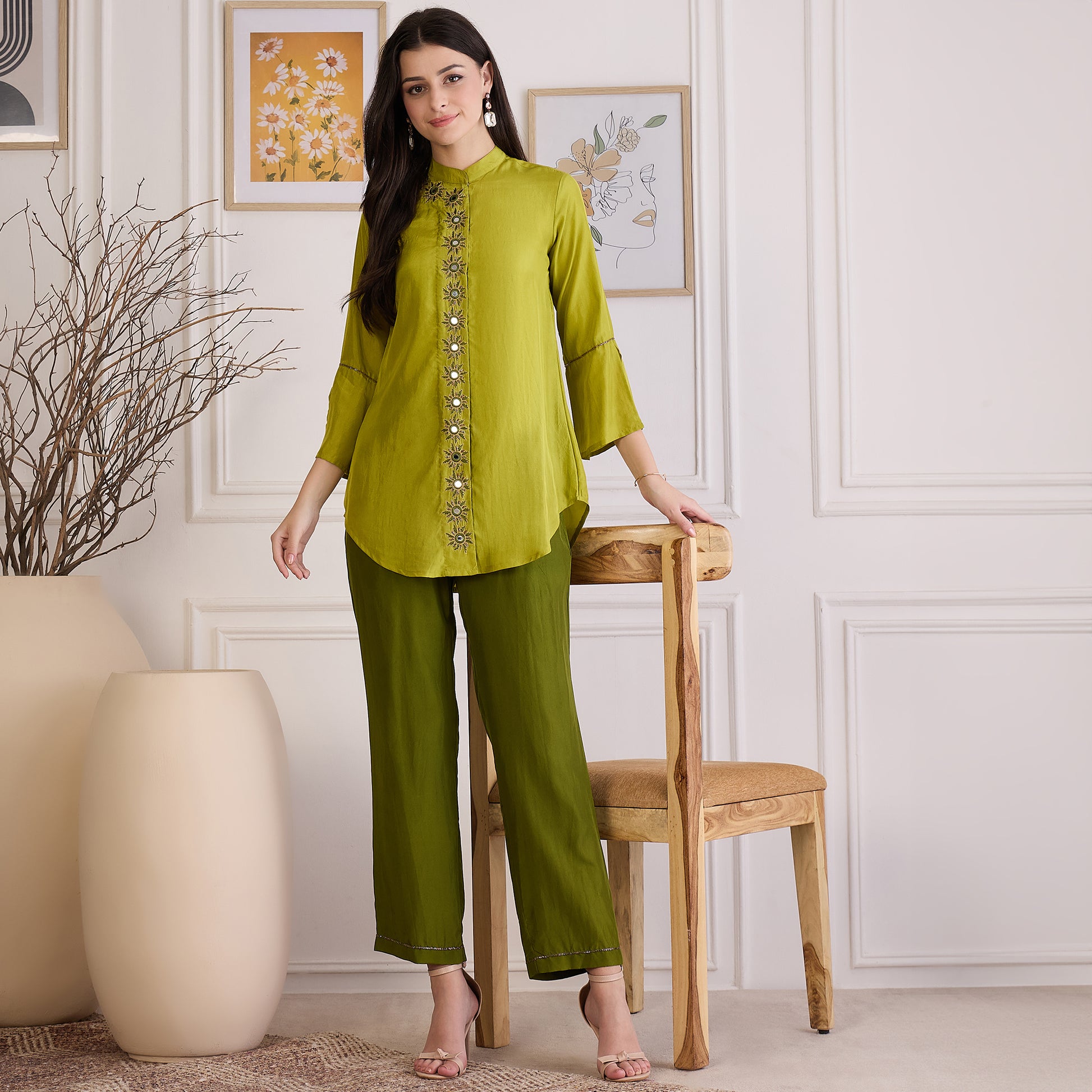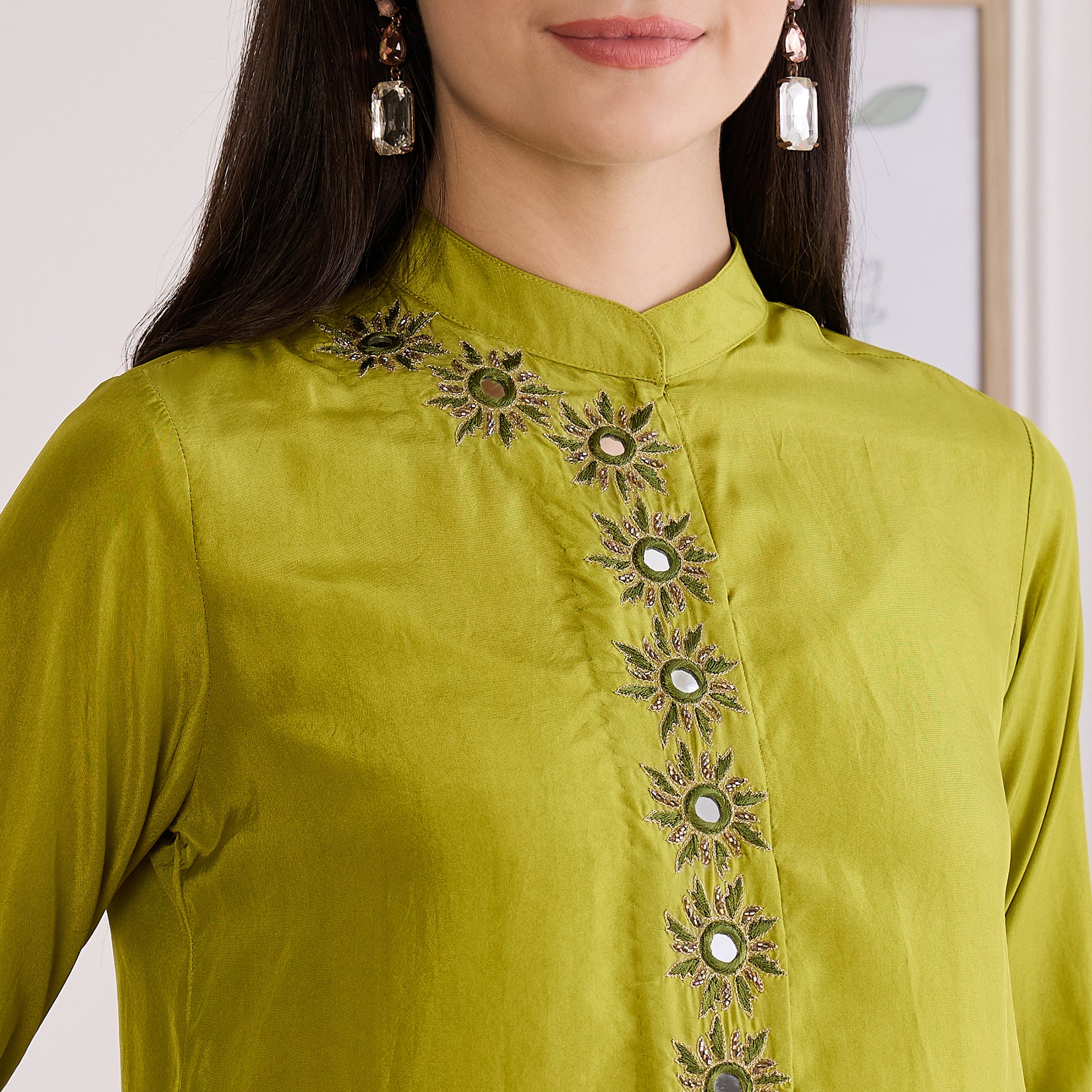 Description Discover timeless elegance with this silk top featuring exquisite hand embroidery along the placket. The delicate stitching adds a touch of artisanal craftsmanship to the smooth, lustrous fabric, creating a refined statement piece. Its classic silhouette paired with intricate detailing makes it perfect for both formal and festive occasions.
