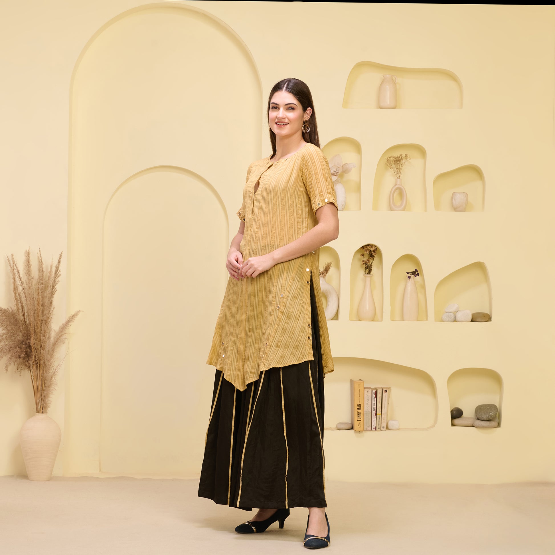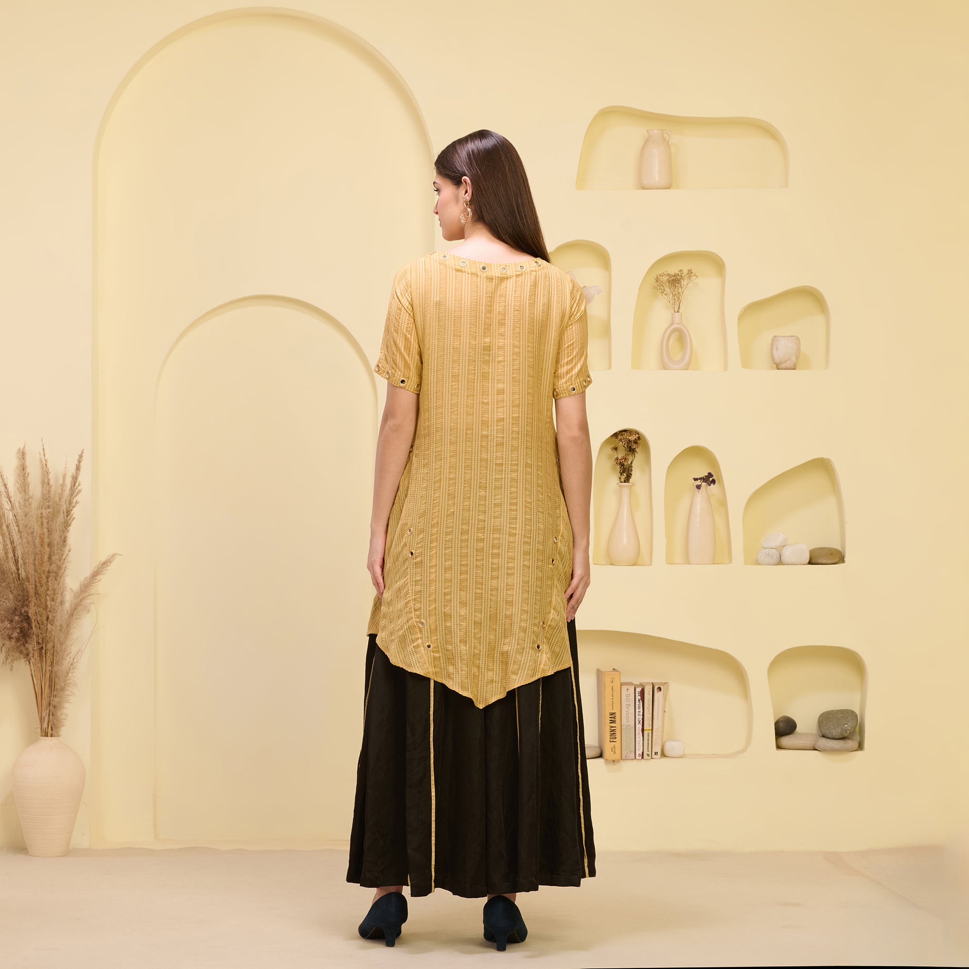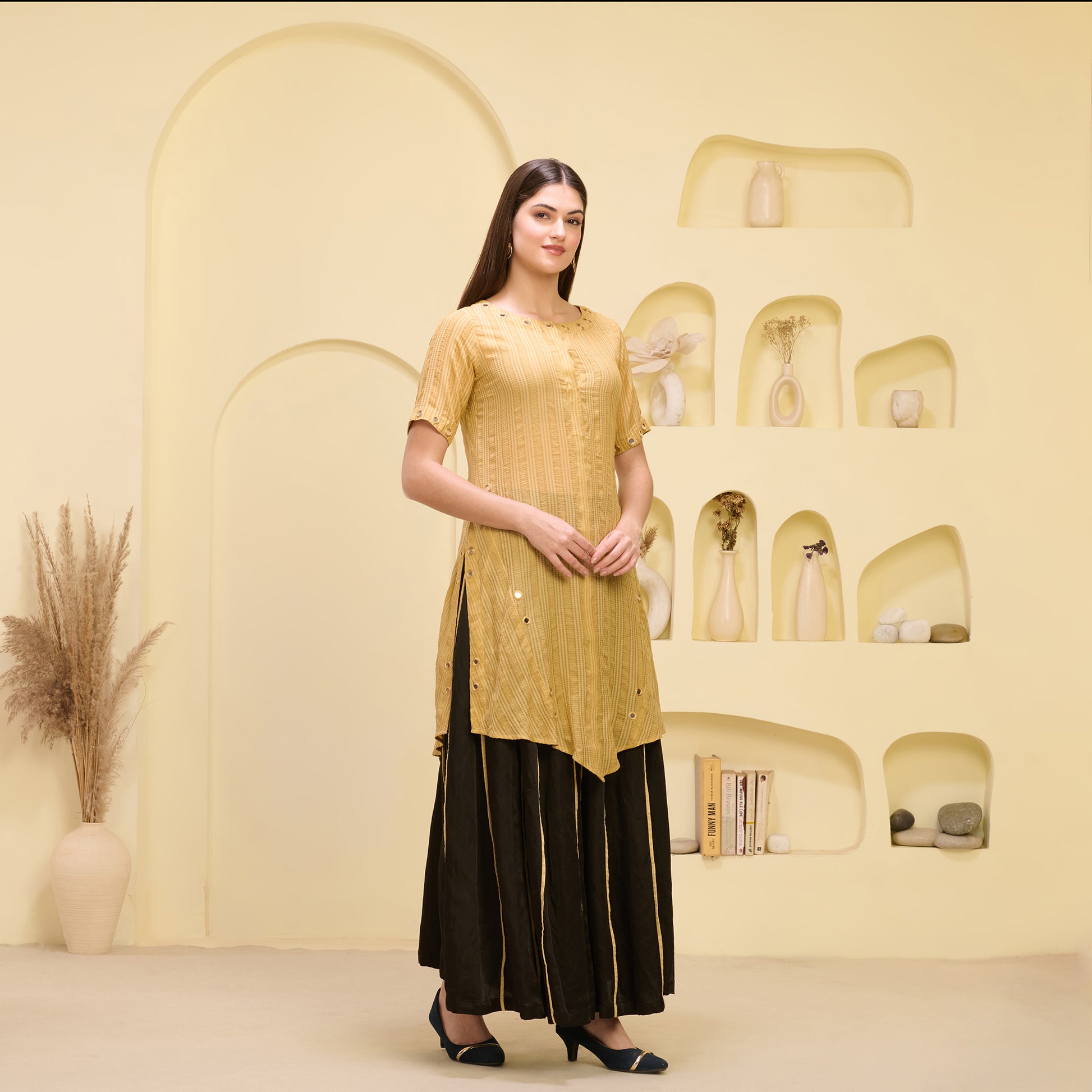 Golden and Black Mirror Hand Embroidered Asymmetric Kurta and Wide Leg Pleated Palazzo Set