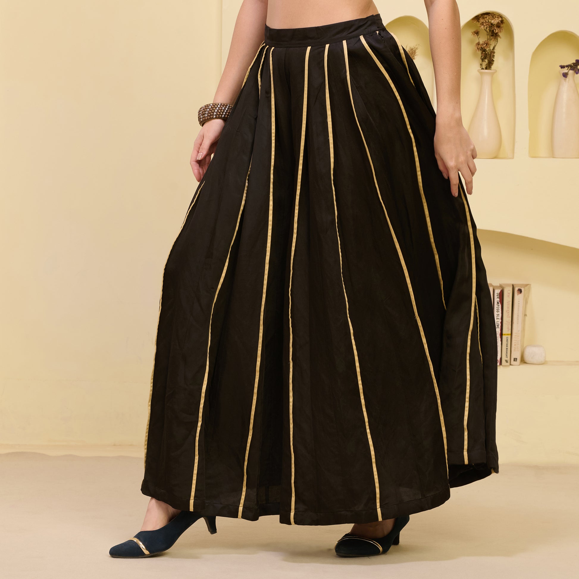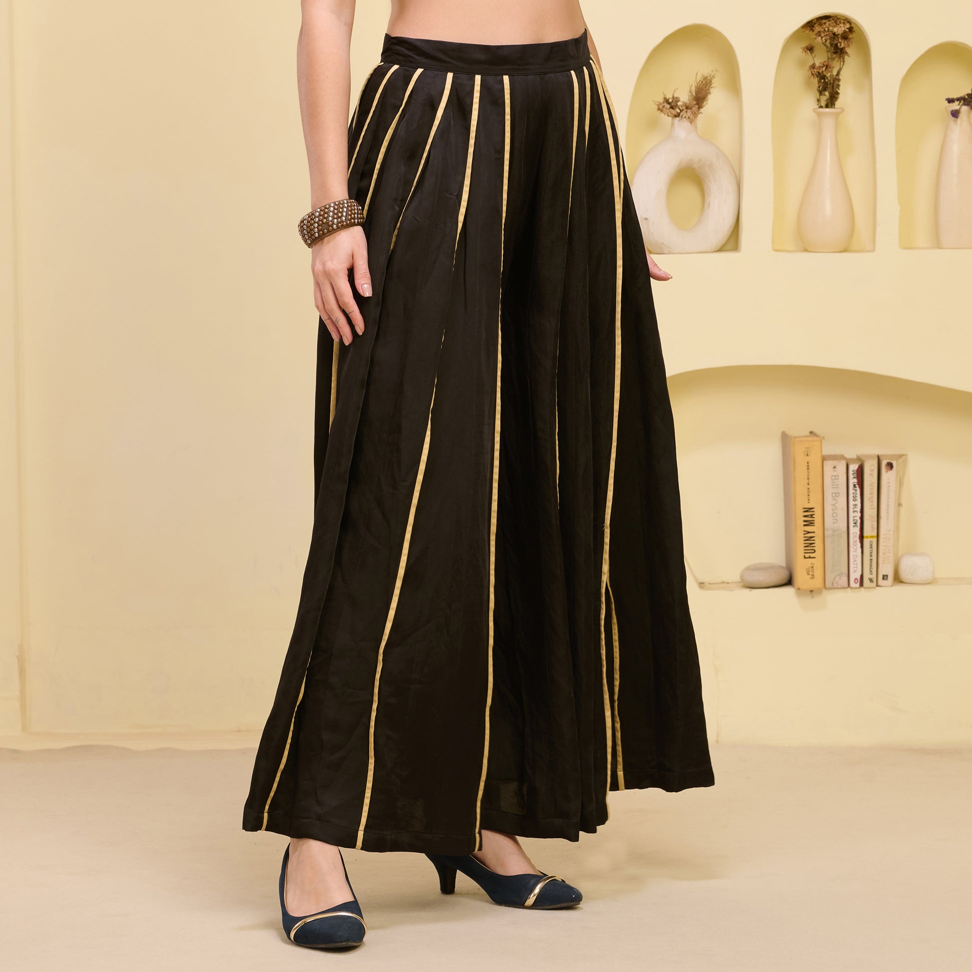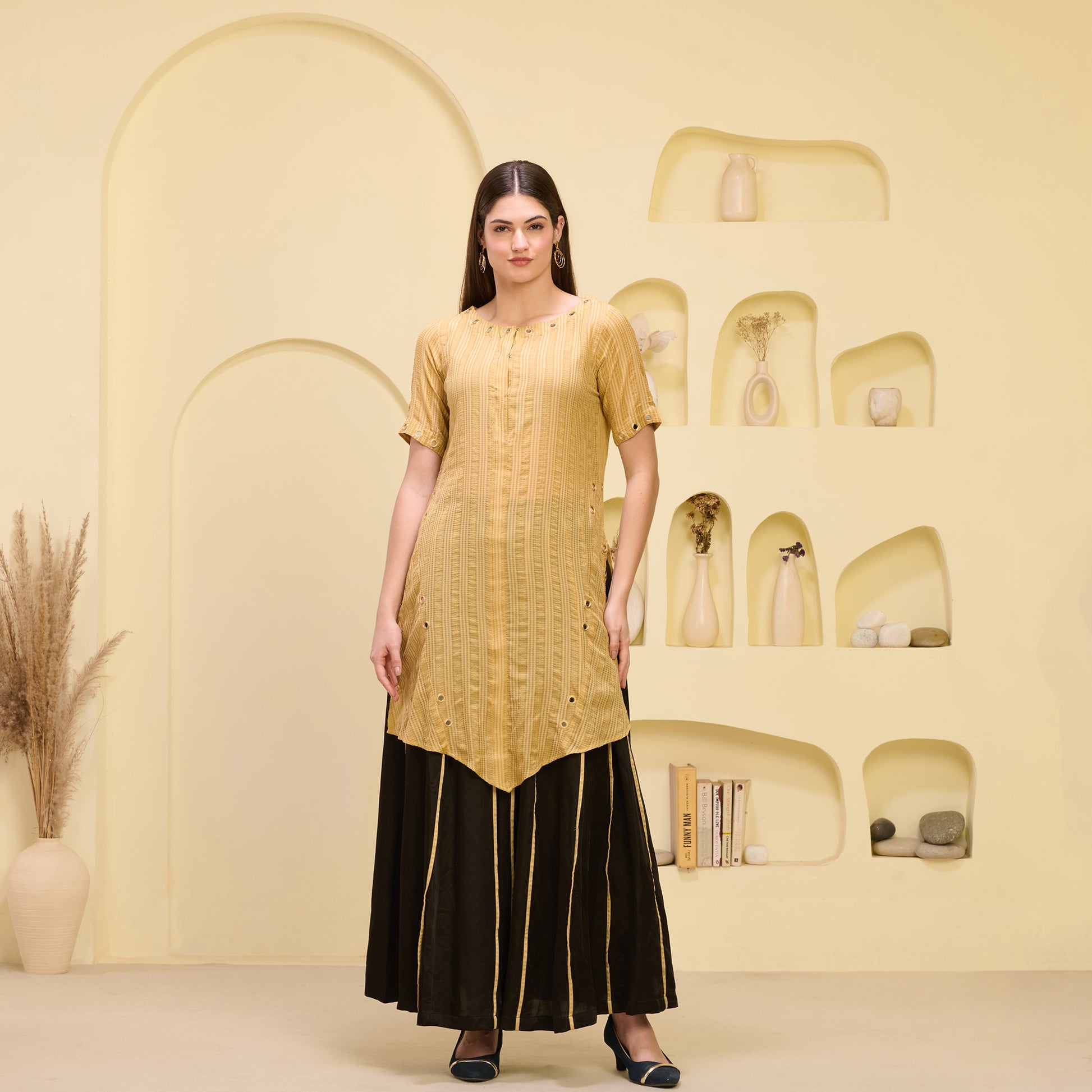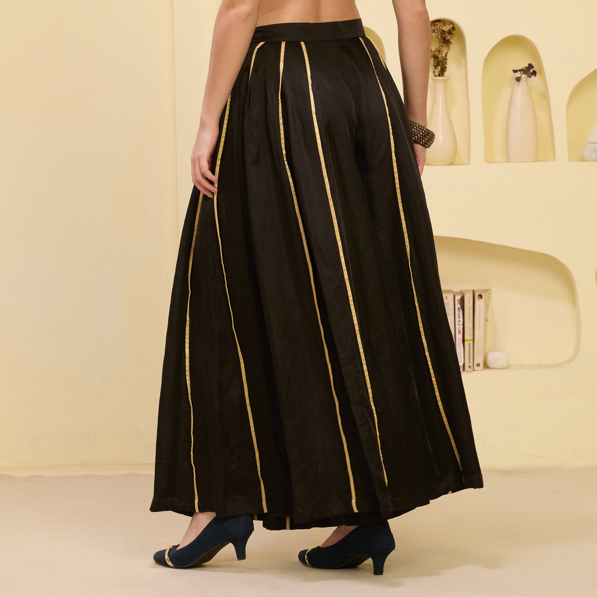 Golden and Black Mirror Hand Embroidered Asymmetric Kurta and Wide Leg Pleated Palazzo Set