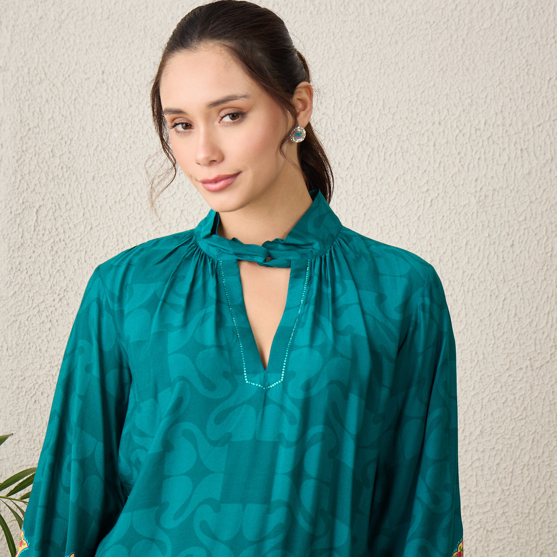Style Guide Pair this printed top with neutral trousers or dark denim for a balanced look. Add gold jhumkas or minimalist bangles to lean into the ethnic aesthetic, perfect for casual festive gatherings or creative office days.