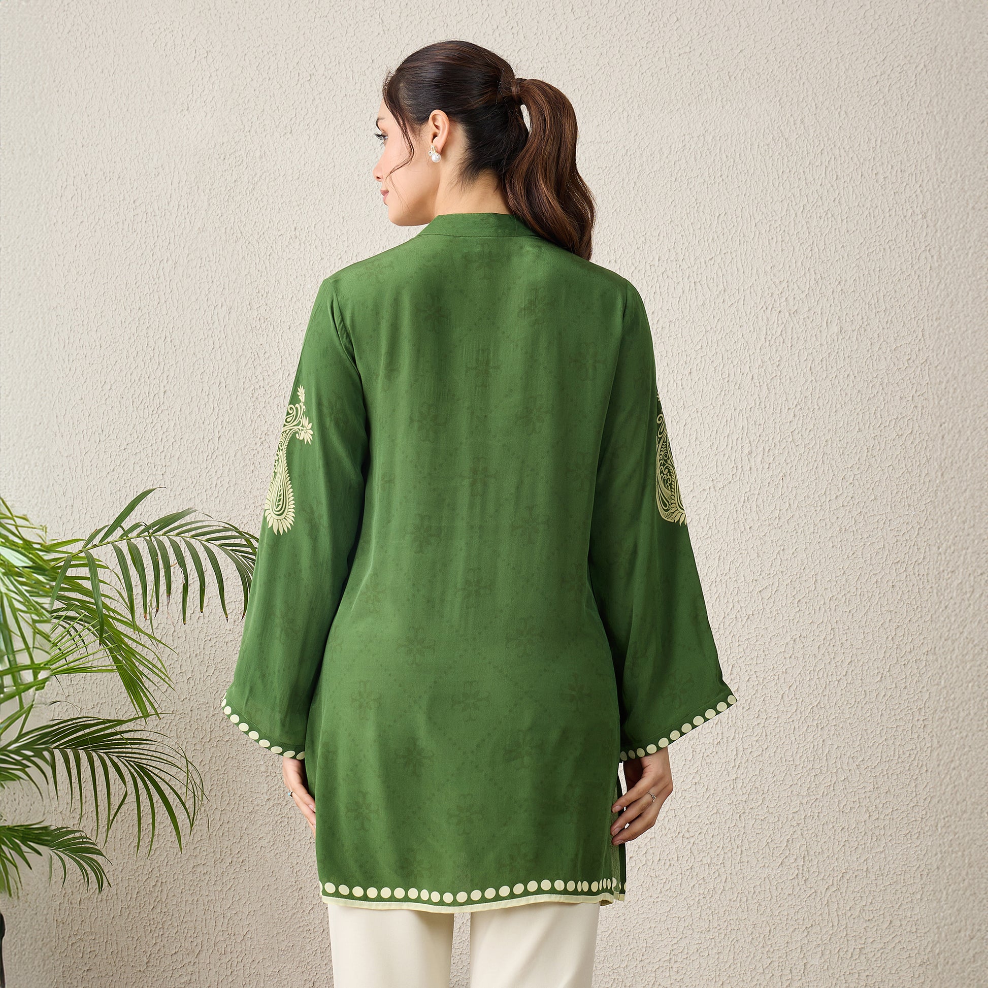 Description This sophisticated short kurta features a prominent, intricately detailed central paisley motif accented by delicate floral patterns. It is designed with a refined notched collar and long, relaxed sleeves finished with a dainty circular border. Subtle crystal embellishments are scattered throughout, adding a gentle shimmer to the rich, textured silhouette.