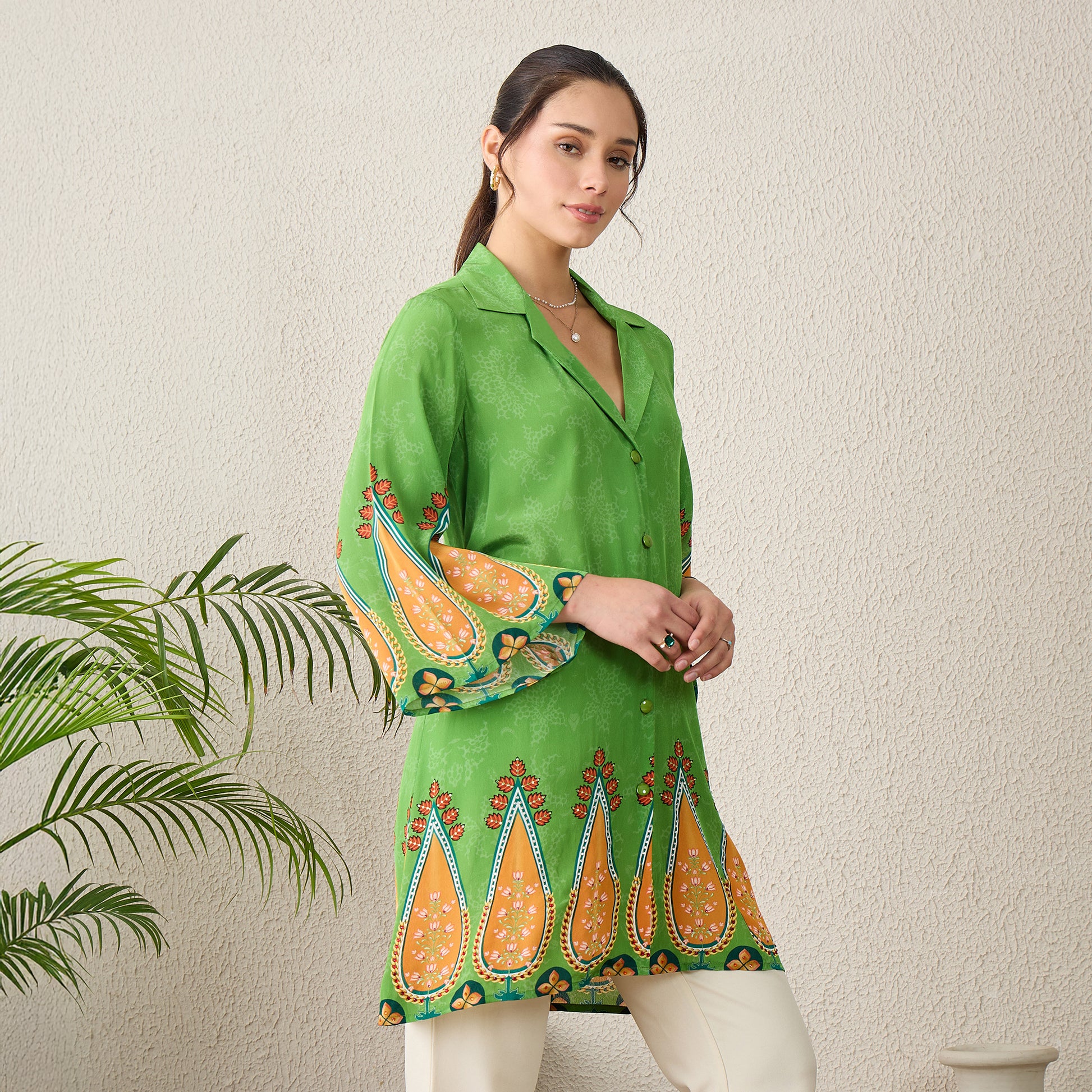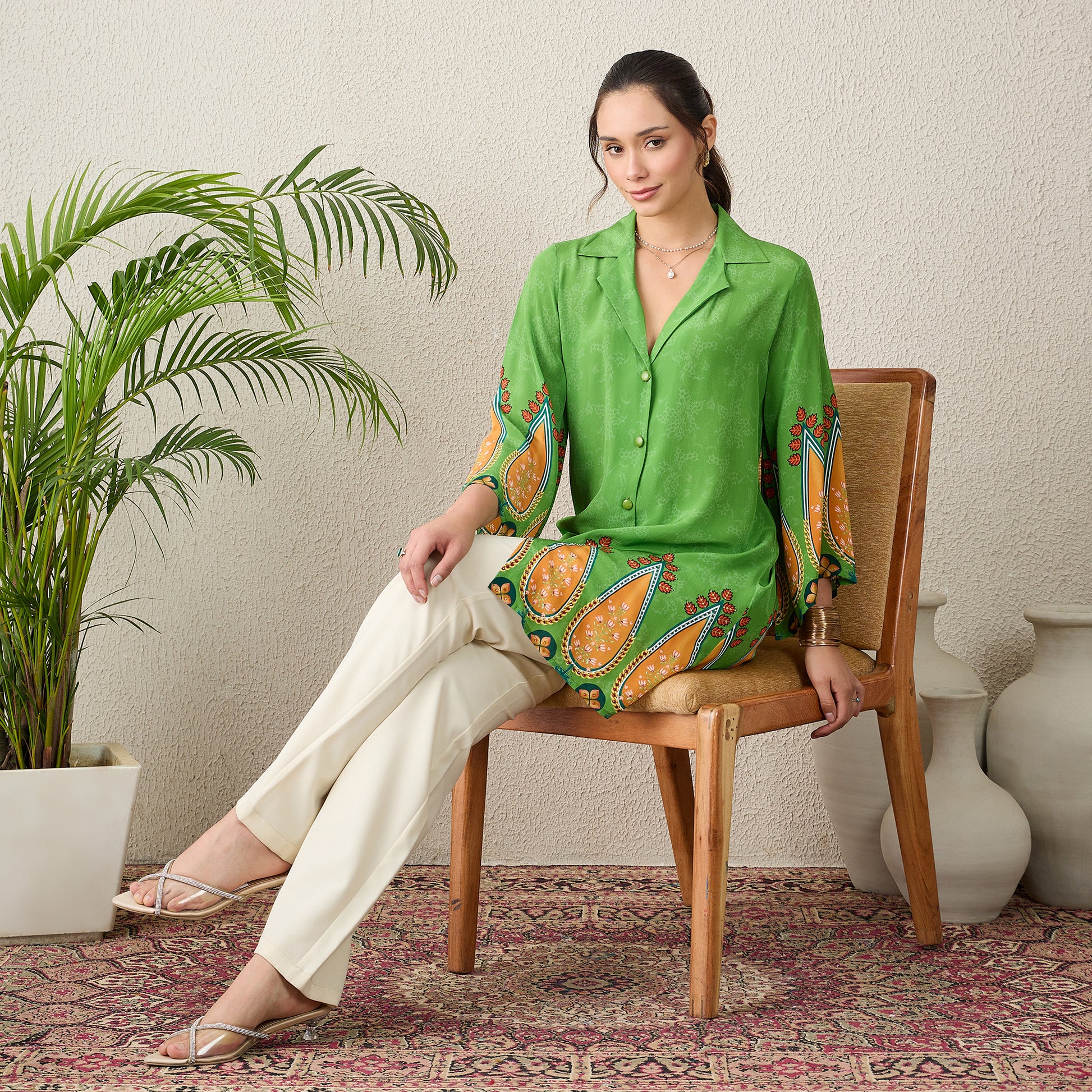 Description This luxurious shirt features a traditional paisley pattern elevated by hand-applied crystal embellishments that catch the light. The shimmering details are strategically placed to enhance the intricate print, offering a high-fashion approach to classic menswear-inspired tailoring.