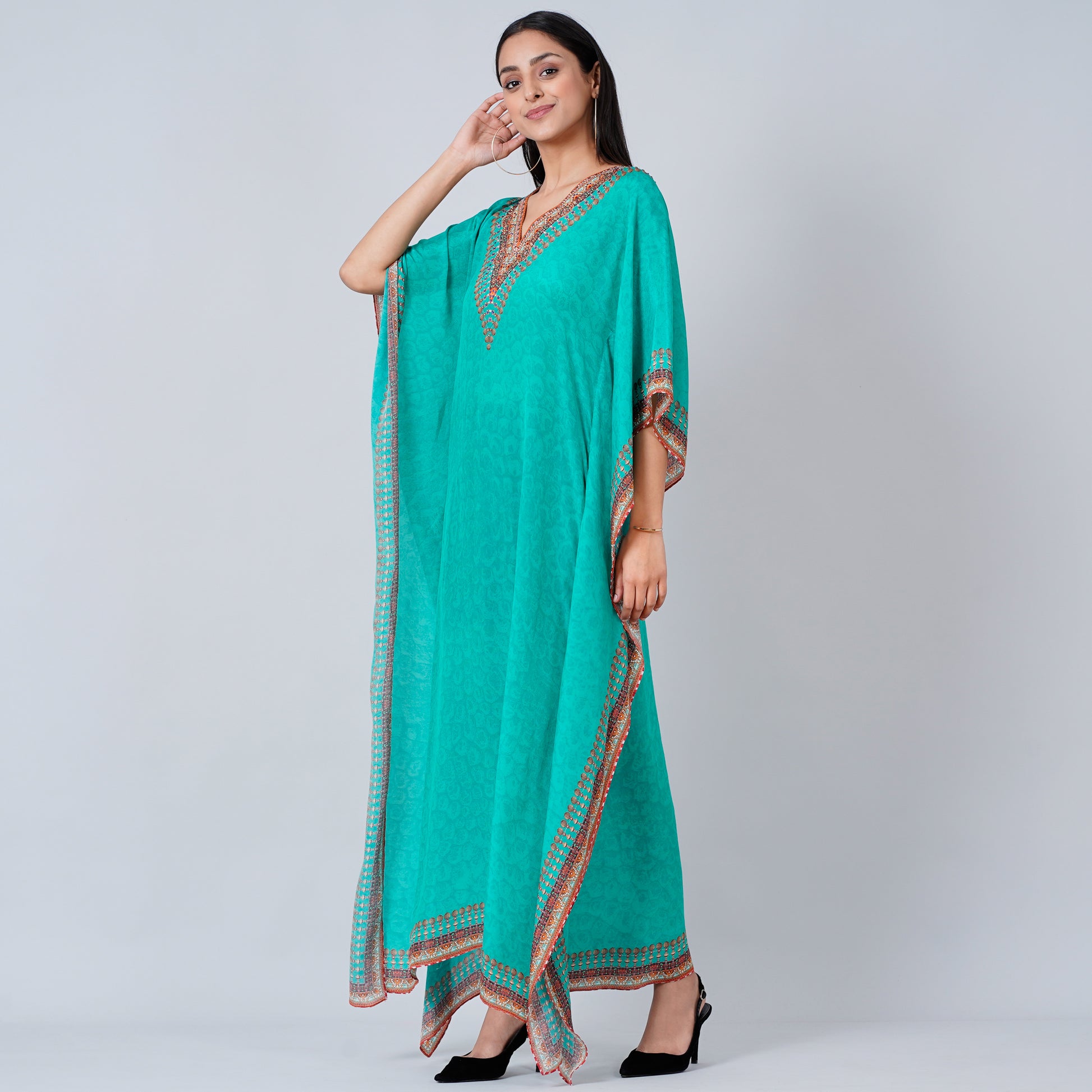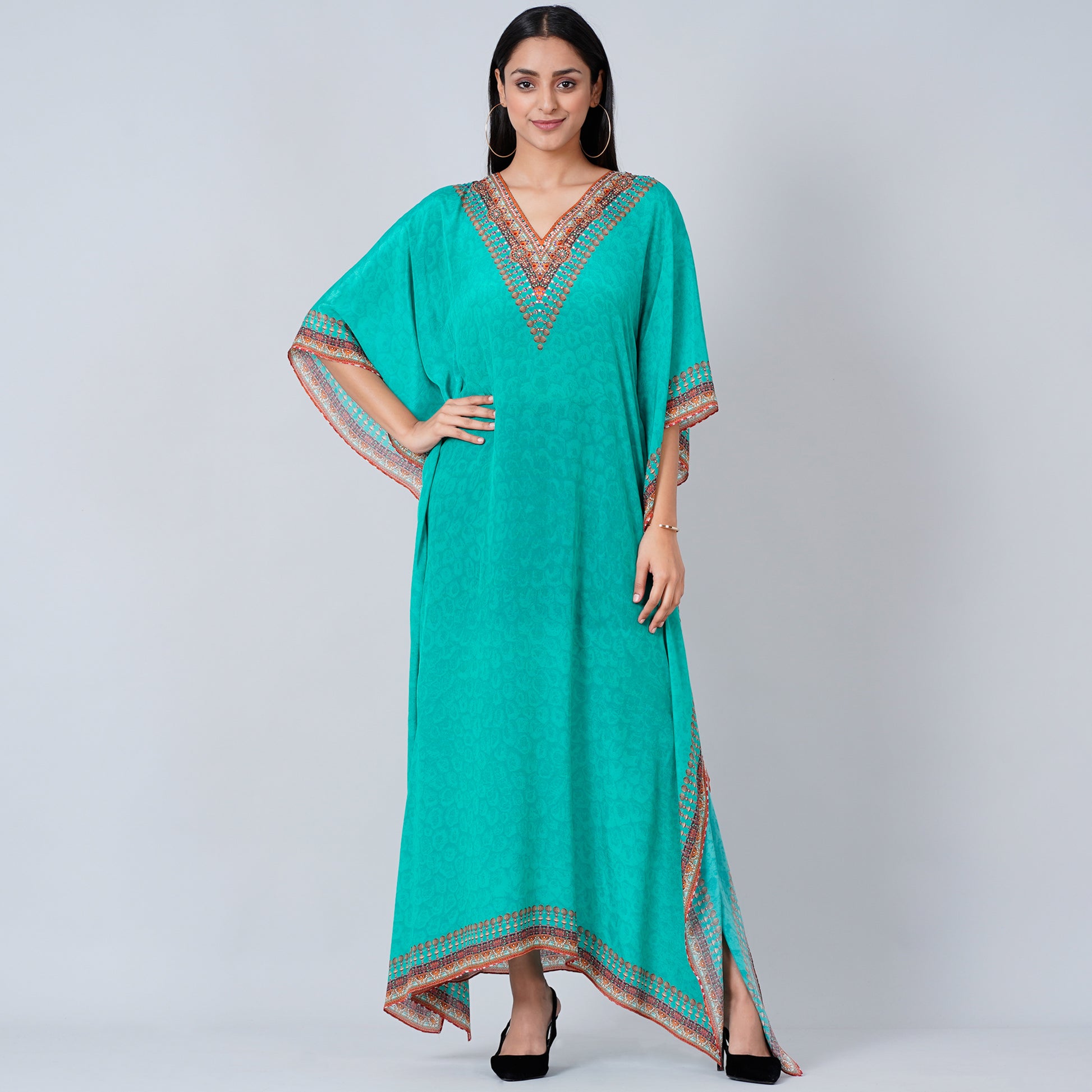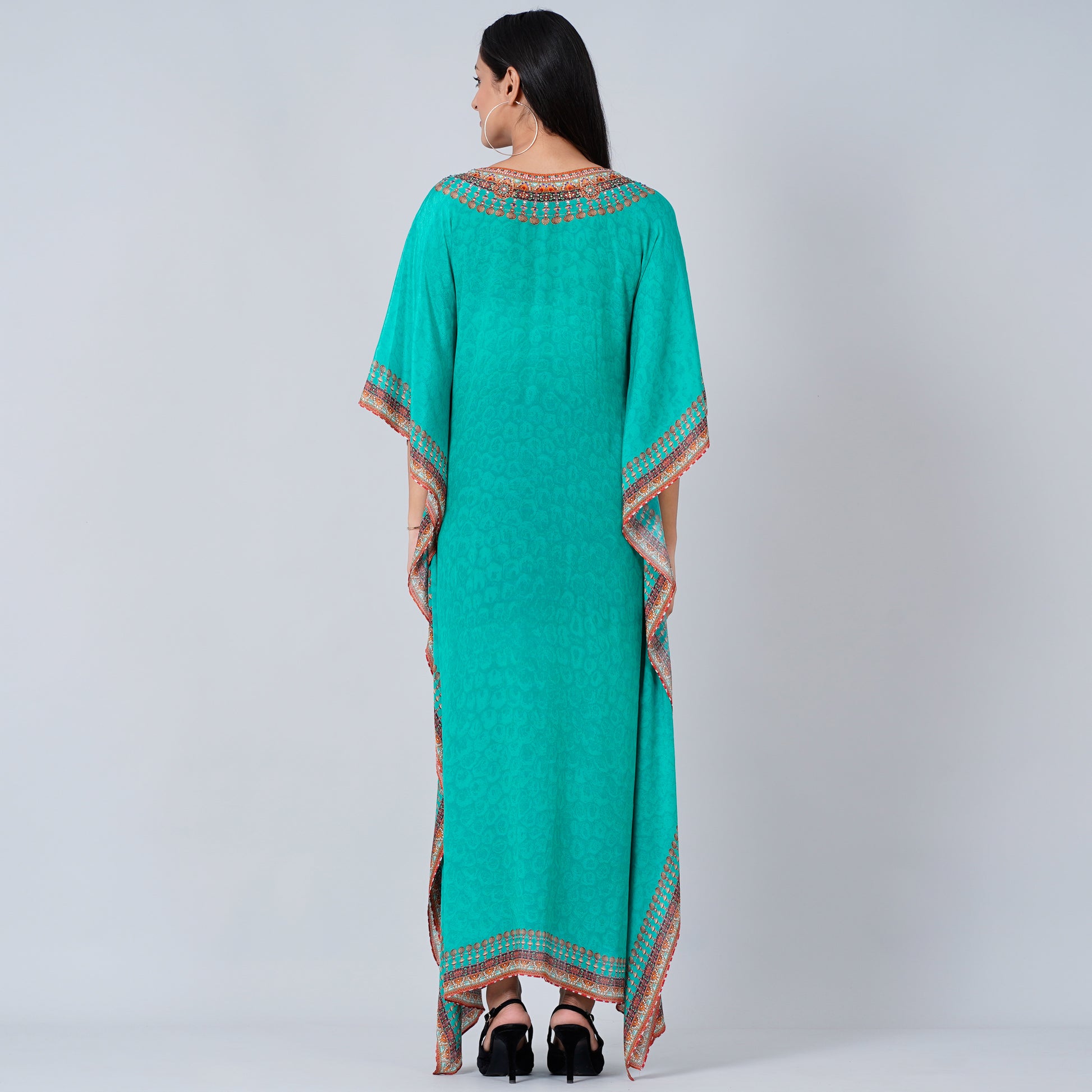 Description Pearl full length kaftan in vibrant jewel tones enhanced with ornamental crystal neckline.