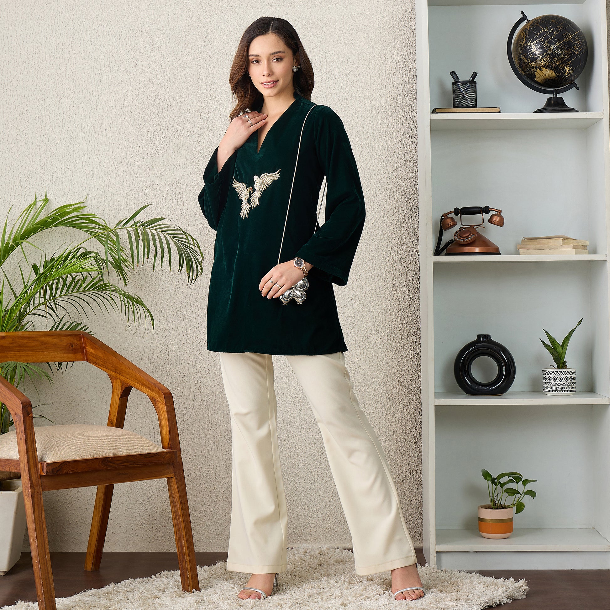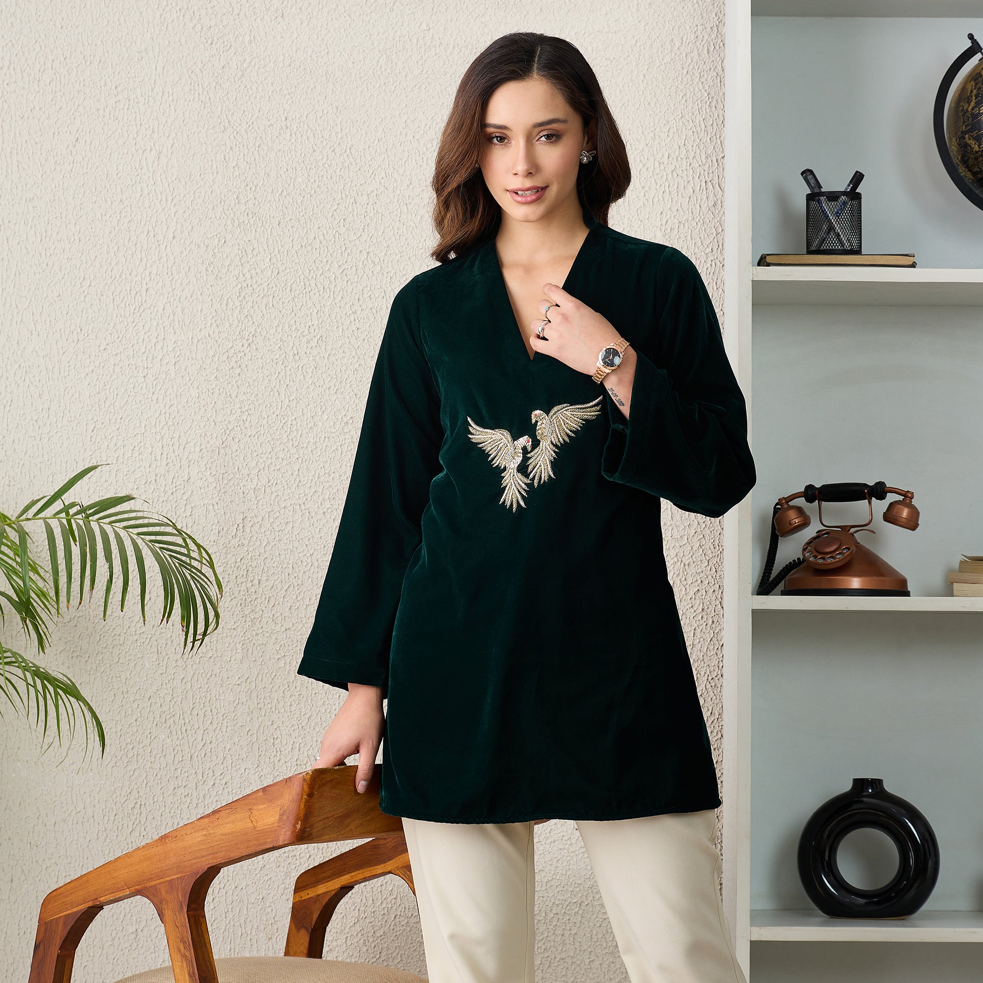 Style Guide Elevate your look by pairing this velvet top with tailored trousers or a sleek skirt to let the embroidered bird motif stand out. Its graceful V-neckline works beautifully with minimal jewellery—simple studs or a delicate bracelet add just the right touch. For winter outings, layer it with a structured coat or an elegant shawl, and complete the outfit with refined heels or embellished flats. Perfect for festive gatherings or evening dinners, this top brings effortless sophistication to any occasion.