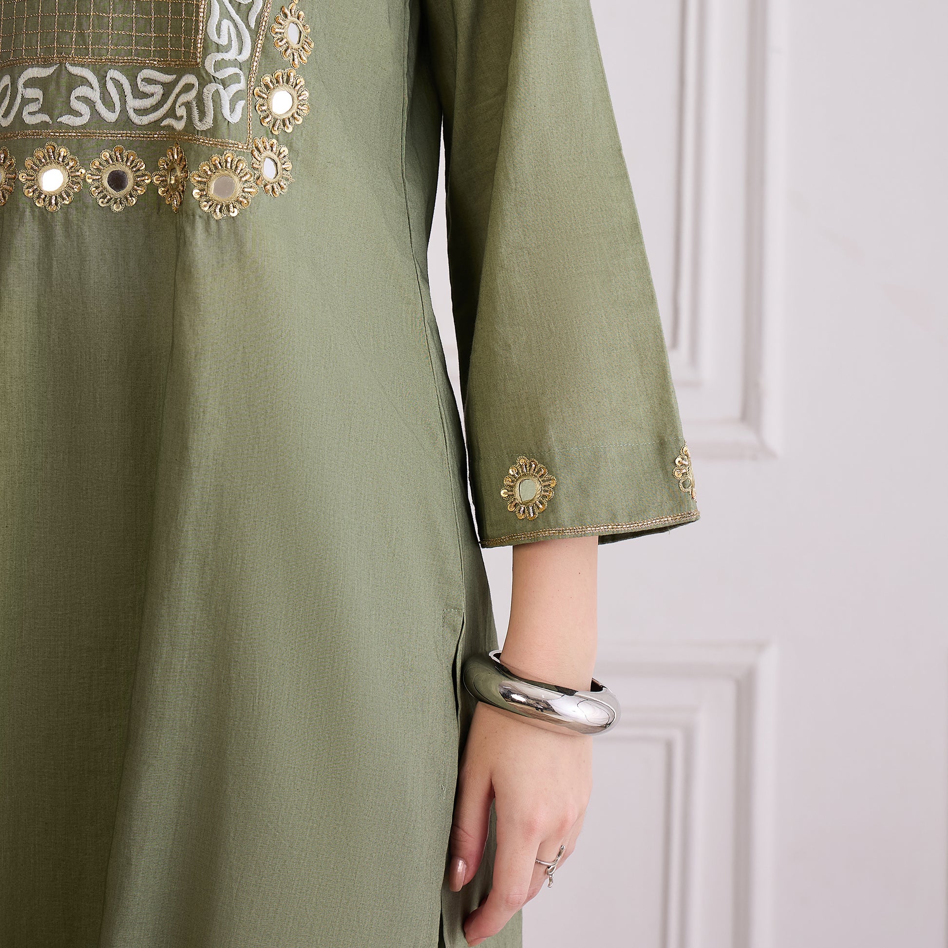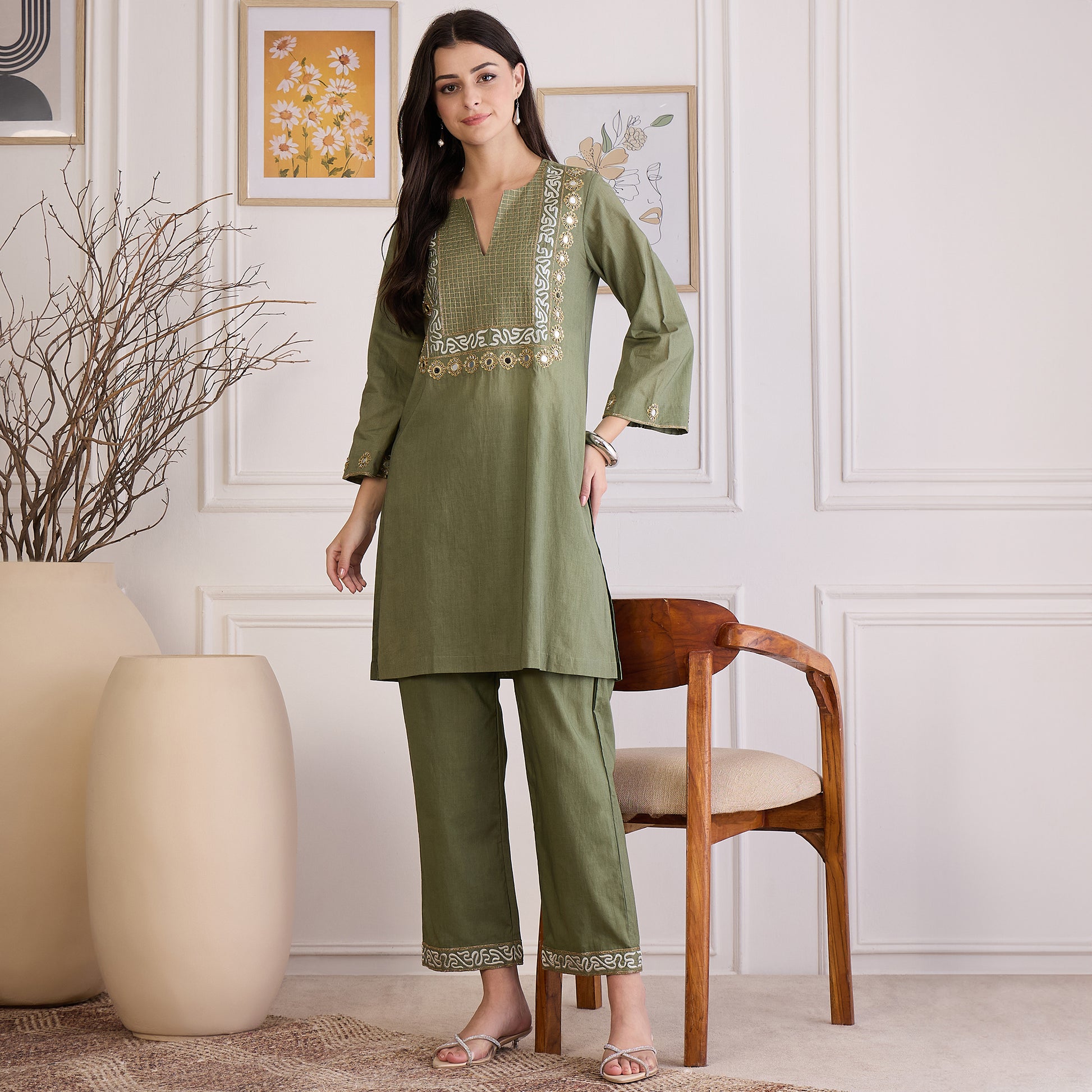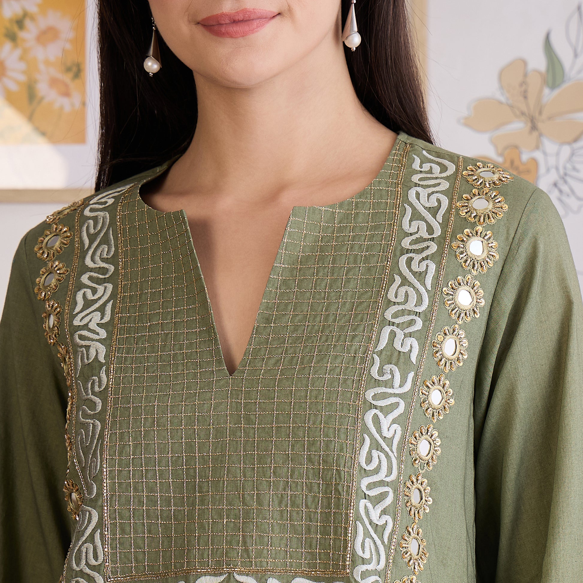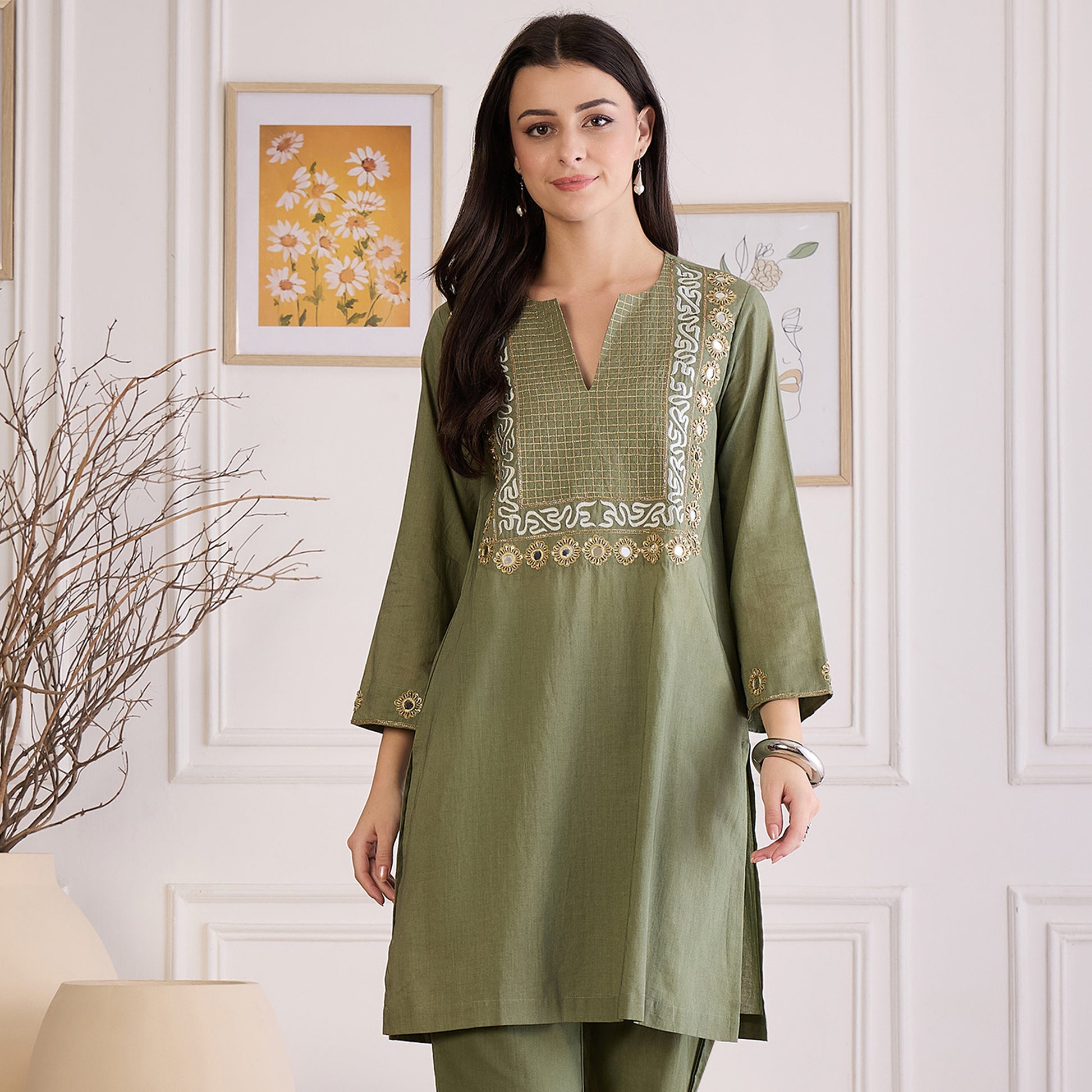 Style Guide Pair this beautifully embroidered top with tailored trousers or a flowing skirt to showcase its rich detailing. Keep accessories understated—opt for delicate gold jewelry to complement the zari work without overpowering it. Complete the look with heeled sandals and a chic clutch. Style your hair in soft curls or a sleek bun, and choose warm, glowing makeup to enhance the elegant shimmer.