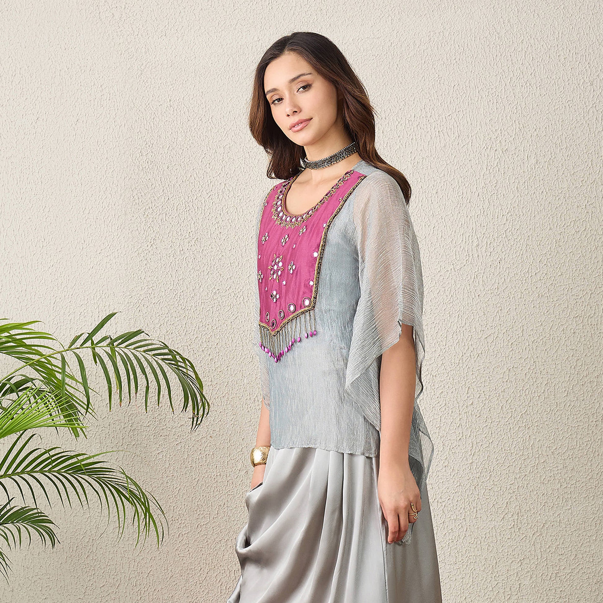 Grey and Purple Hand Embroidered Kaftan Top
