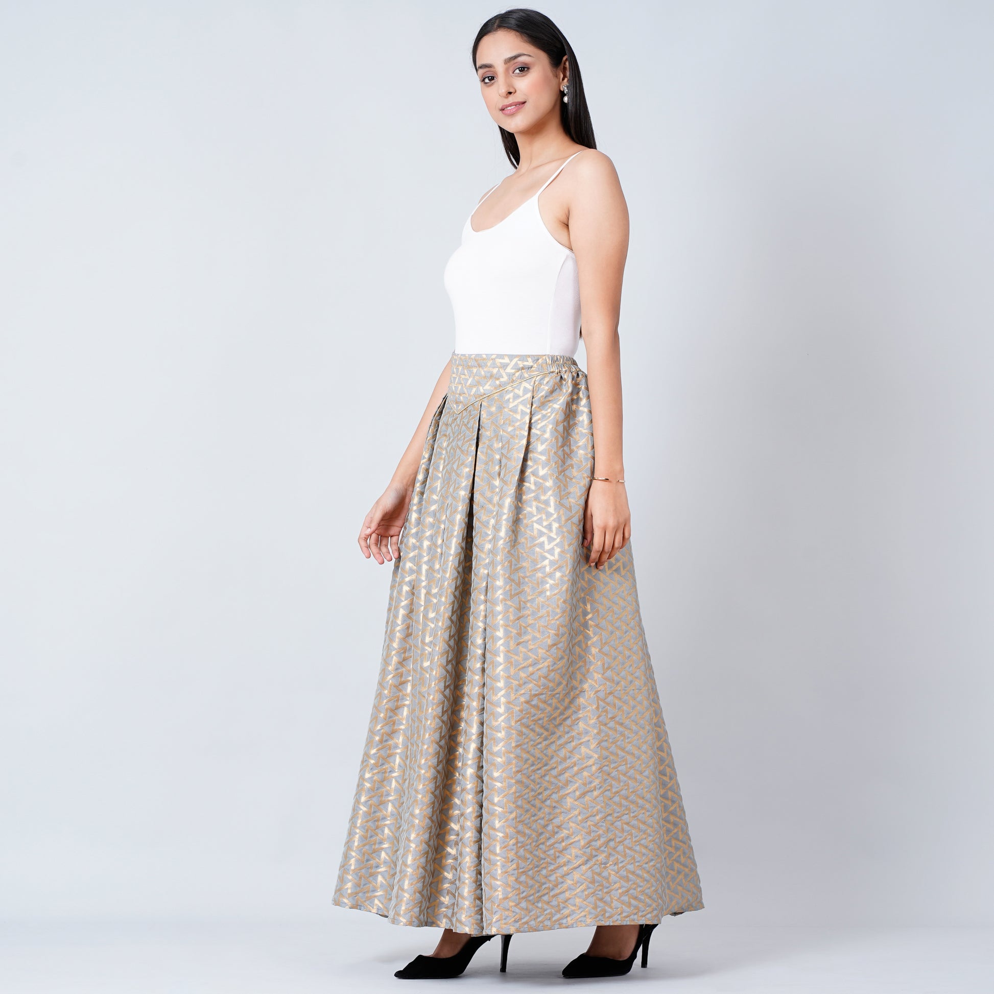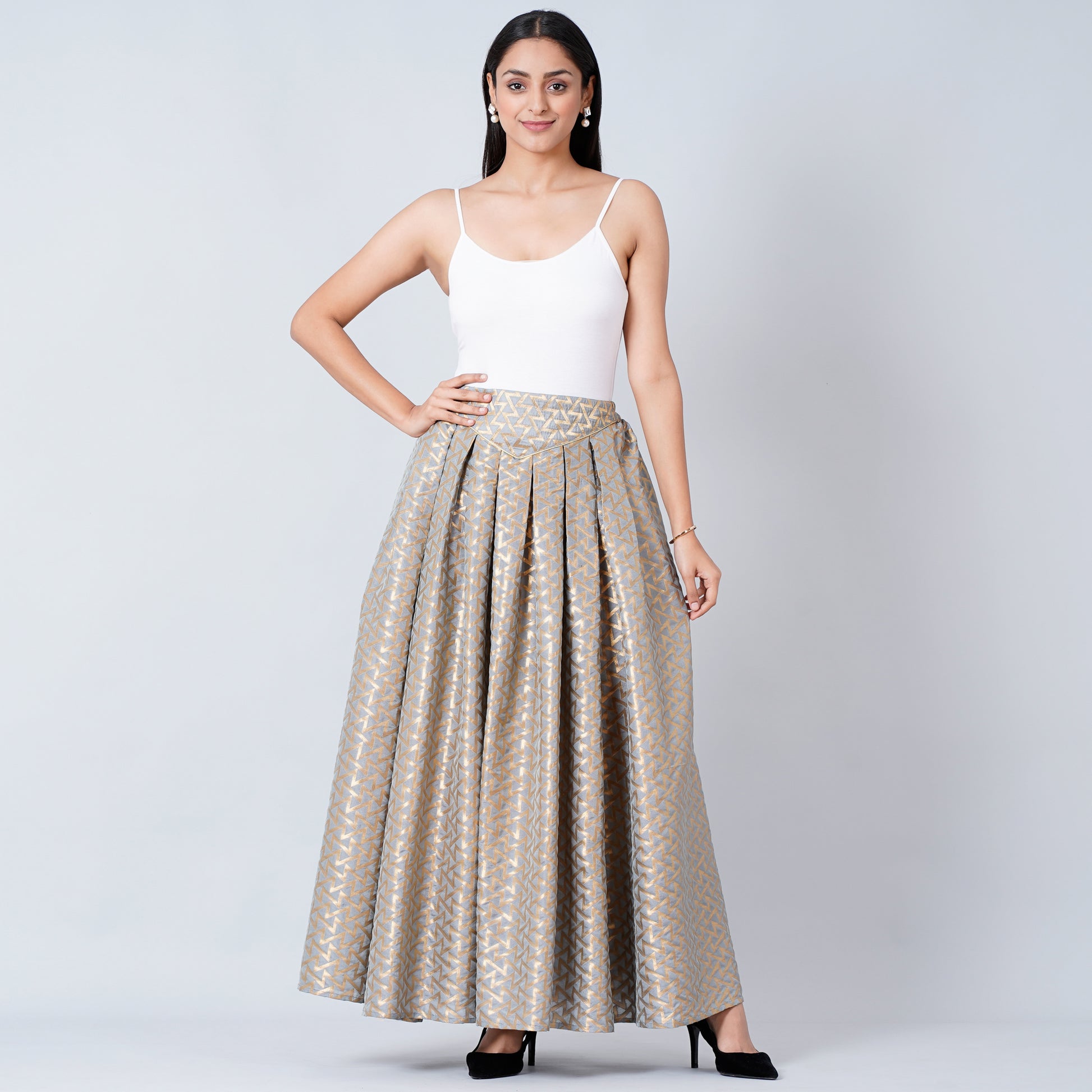 Description Add this elegant grey brocade skirt made in traditional weaved delicate motifs. It has a full flare pattern and you can team it up with a blouse for a perfect Indo-Western look.