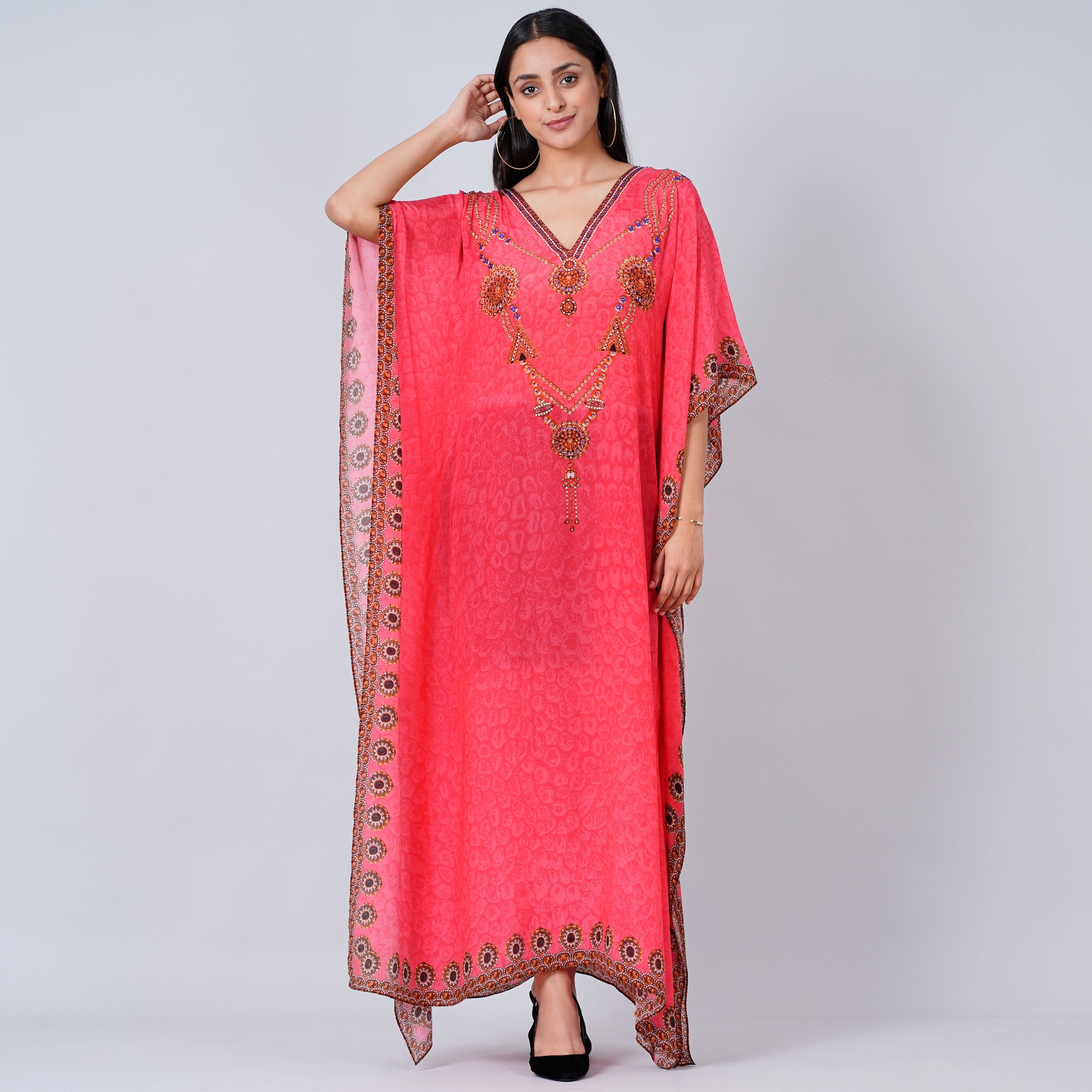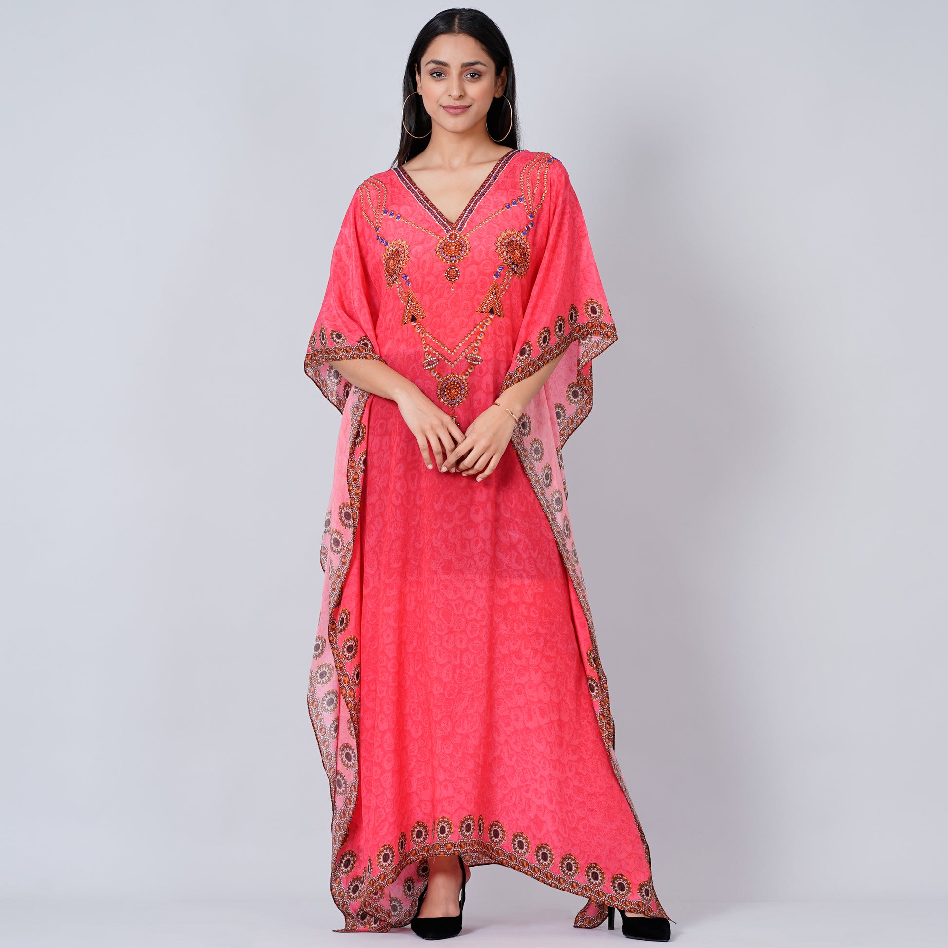 Description Pearl full length kaftan in vibrant jewel tones enhanced with ornamental crystal neckline.