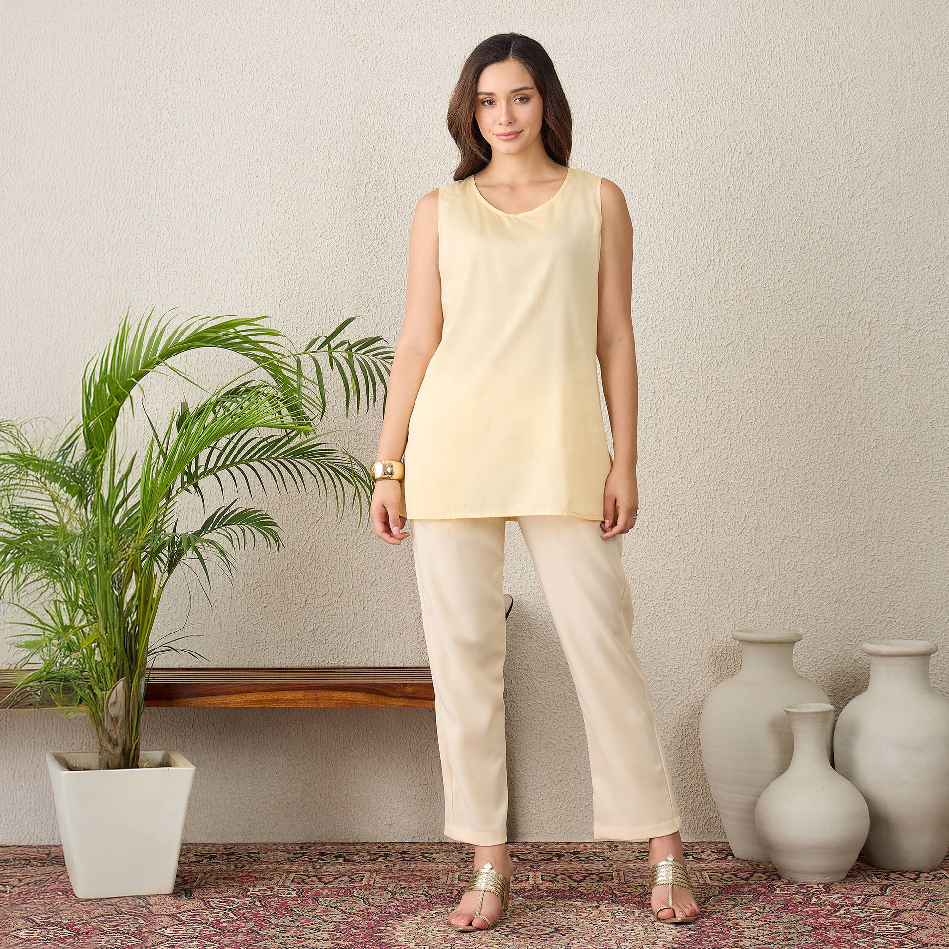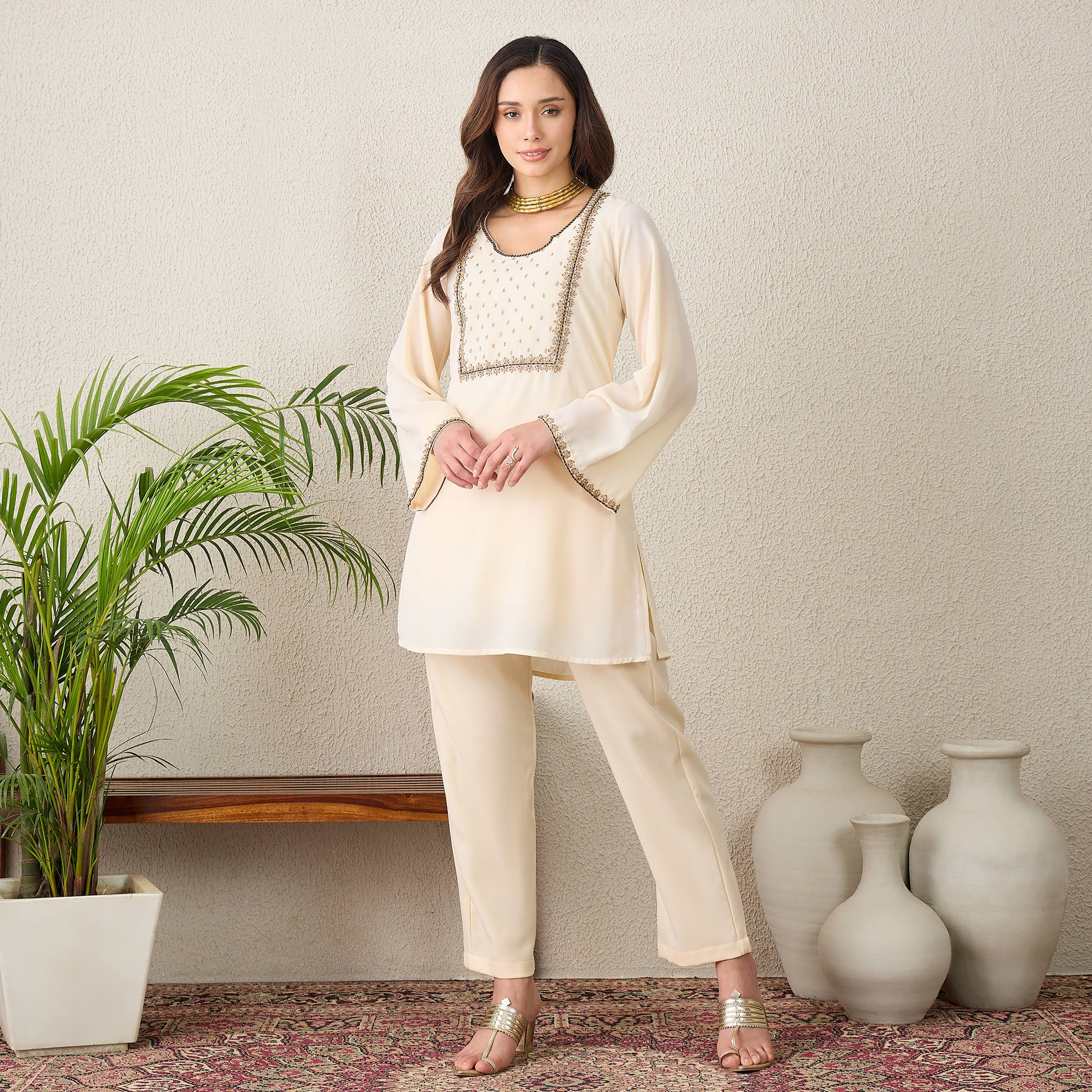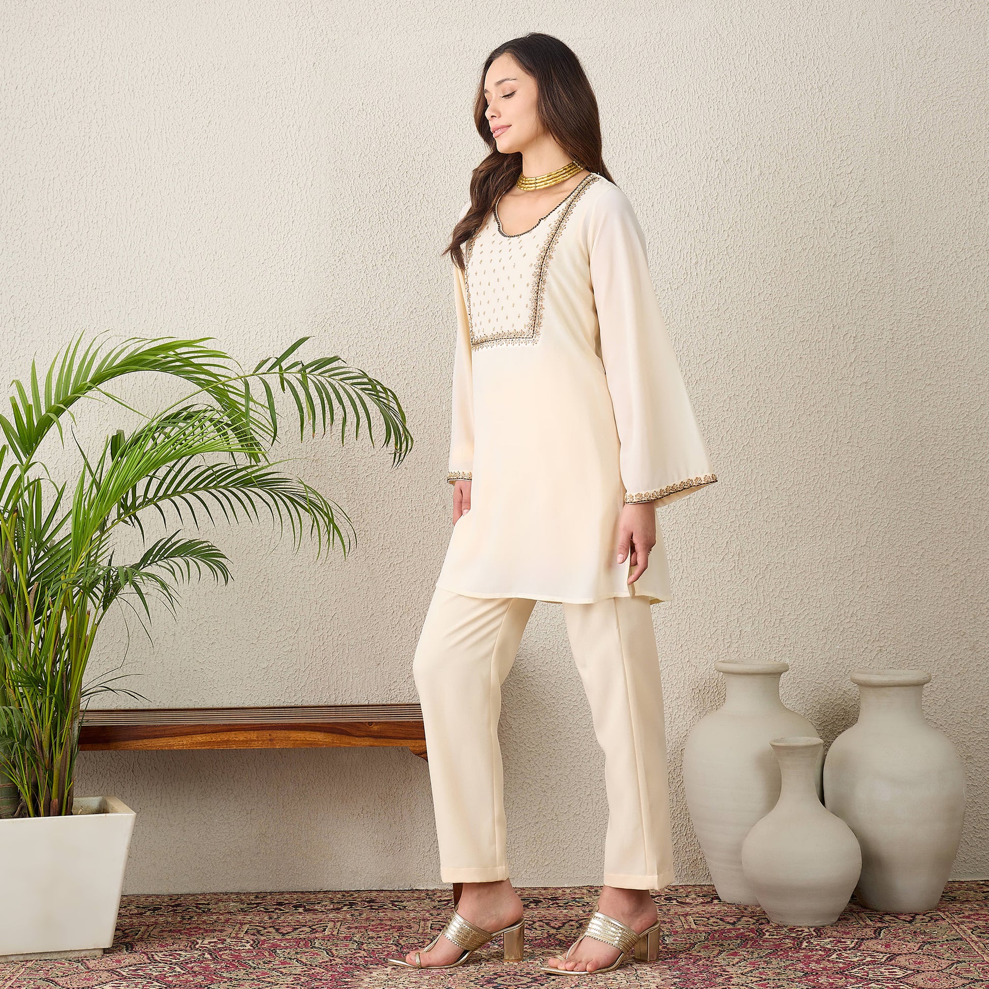 Description Crafted with a focus on delicate craftsmanship, this tunic features a beautifully structured yoke adorned with tonal hand-embroidery and beadwork. The flared sleeves are finished with matching embroidered borders, paired perfectly with sleek, straight-fit trousers for a streamlined silhouette.