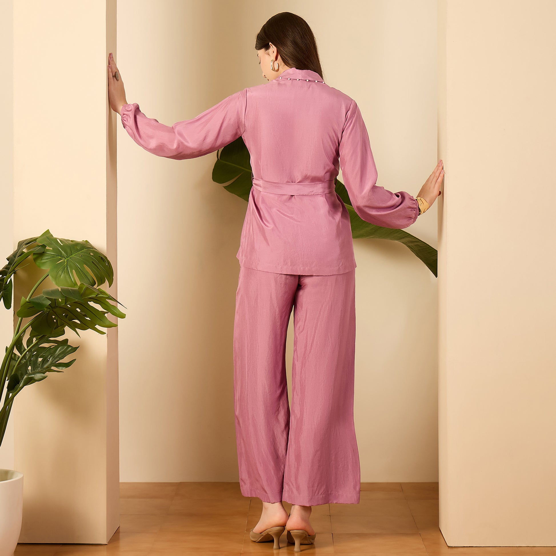 Description Featuring delicate front pleats and a relaxed drawstring waist, this soft, flowing ensemble blends comfort with refined details. Its elegant silhouette makes it suitable for both casual outings and dressier occasions.