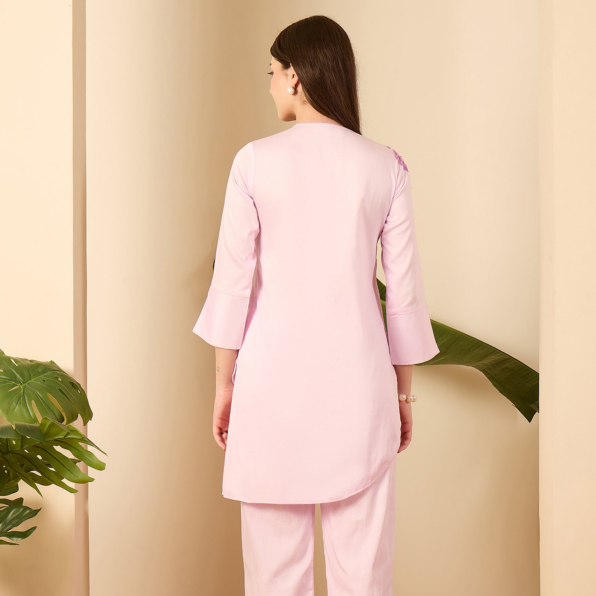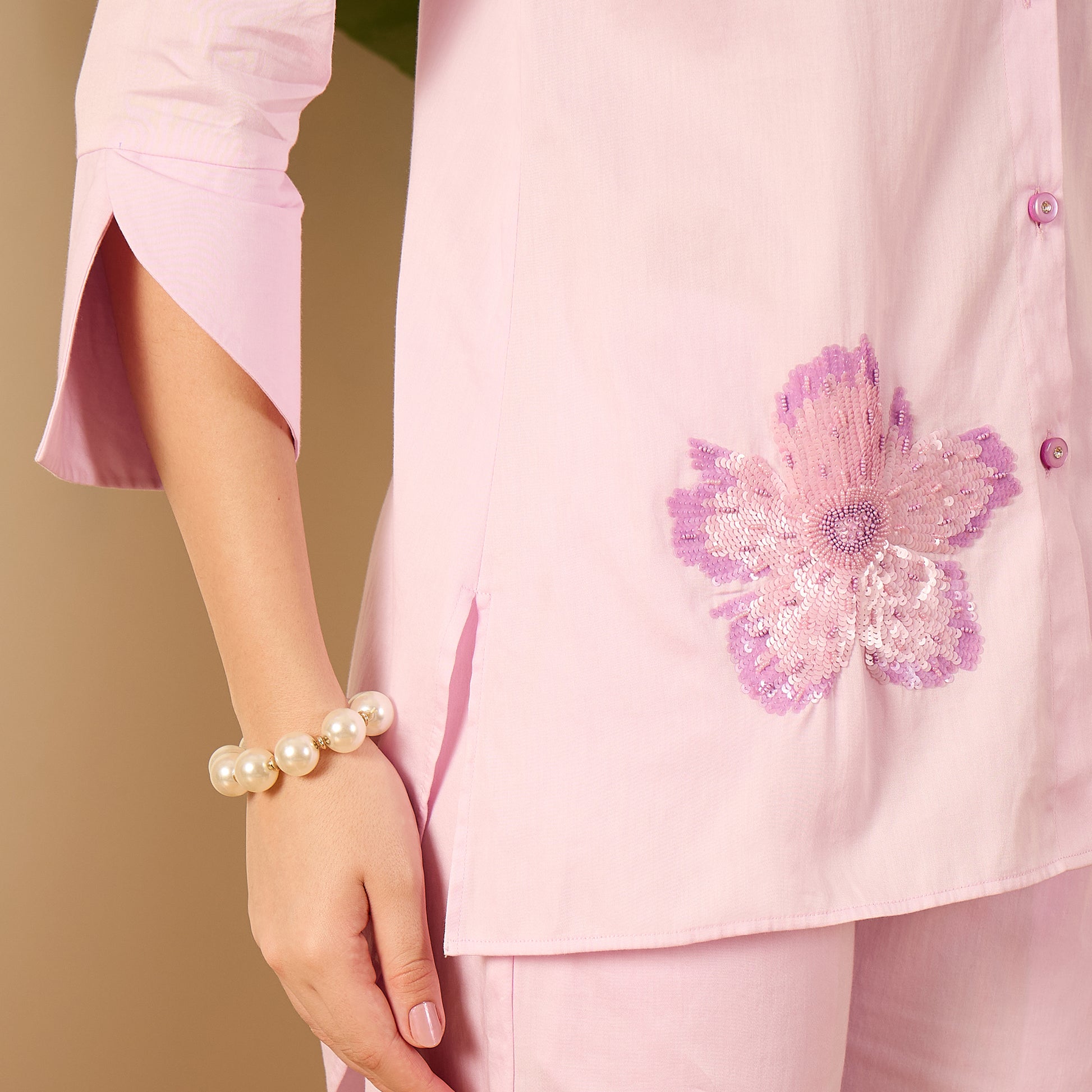 Description This beautifully hand-embroidered shirt features delicate floral motifs highlighted with subtle sequins for a hint of shimmer. Designed with a round neckline and 3/4th sleeves, it includes space tucks on the front for added texture and shape. The button-down front adds a classic touch to its comfortable, easy-to-wear silhouette.