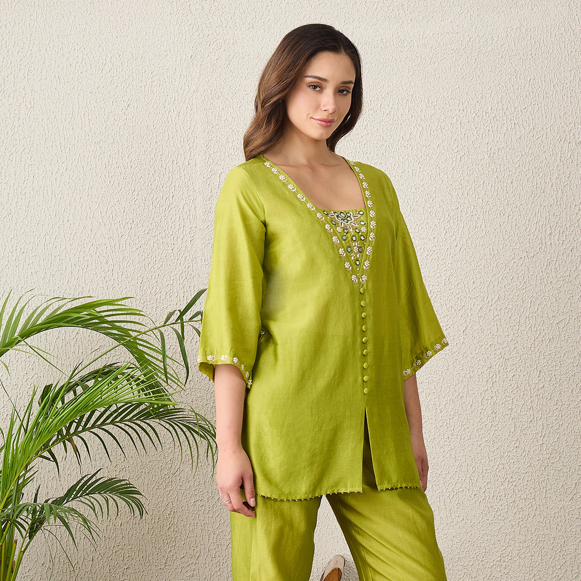 Description This contemporary top features a structured button-down front and an embroidered inner yoke. The design is elevated by delicate mirrorwork and floral hand-embroidery along the V-neckline and wide sleeves, blending traditional artistry with modern tailoring.