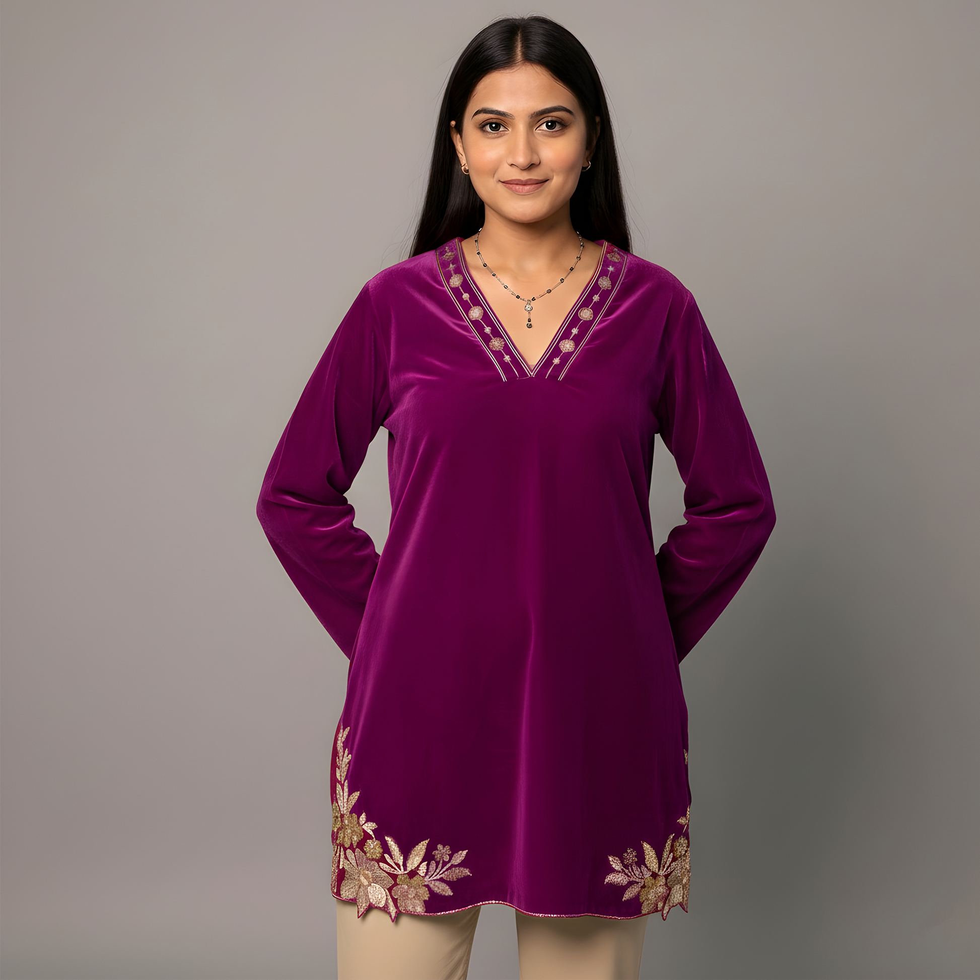 Description This kurta is crafted in a soft, fluid fabric that drapes effortlessly for a relaxed yet refined look. It features a clean V-neckline highlighted with delicate embellishment, while subtle floral embroidery along the hem adds an elegant finishing touch, making it ideal for festive and elevated daywear.