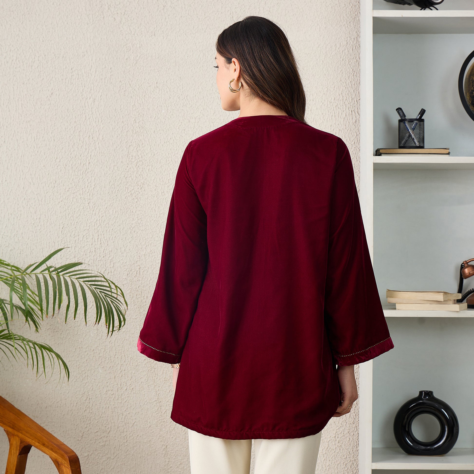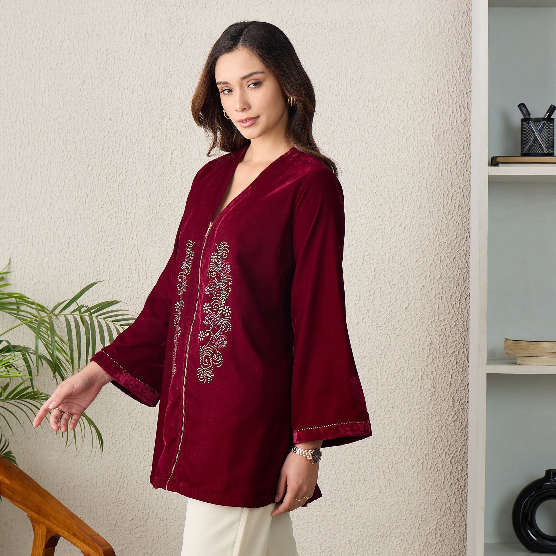 Maroon Jacket with Front Embellishments Velvet Top