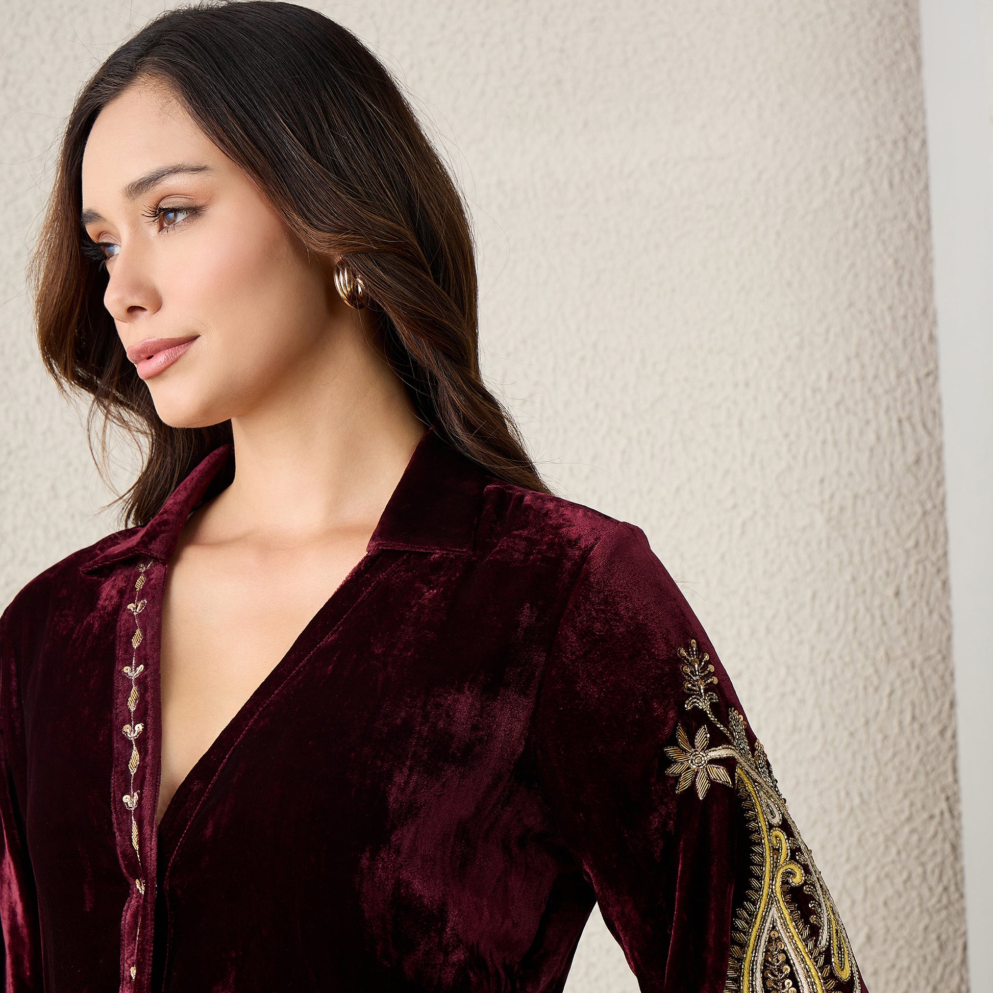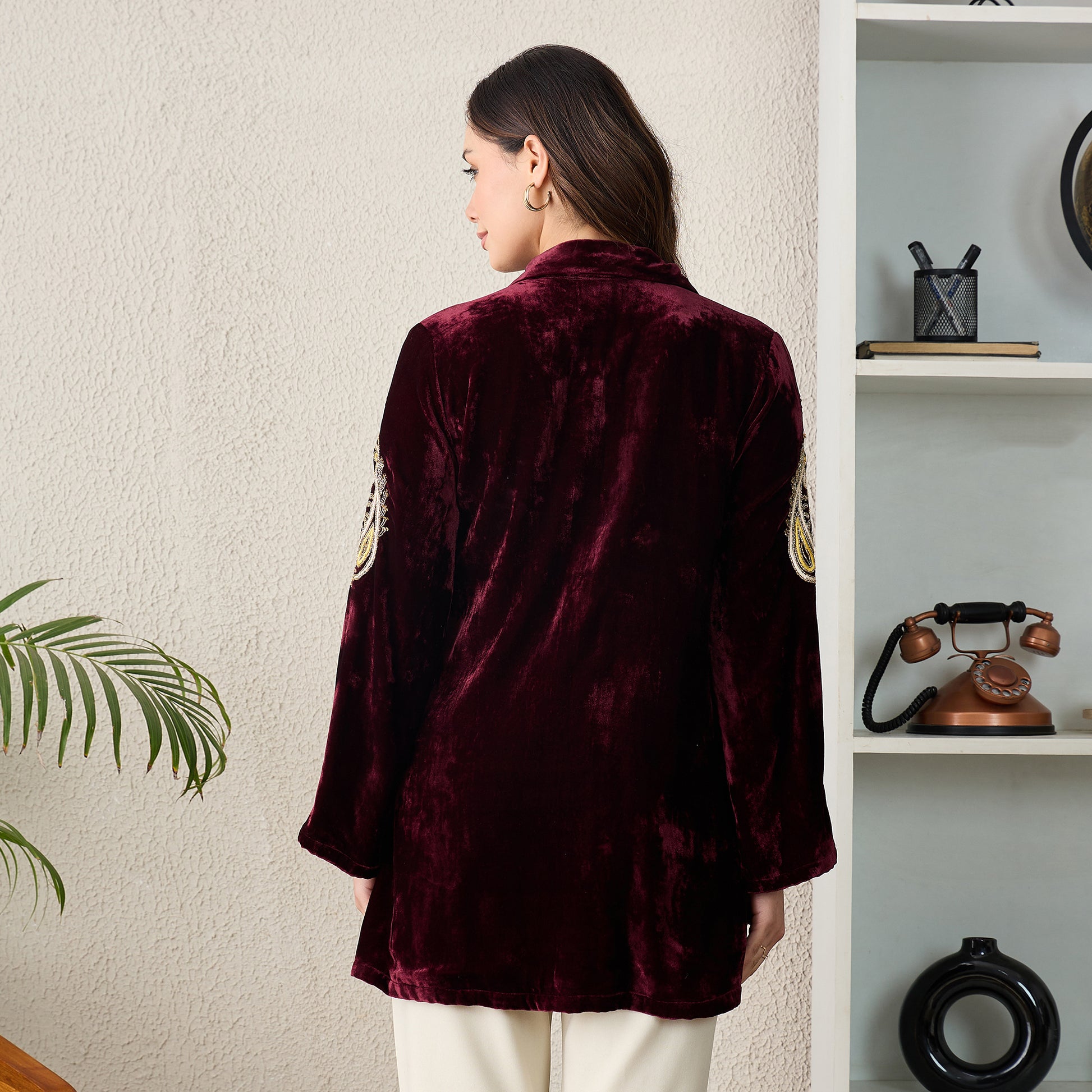 Description This velvet jacket features intricate paisley hand embroidery along the sleeves and front placket, enhanced by a soft textured finish. Designed with a relaxed silhouette, full sleeves, and a refined neckline, it blends traditional craftsmanship with contemporary tailoring for a statement layer that feels elegant and timeless.