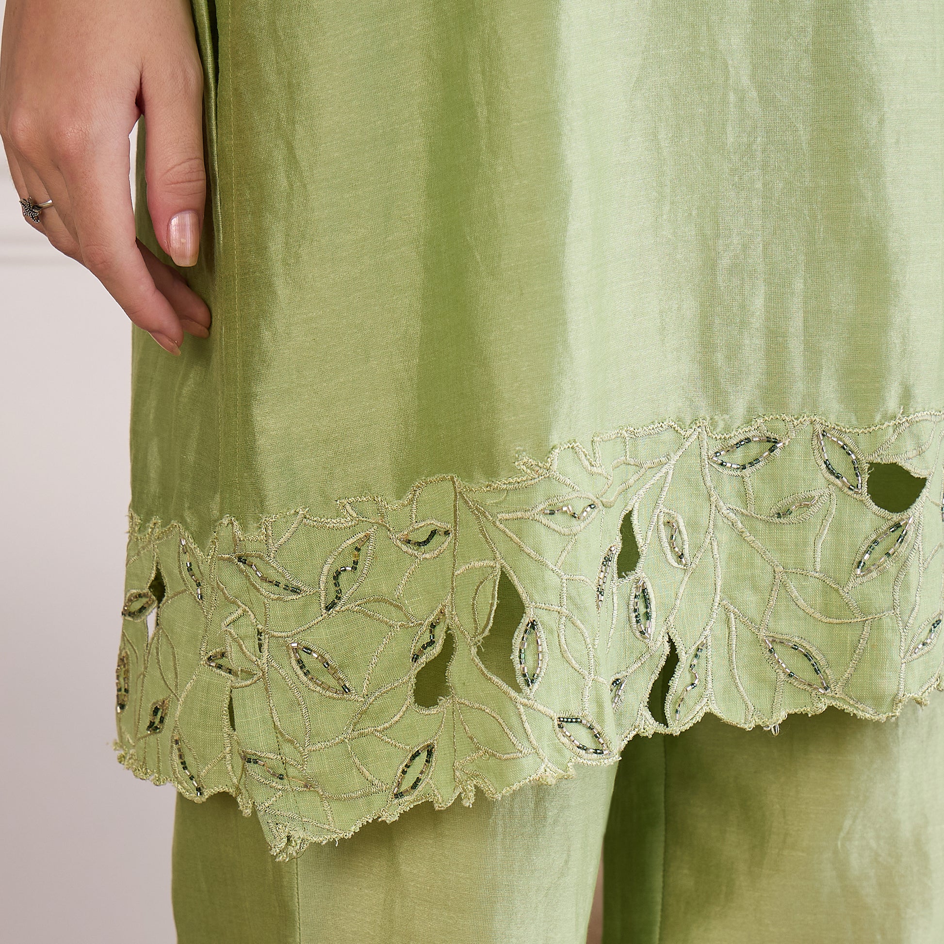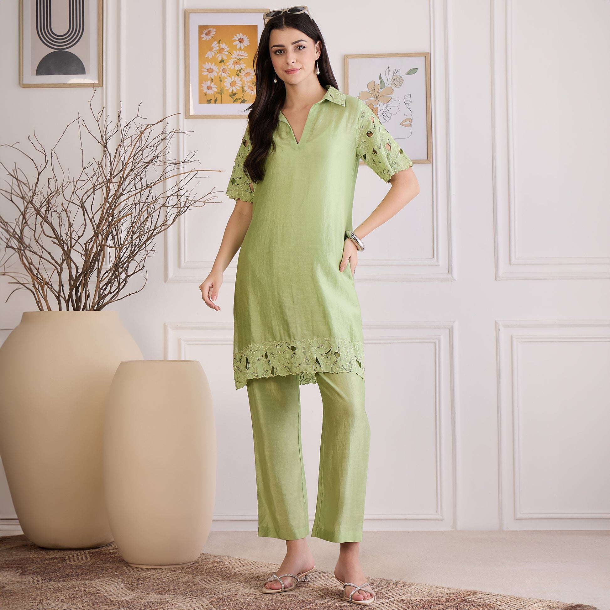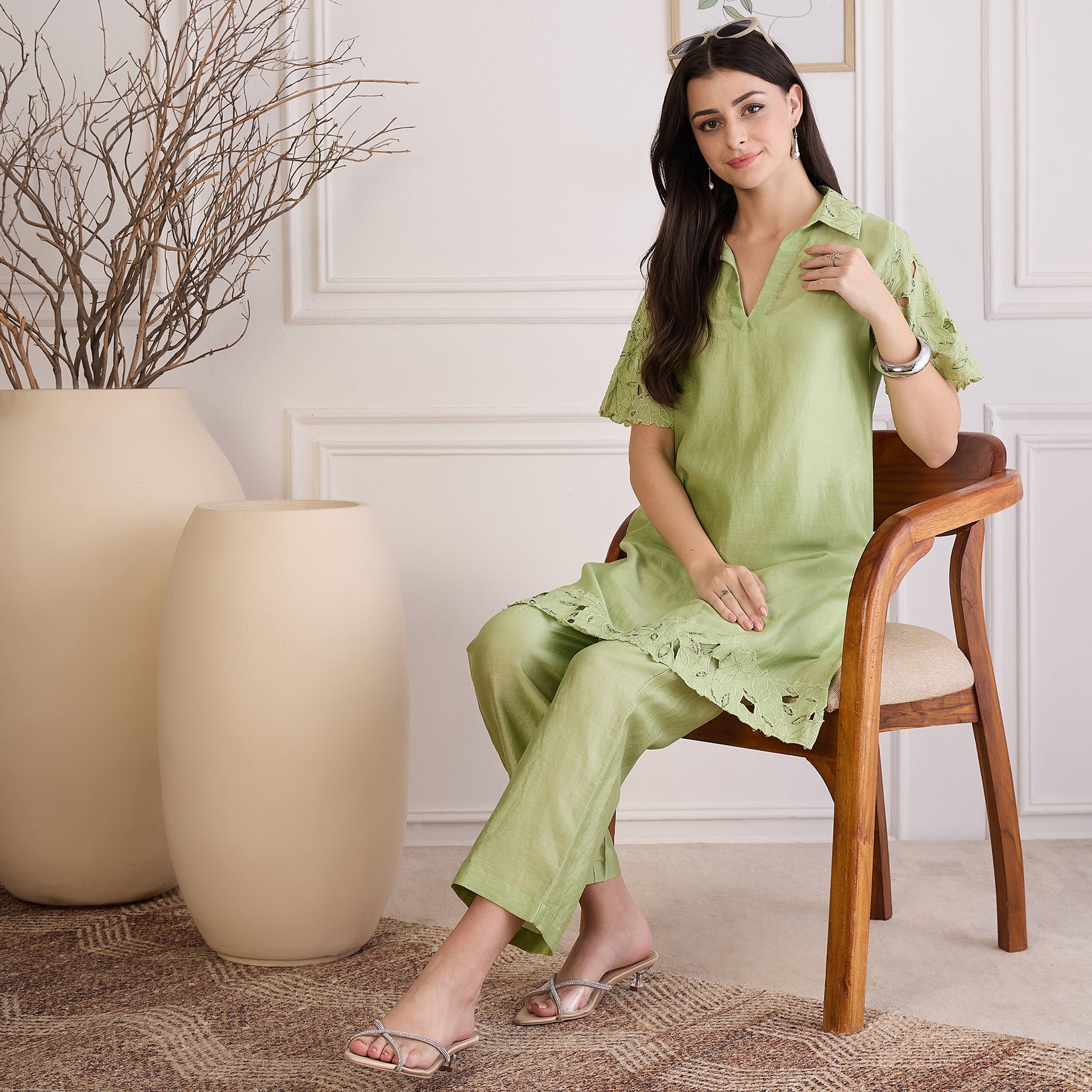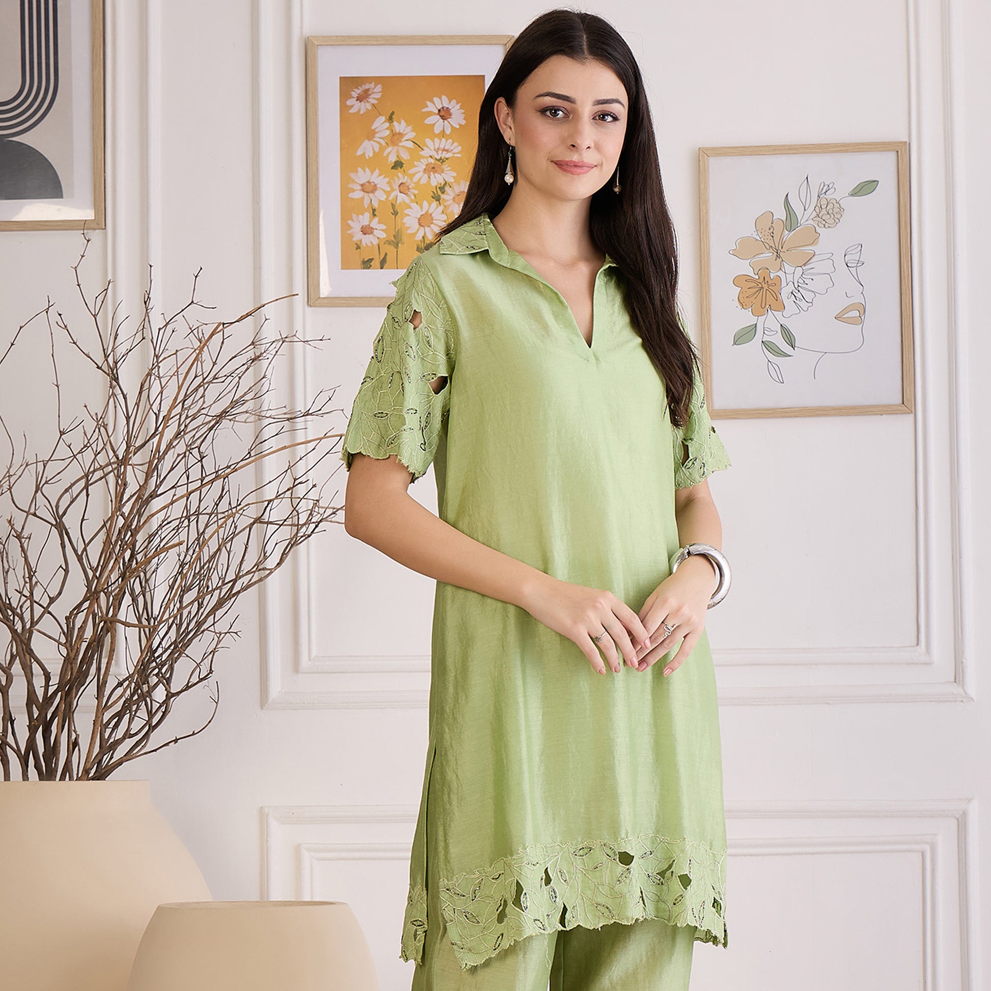 Style Guide Pair this statement top with tailored trousers or a sleek skirt to highlight the intricate cutwork details. Keep accessories understated—choose small studs or a thin bracelet—to complement the beadwork without overpowering it. Finish with classic heels or embellished flats and a structured handbag. For hair, opt for soft waves or a neat bun, paired with glowing makeup to enhance the top’s delicate elegance.