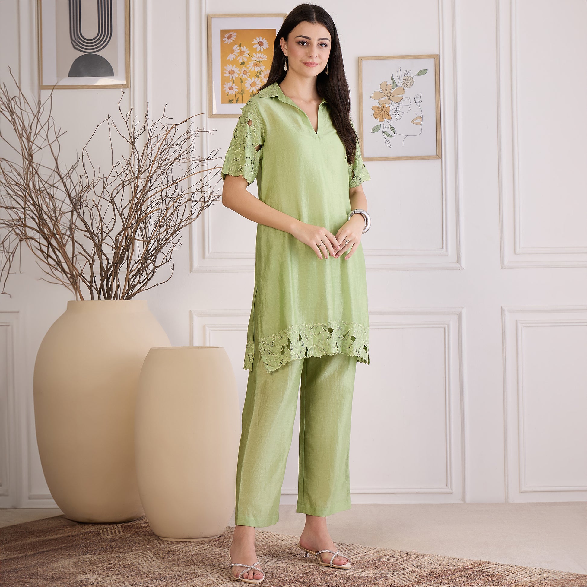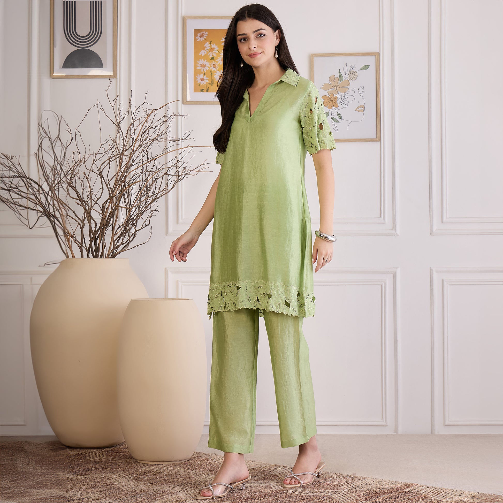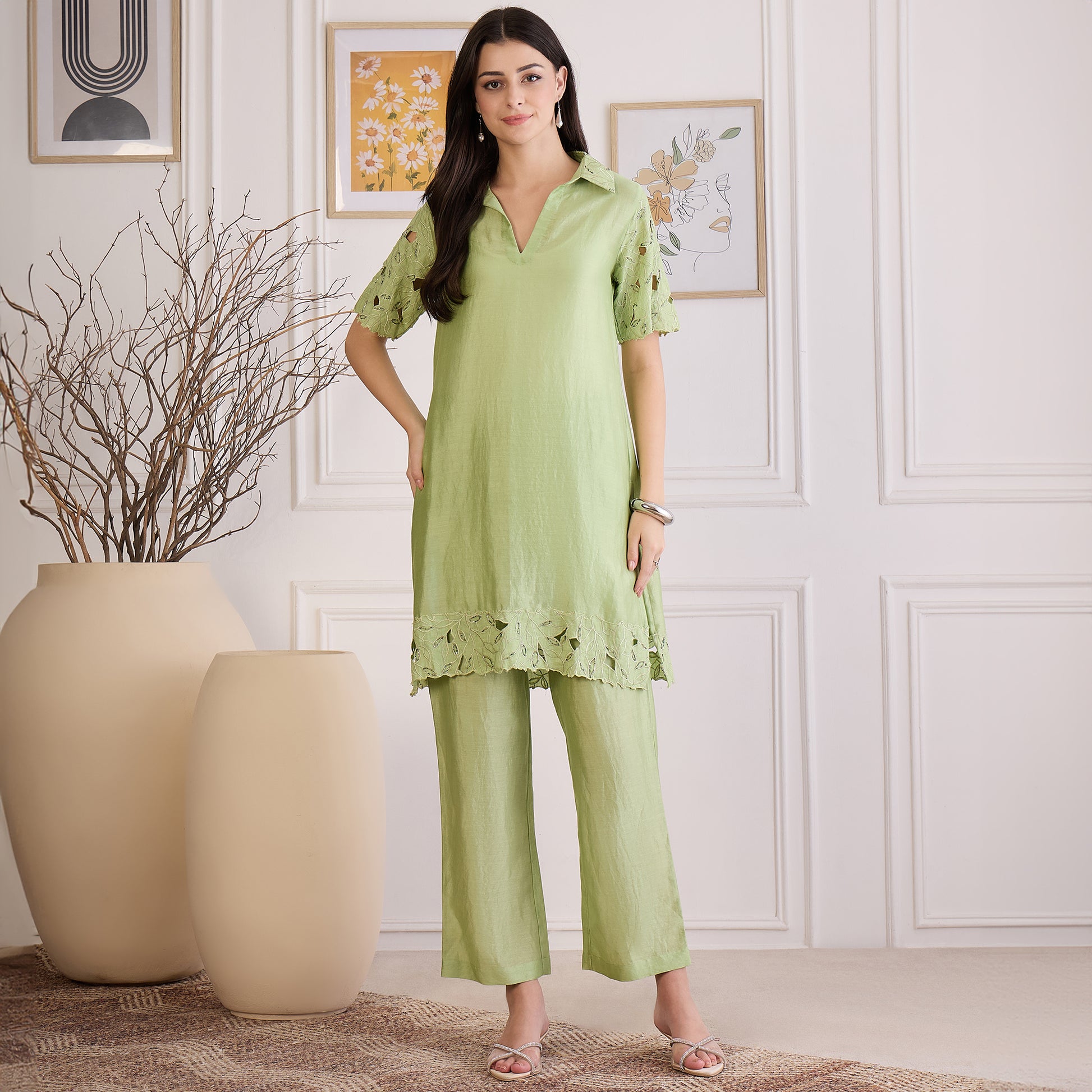 Style Guide Pair this detailed set with minimal jewelry—simple studs or a thin bracelet—to keep the focus on the beadwork and cutwork. Complete the look with classic heels or embellished flats and a structured clutch. Style your hair in loose waves or a neat bun, and opt for soft, natural makeup to enhance the set’s delicate elegance.