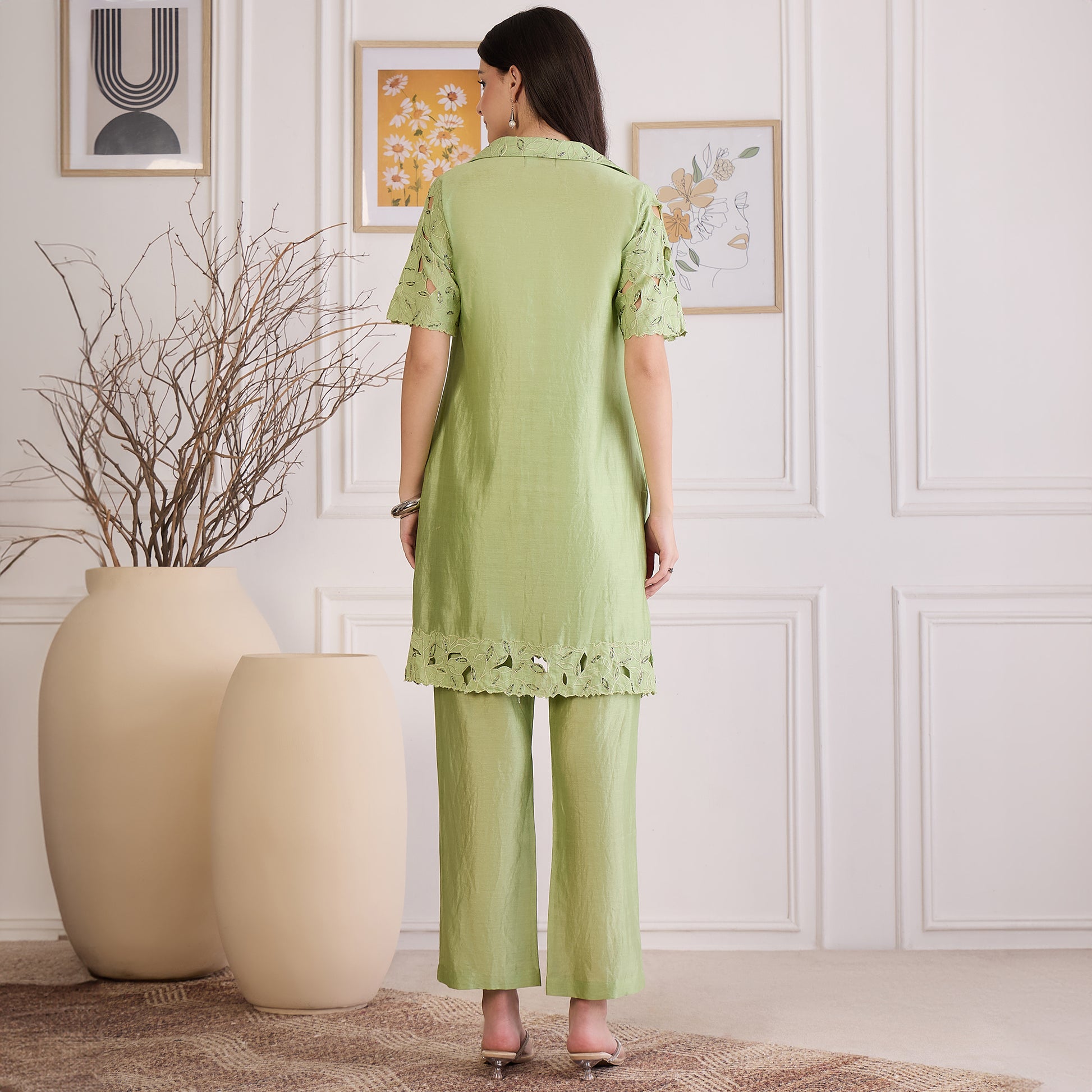 Description Make a graceful statement with this cutwork co-ord set featuring intricate cutwork and delicate bead detailing on the short sleeves and lower panel. The matching top and trousers create a harmonious and elegant ensemble, blending airy textures with refined embellishments for a sophisticated look ideal for festive and formal occasions.