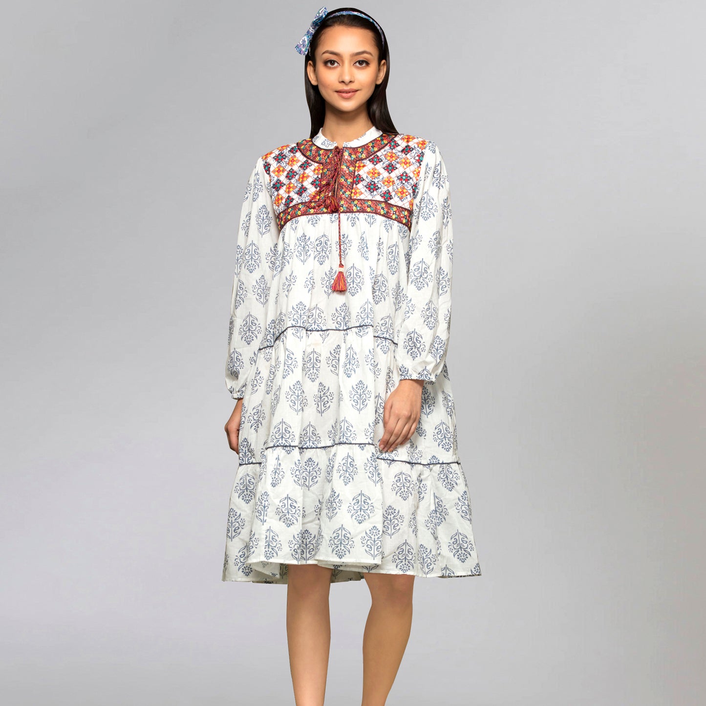 Description Add this ruffle dress embroidered with mirror work and eye-catching tassels at the neck. It is perfect to make that statement look in front of your guests.