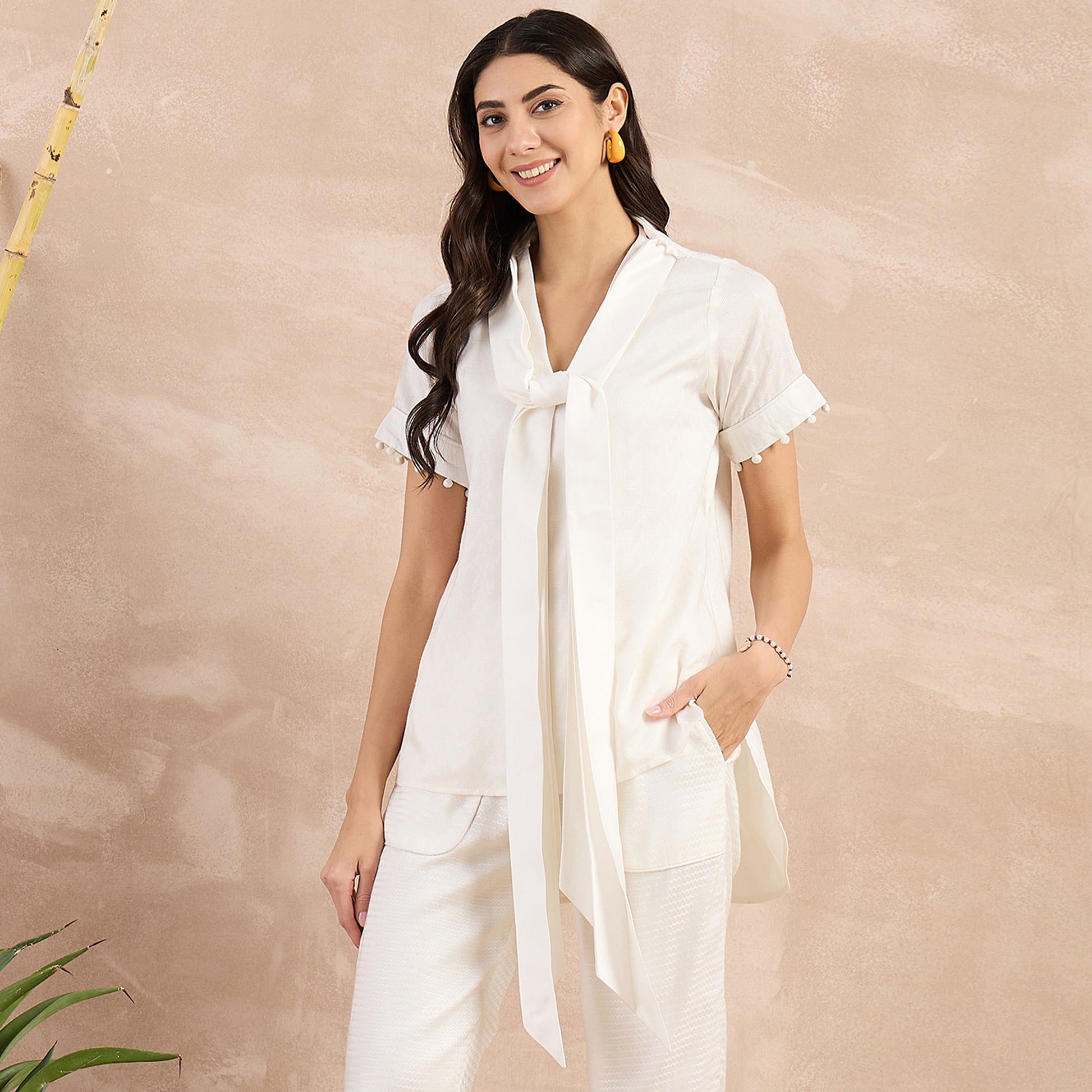 Style Guide You can tuck this top into high-waisted trousers and layer with a structured blazer, cinching the belt for a tailored silhouette. Transition seamlessly to evening by pairing with a pencil skirt and bold heels, accessorising with metallic accents to highlight the handmade potli details. Embrace its eco-conscious fabric by styling with natural textures like woven accessories or leather accents, ensuring every outfit reflects your sophisticated yet mindful approach to fashion.