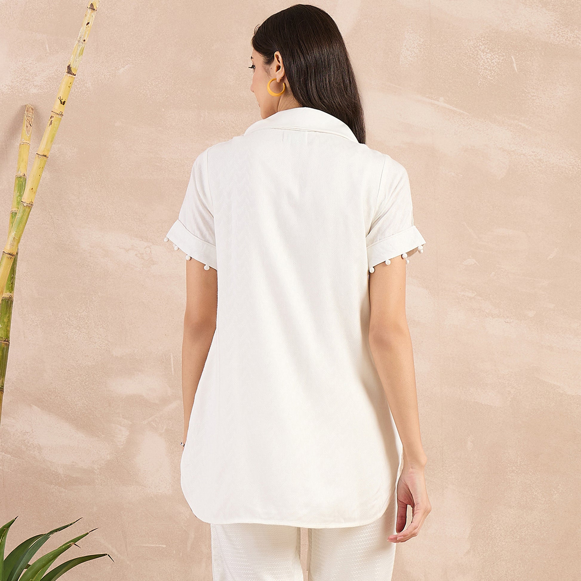 Description Grab our high-low top with belt, crafted from eco-conscious textured herringbone fabric that blends sustainability with softness. This top boasts a unique pleated belt, versatile for styling by inserting it into the shoulder straps. It has delicate short sleeves featuring small handmade potli details, which adds artisanal charm to the elegant silhouette. It is ideal for effortless day-to-evening transitions.