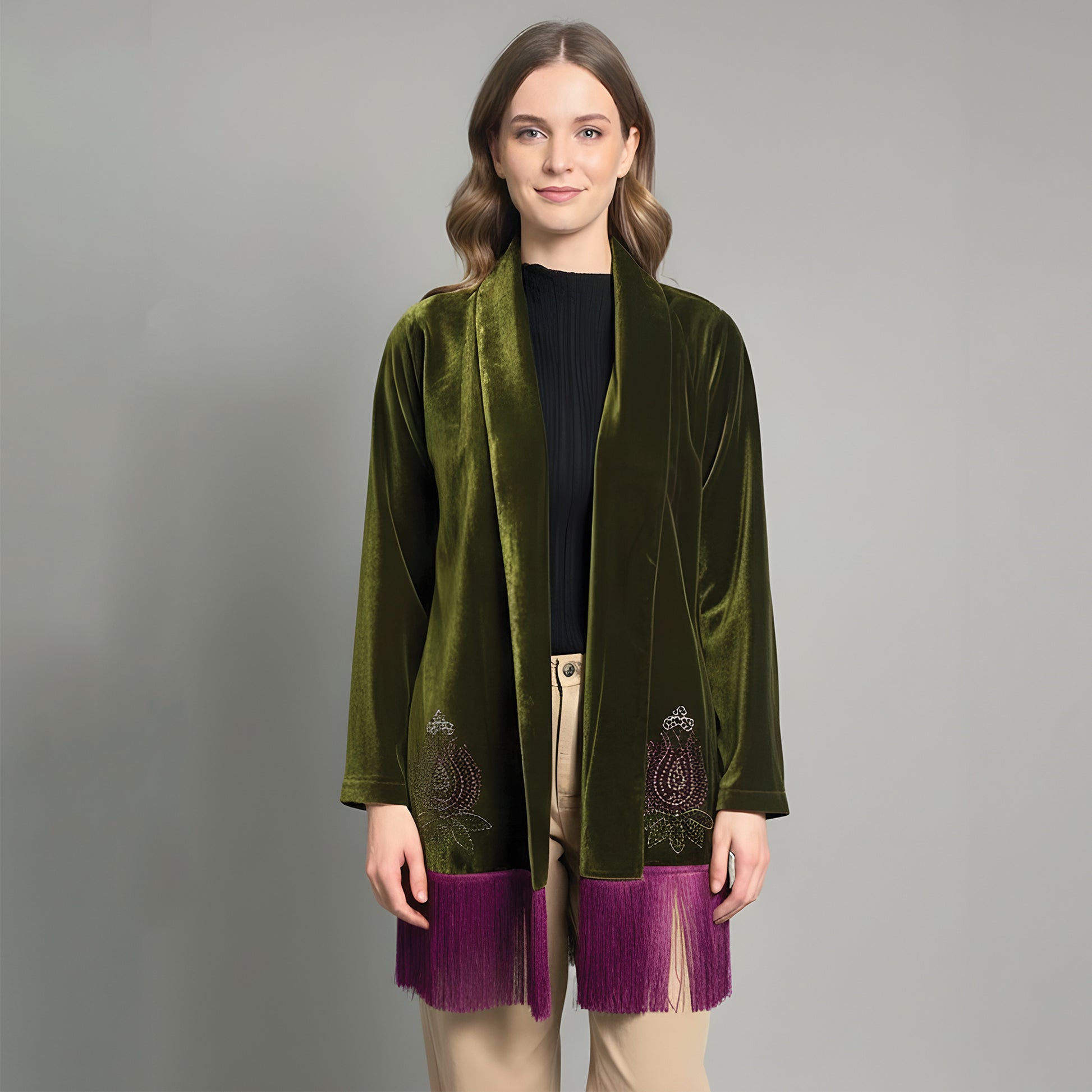 Olive Green Crystal Embellished Shrug with Magenta Fringes