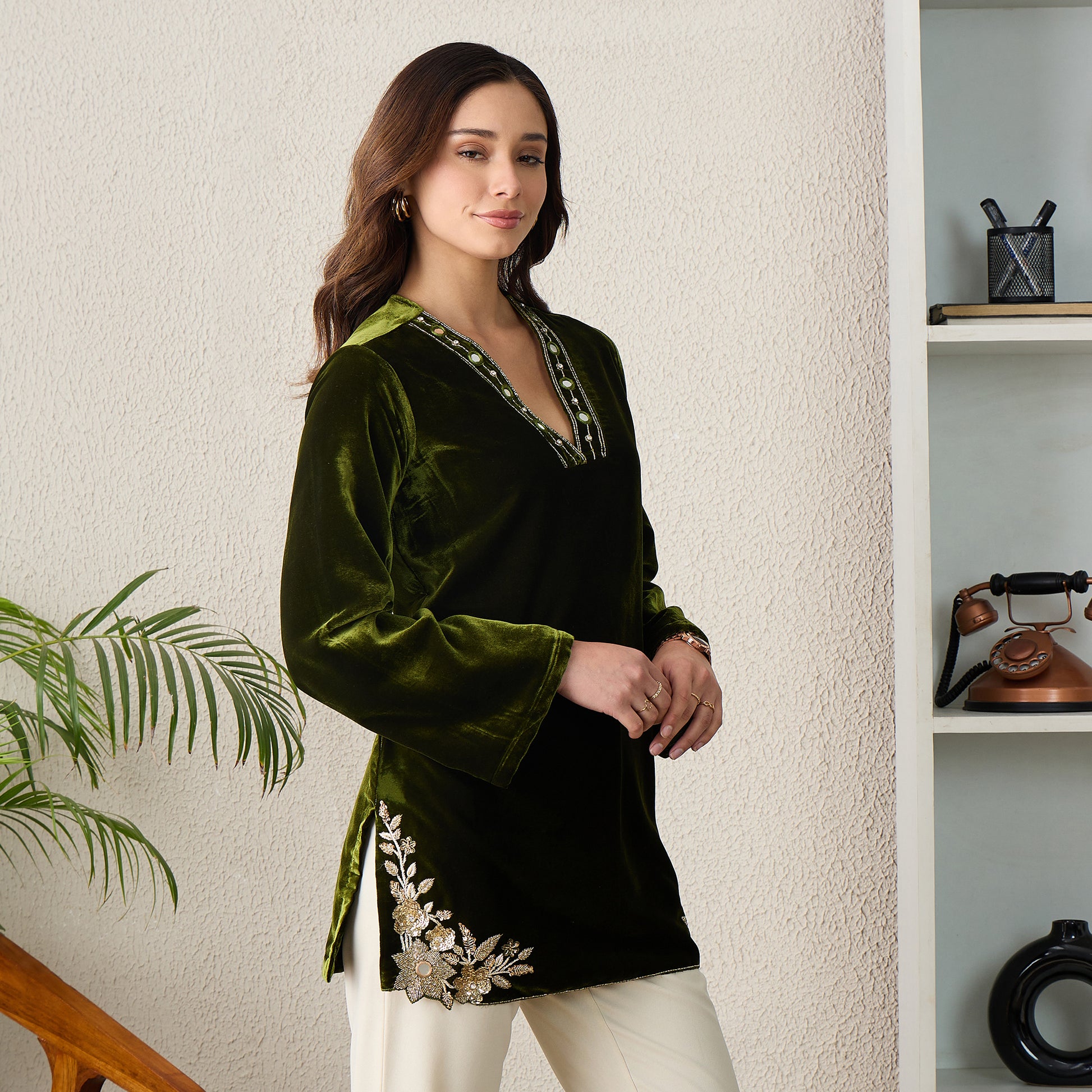 Description This kurta is crafted in a soft, fluid fabric that drapes effortlessly for a relaxed yet refined look. It features a clean V-neckline highlighted with delicate embellishment, while subtle floral embroidery along the hem adds an elegant finishing touch, making it ideal for festive and elevated daywear.