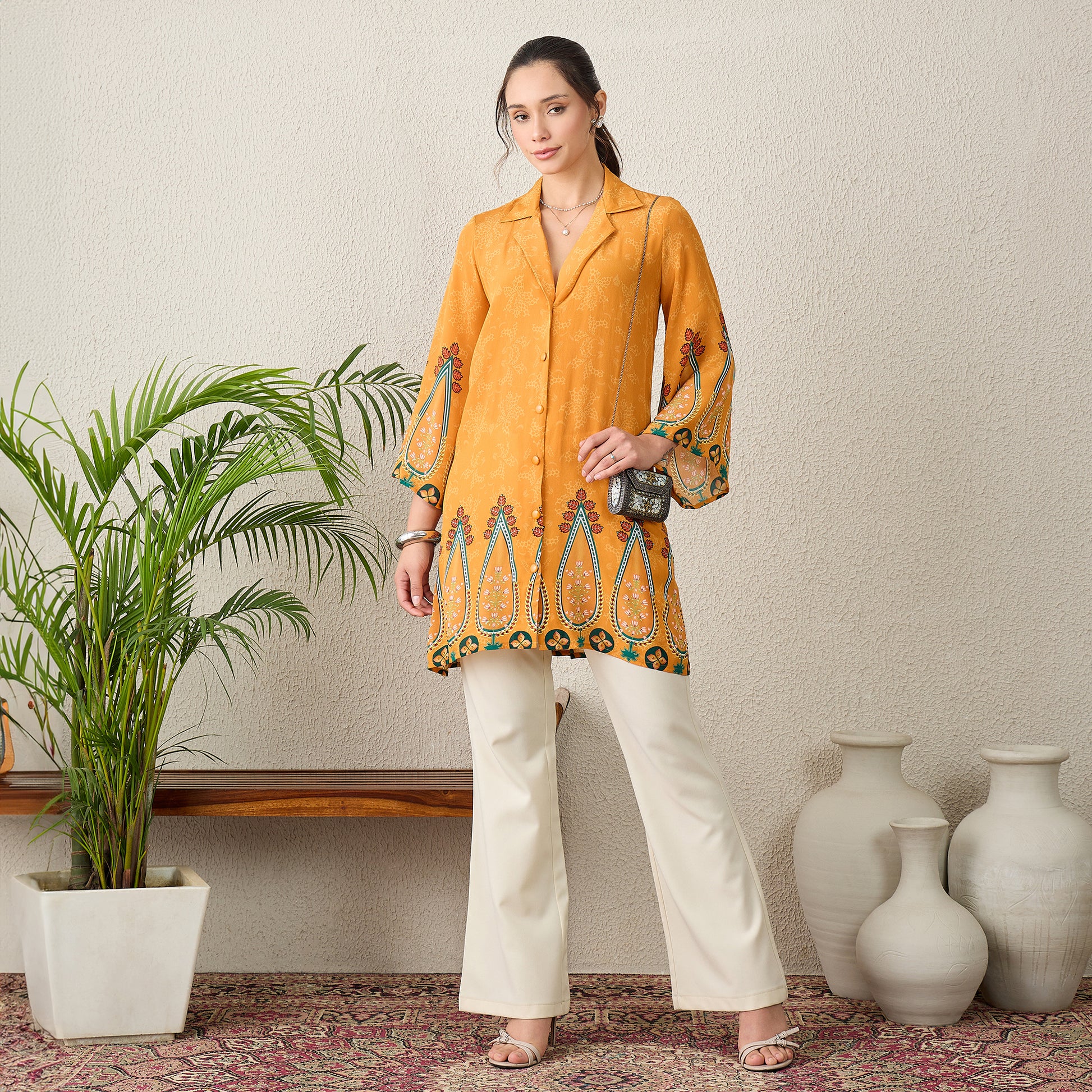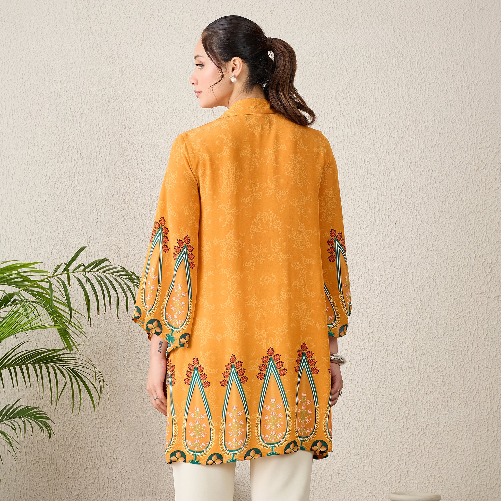 Orange Paisley Printed Crystal Embellished Shirt