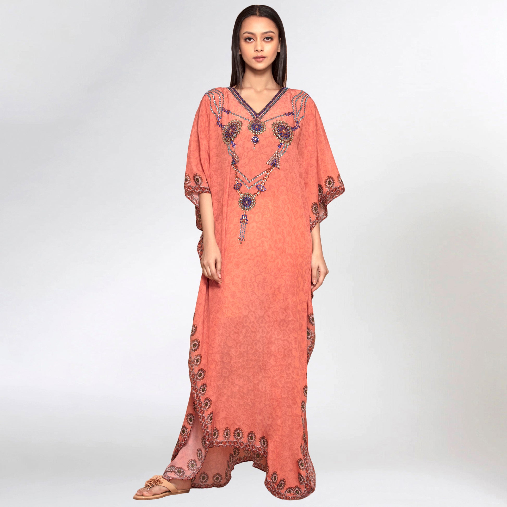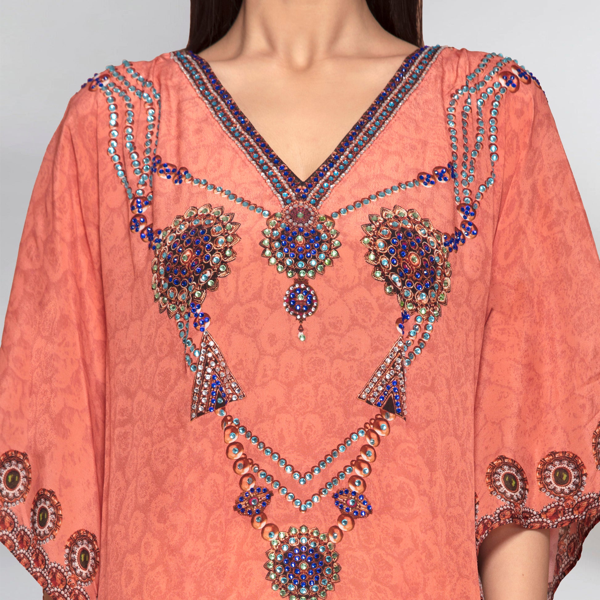 Description Pearl full length kaftan in vibrant jewel tones enhanced with ornamental crystal neckline.