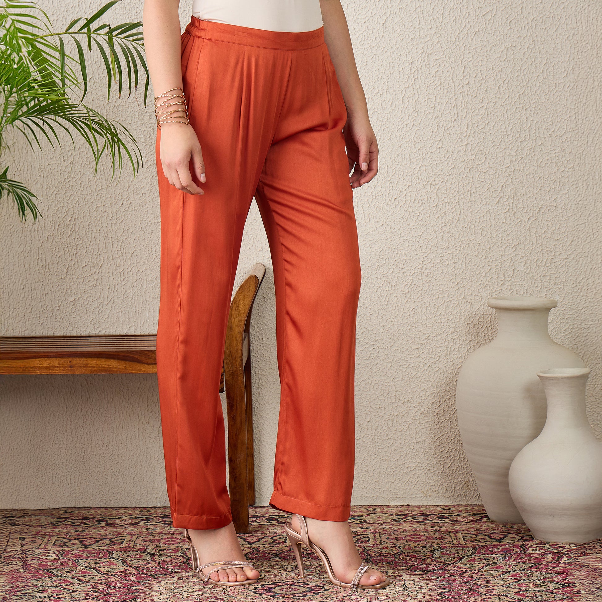 Description These trousers are crafted from a soft, lustrous fabric that offers a subtle sheen and fluid movement. Designed with a high-rise waist and structured front pleats, they feature a tapered leg that provides a clean, tailored finish. This combination of a bold autumnal hue and a refined silhouette makes them a versatile staple for sophisticated day-to-evening dressing.