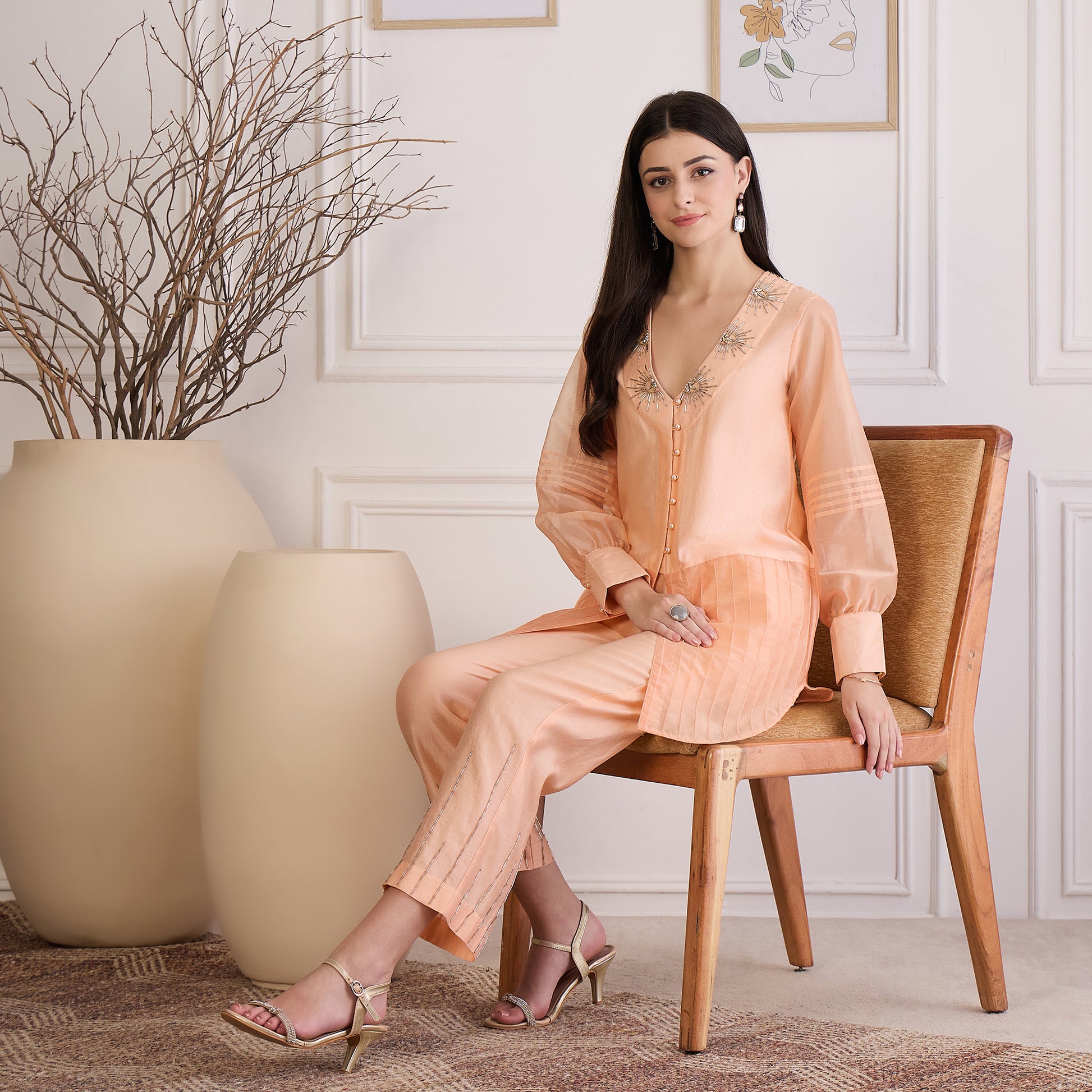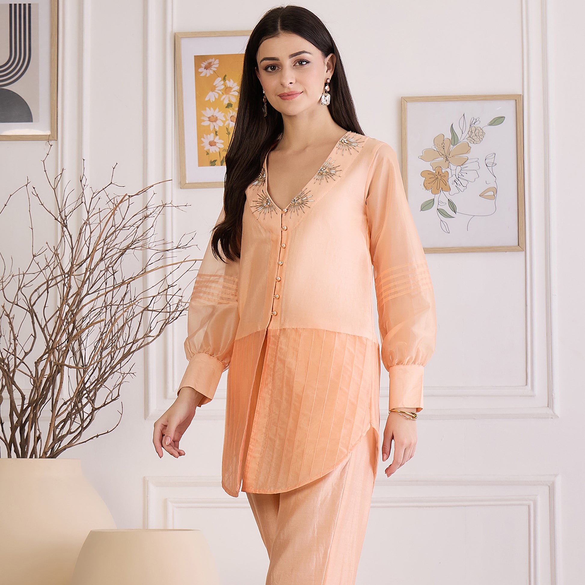 Description Discover refined charm with this top featuring delicate pintuck detailing on the lower panel and organza sleeves. The sheer organza sleeves are enhanced with pintucks, while intricate embroidery on the collar adds a touch of artisanal elegance. This combination of textures creates a graceful and sophisticated silhouette perfect for any occasion.